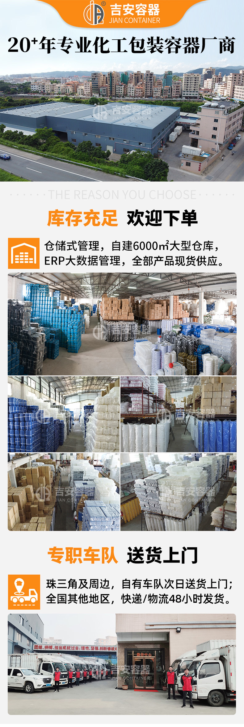 吉安容器承诺:全部产品现货供应、不限数量、送货上门!珠三角及周边地区,由吉安容器组建的货车车队安排专职人员配送,当天下单,次日安排 ;国内其他地区的客户,我们有长期稳定合作的物流单位,款到当天安排出货。