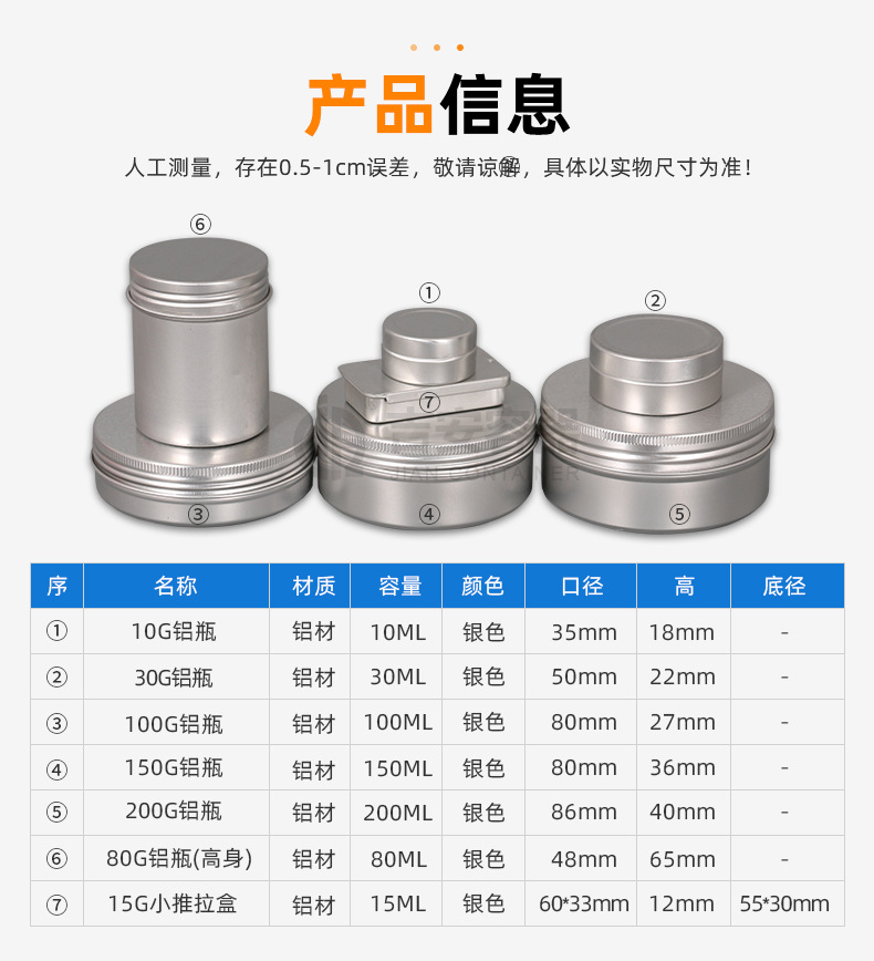 规格 10G铝瓶,30G铝瓶,100G铝瓶,150G铝瓶,200G铝瓶,80G铝瓶(高),15G小推拉盒