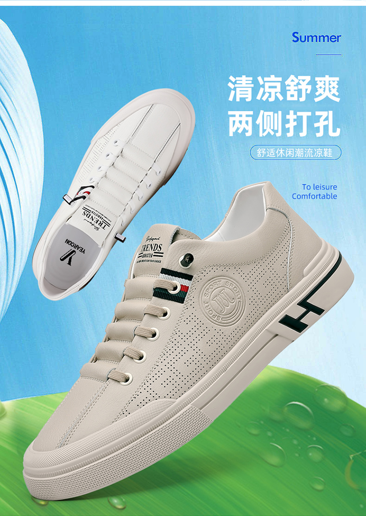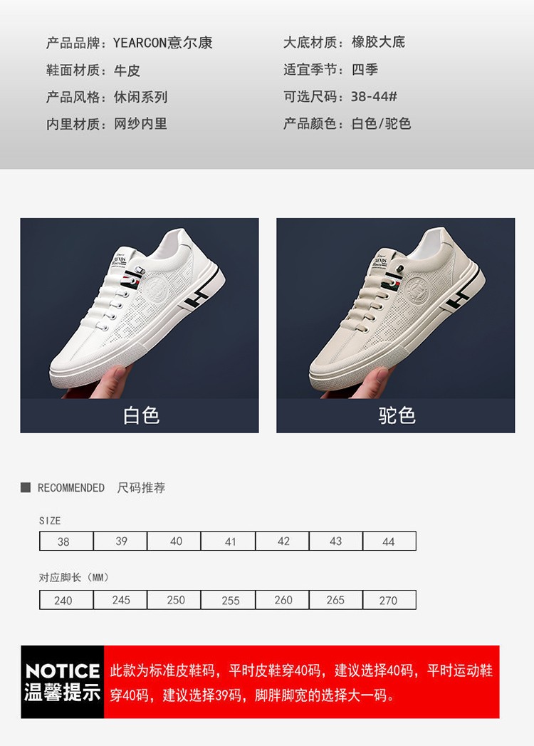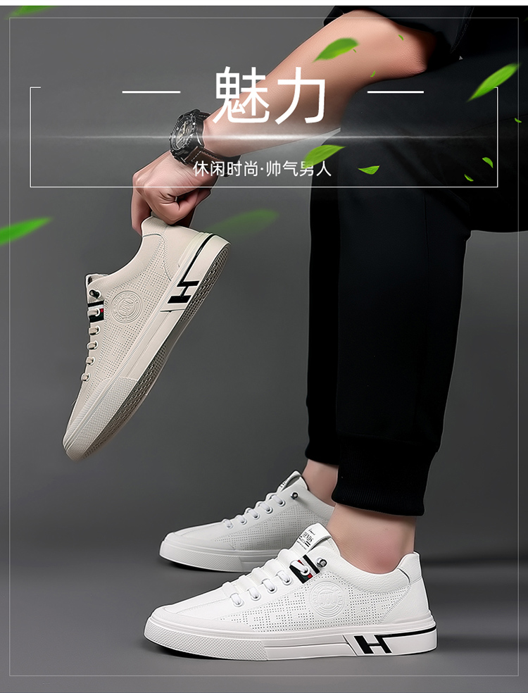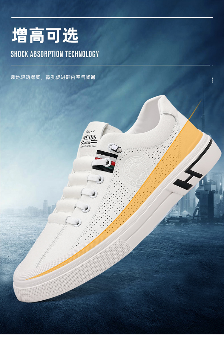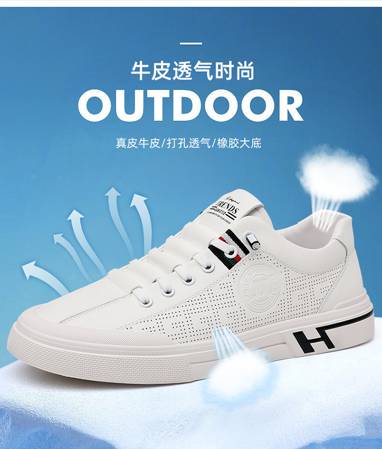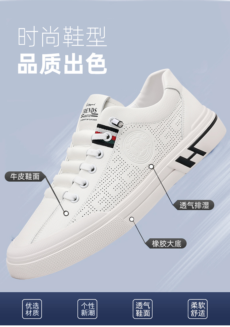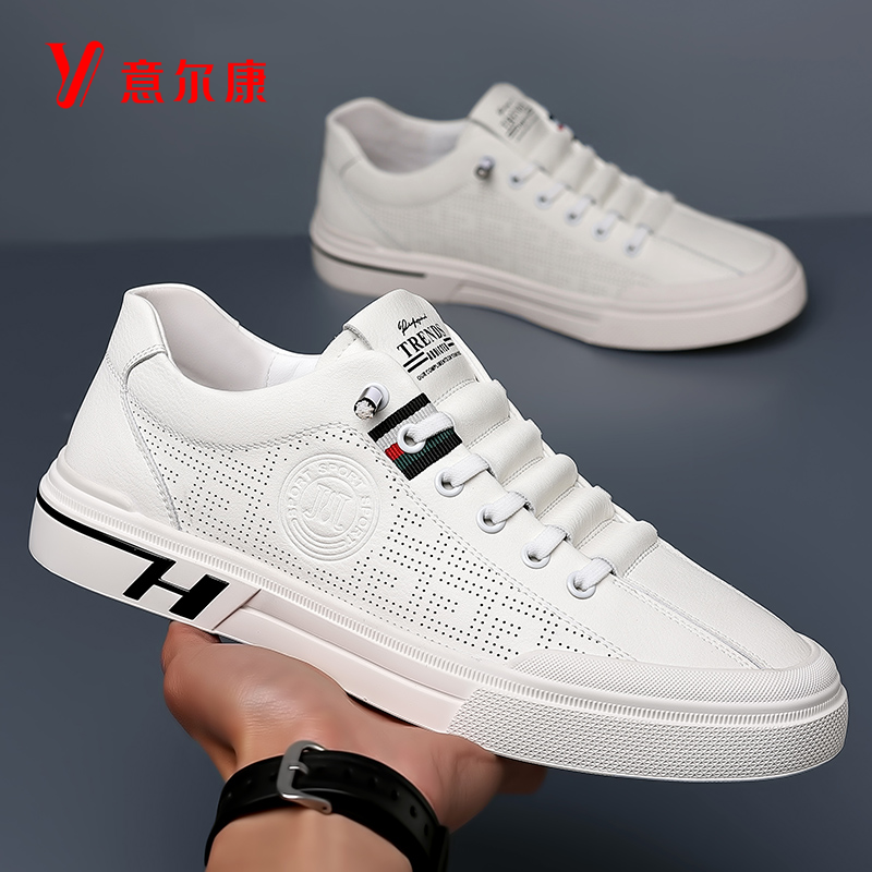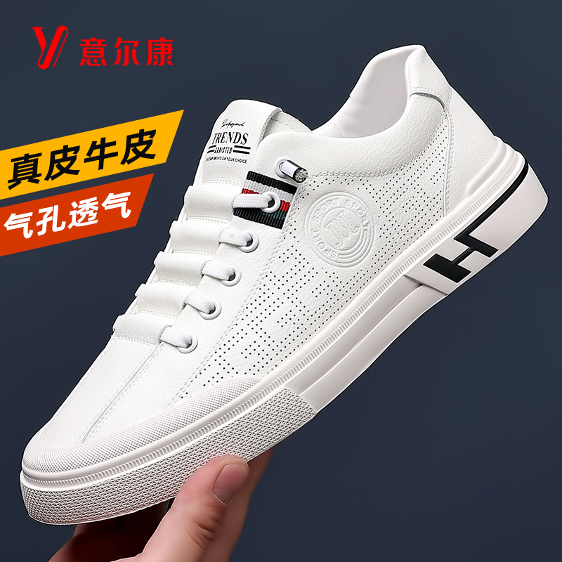 意尓康男鞋2023夏季鏤空男士休閒板鞋真皮軟底透氣內增高小白鞋男