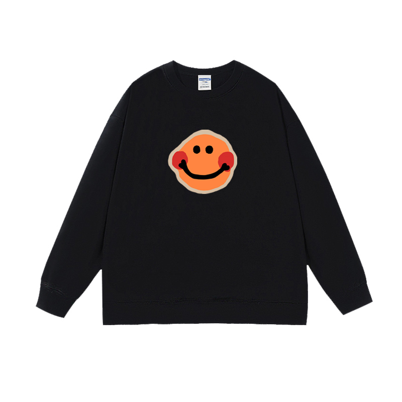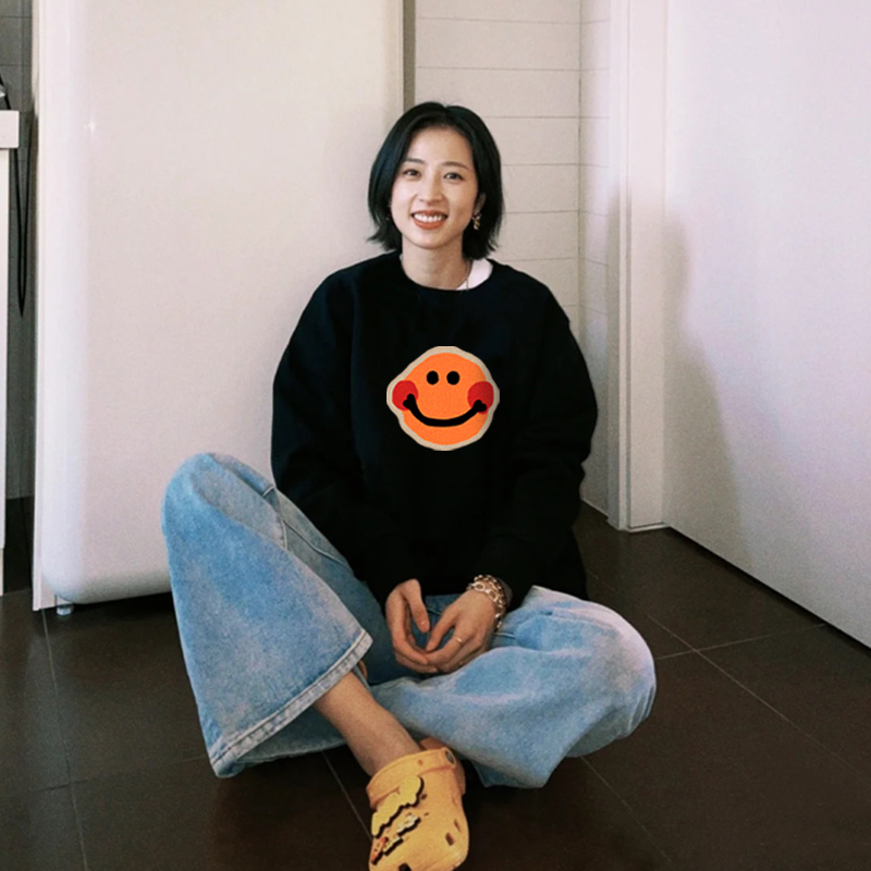 周雨彤同款黑色厚棉T女韓版2023oversize春秋新款笑臉情侶外套上衣