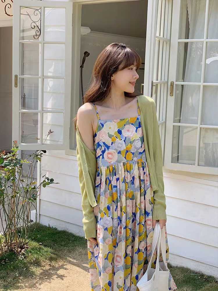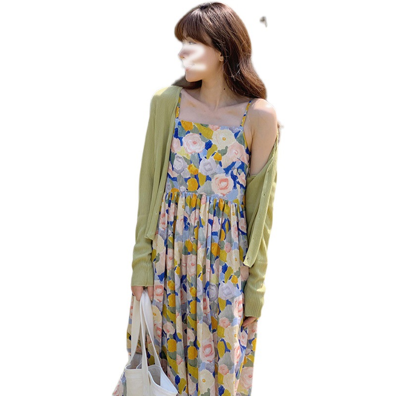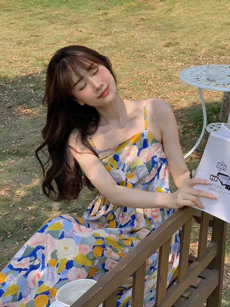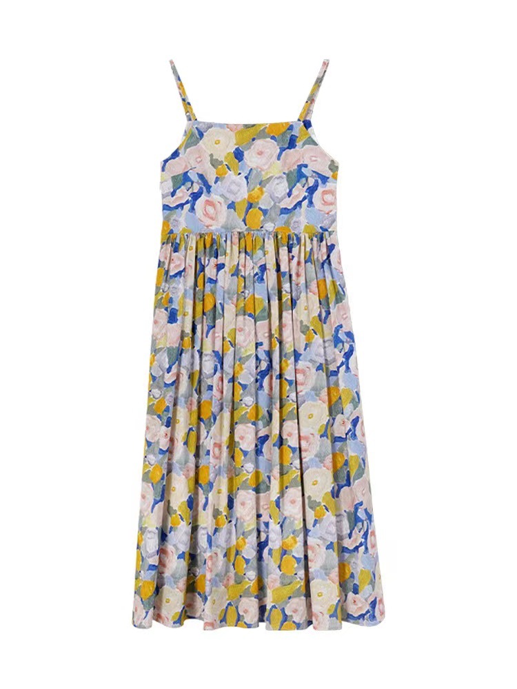 油画碎花连衣裙女夏新款小个子设计感小众法式气质海边度假吊带裙