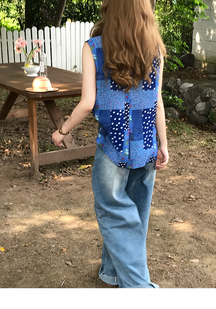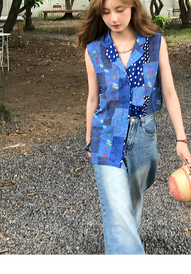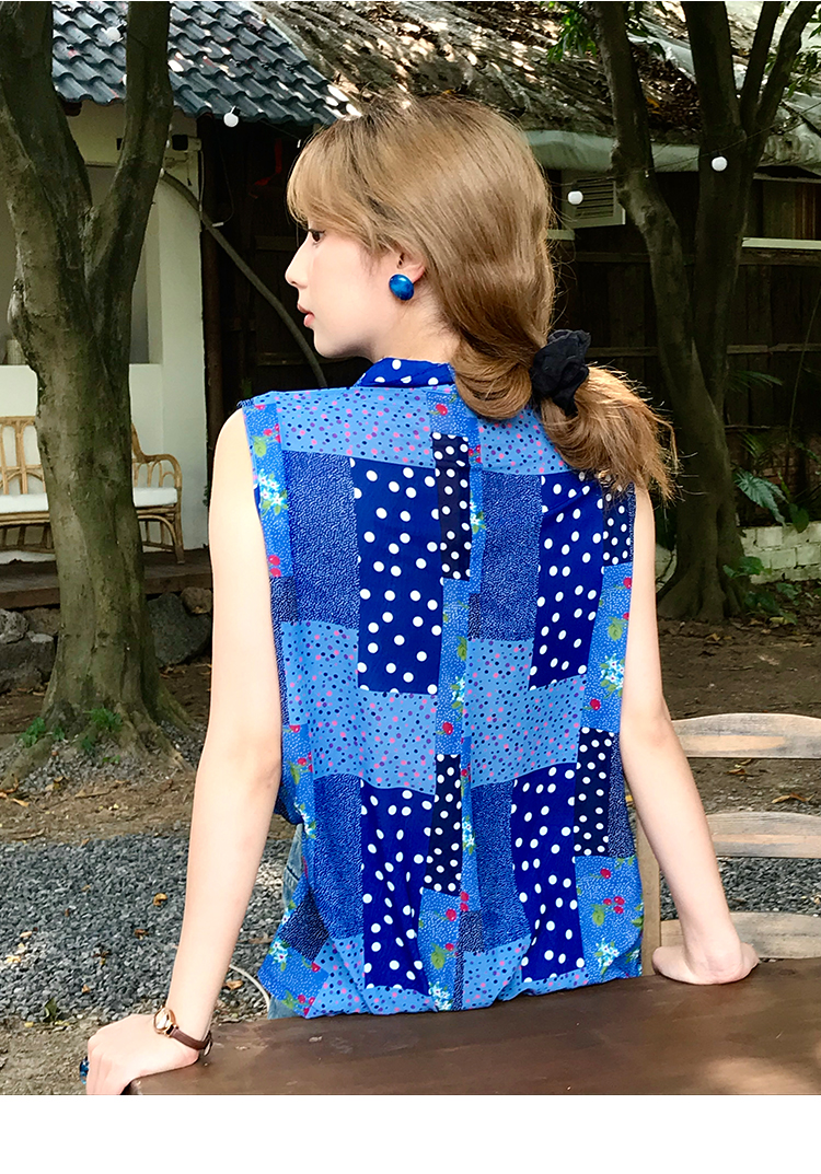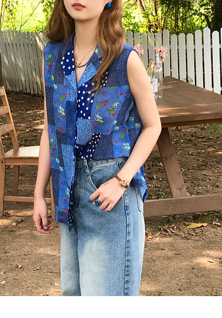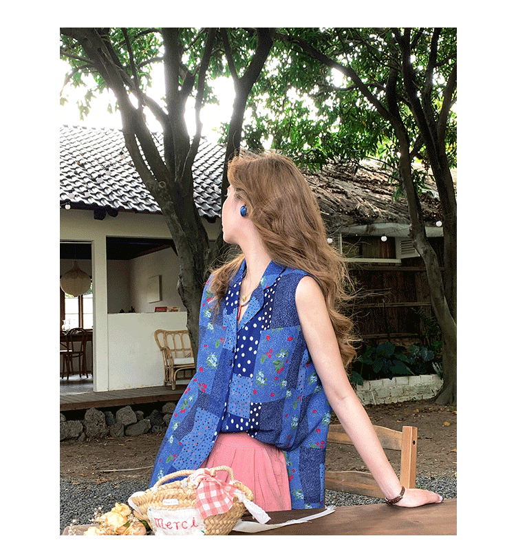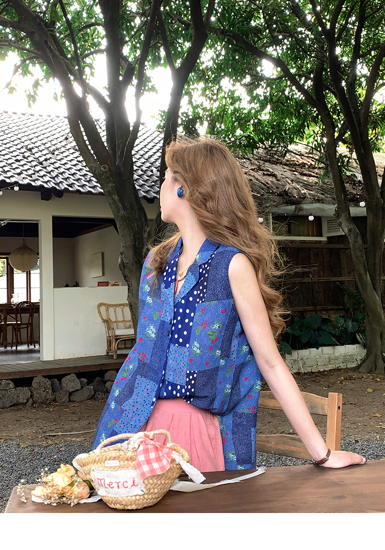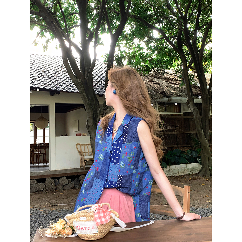 JC古著商店 "花夢"藍色無袖雪紡襯衫女夏復古V領拼布碎花背心上衣