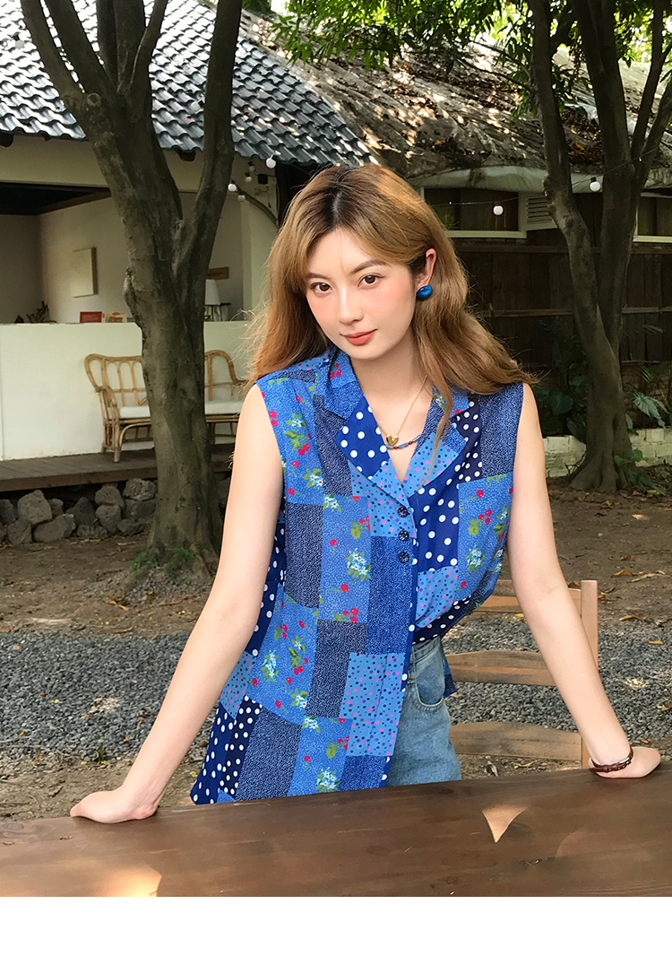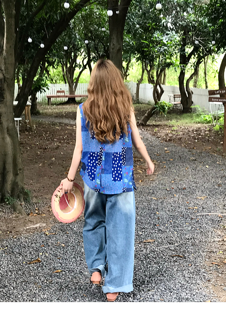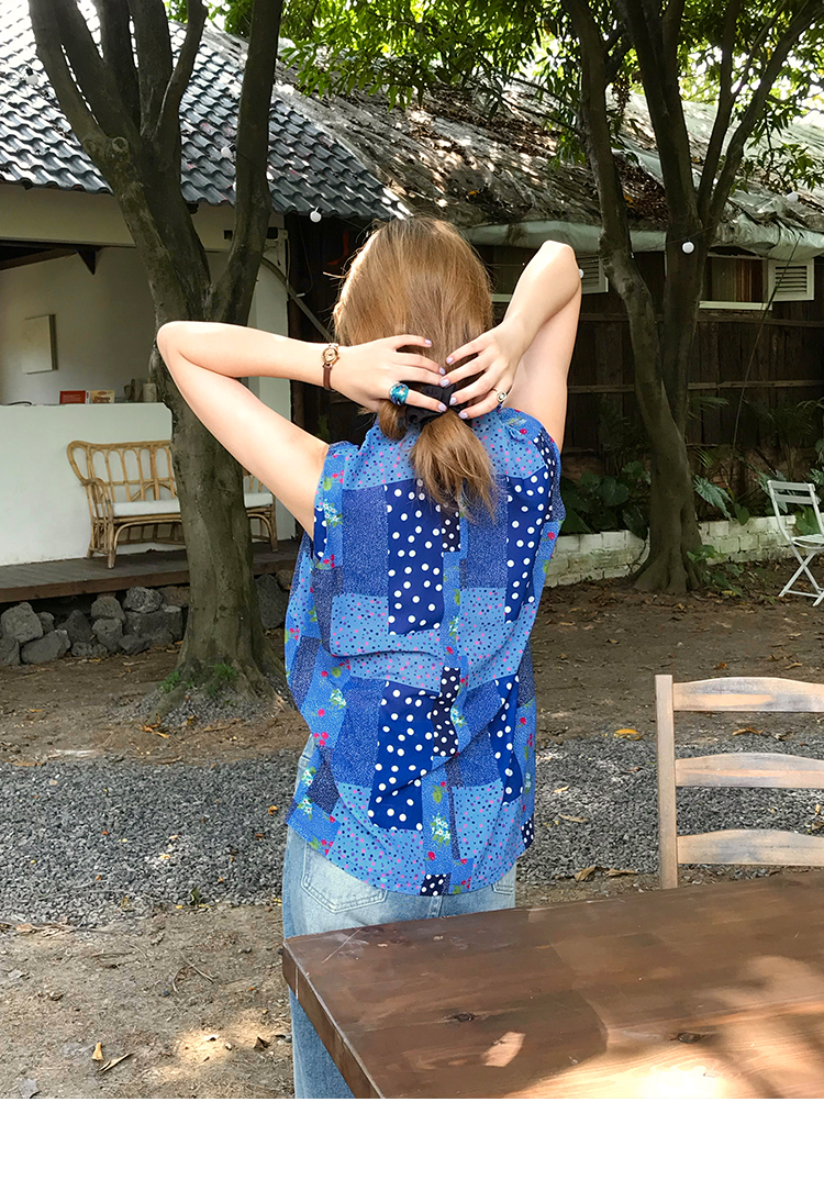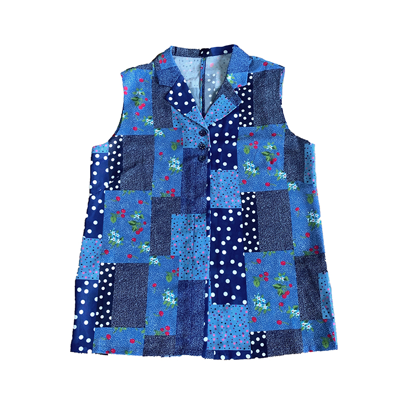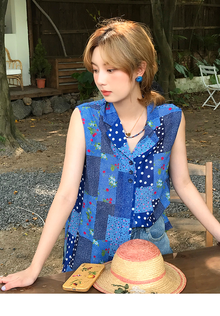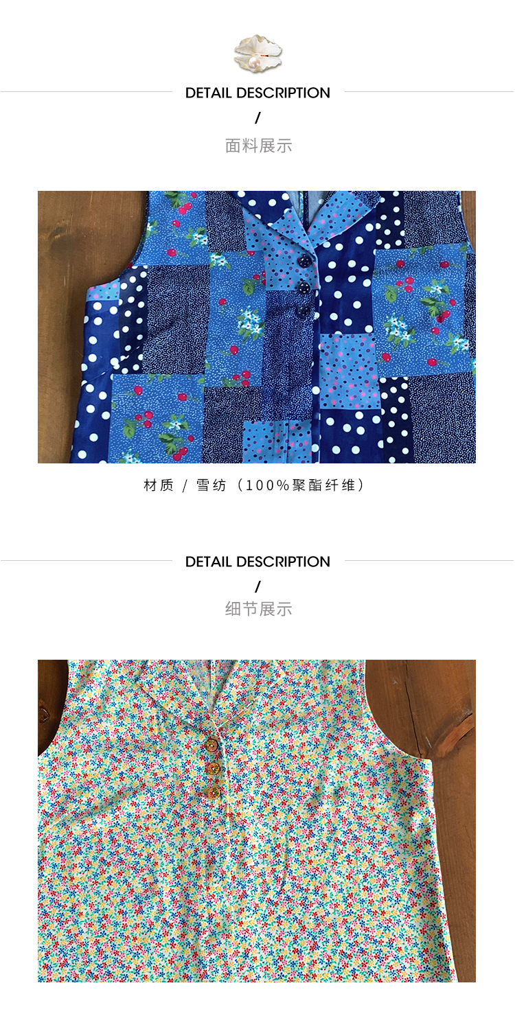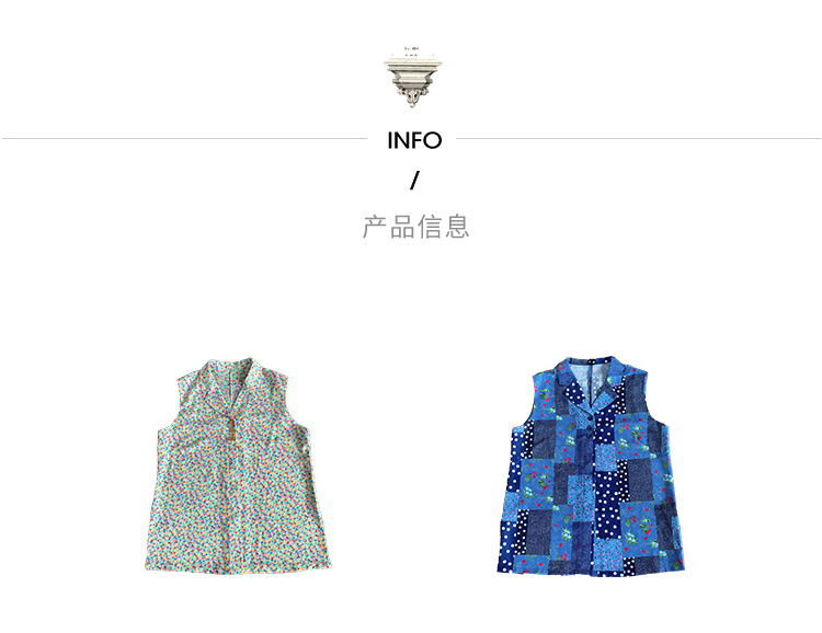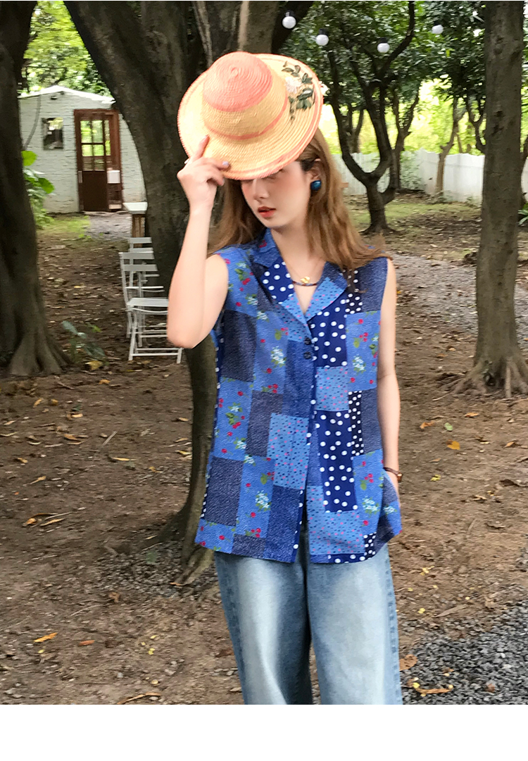 JC古著商店 "花夢"藍色無袖雪紡襯衫女夏復古V領拼布碎花背心上衣
