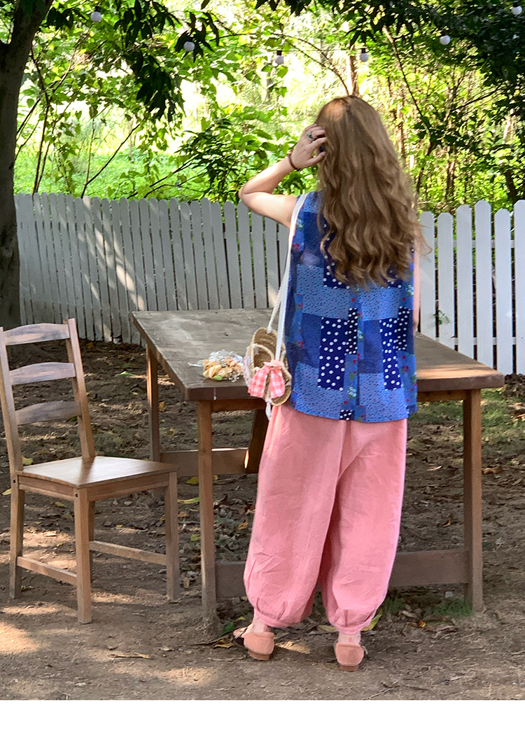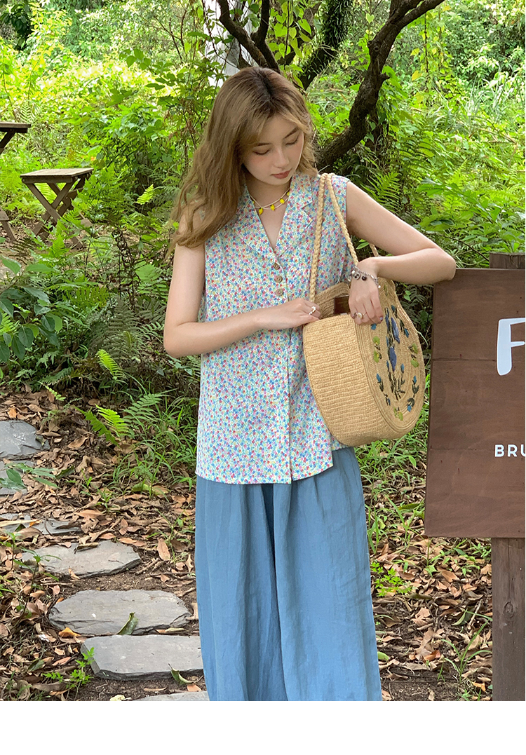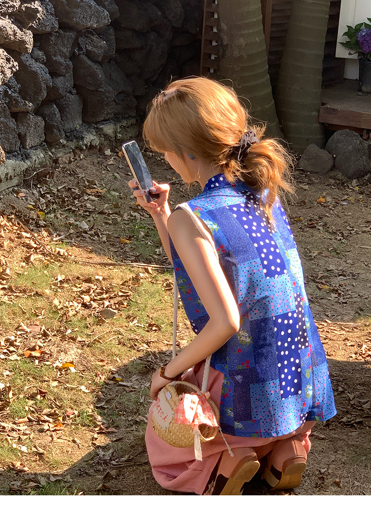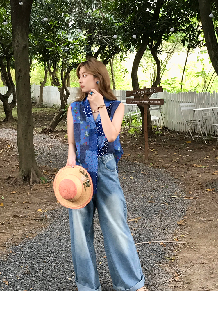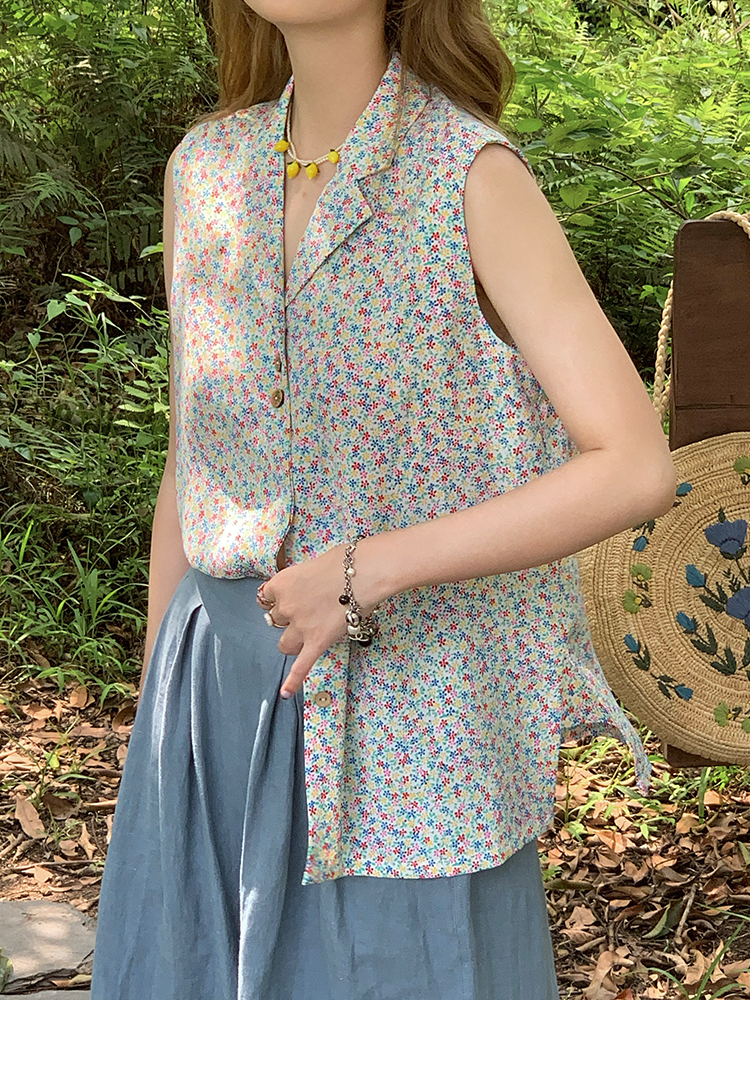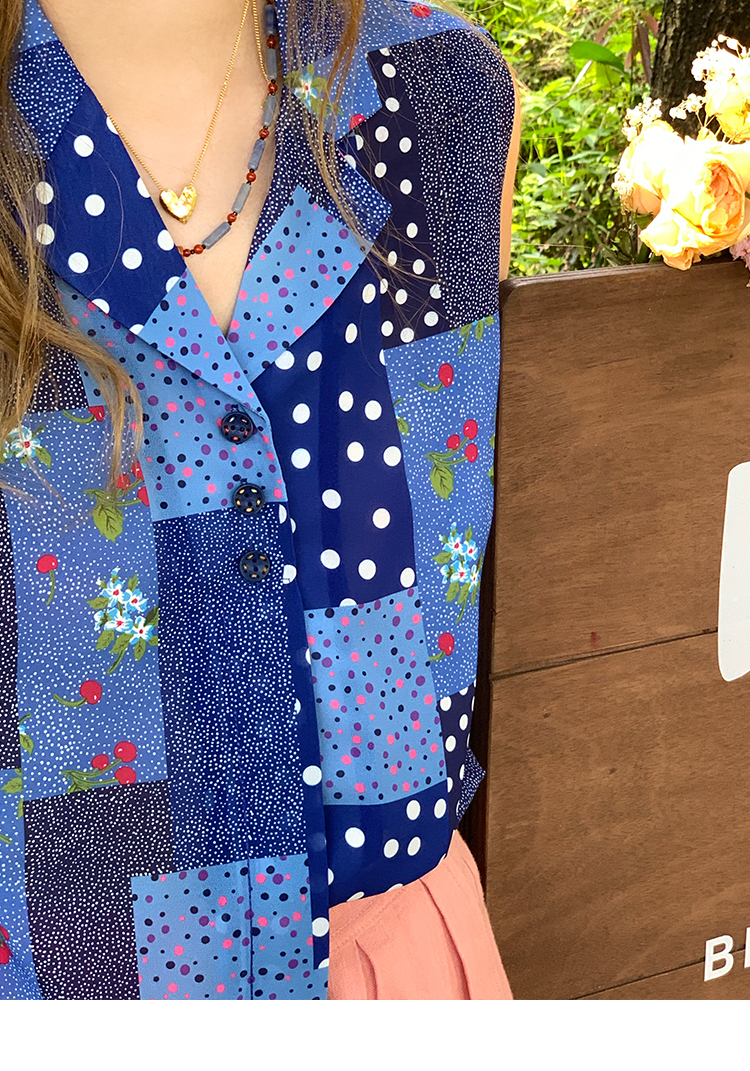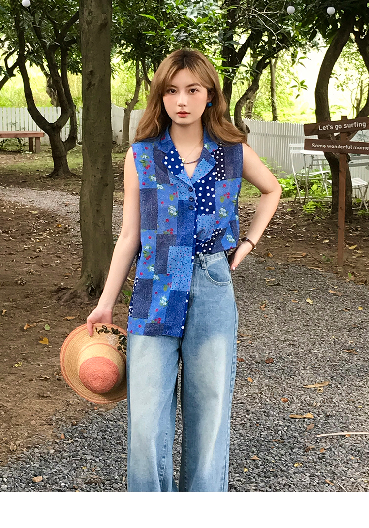 JC古著商店 "花夢"藍色無袖雪紡襯衫女夏復古V領拼布碎花背心上衣