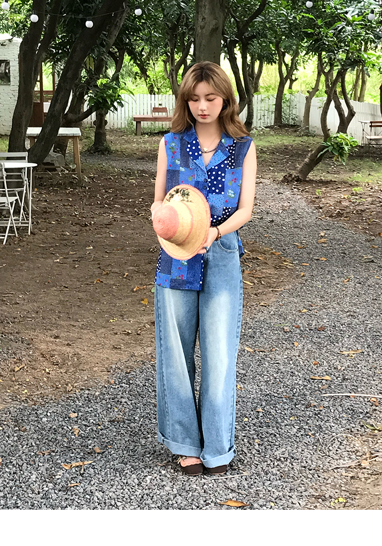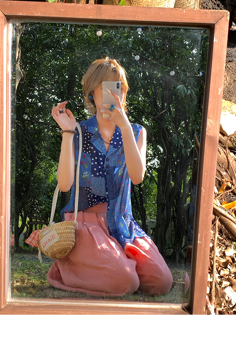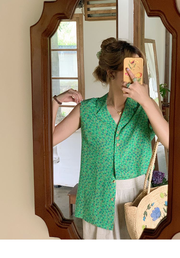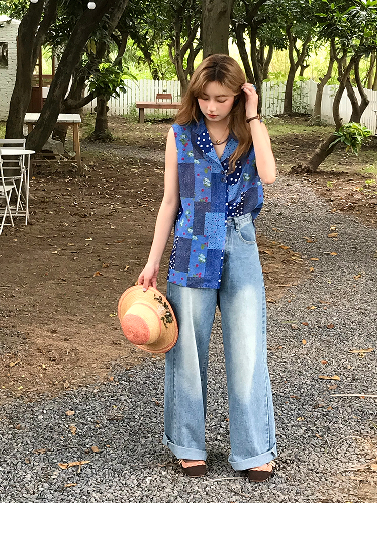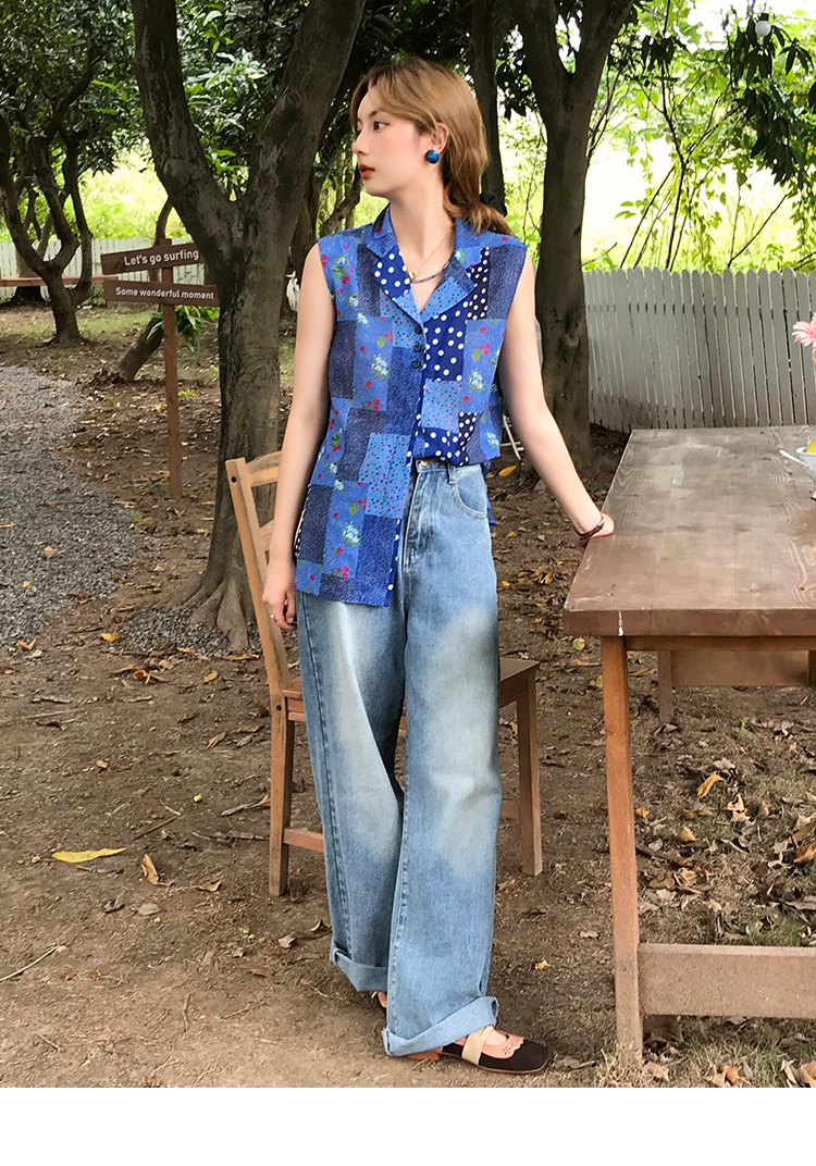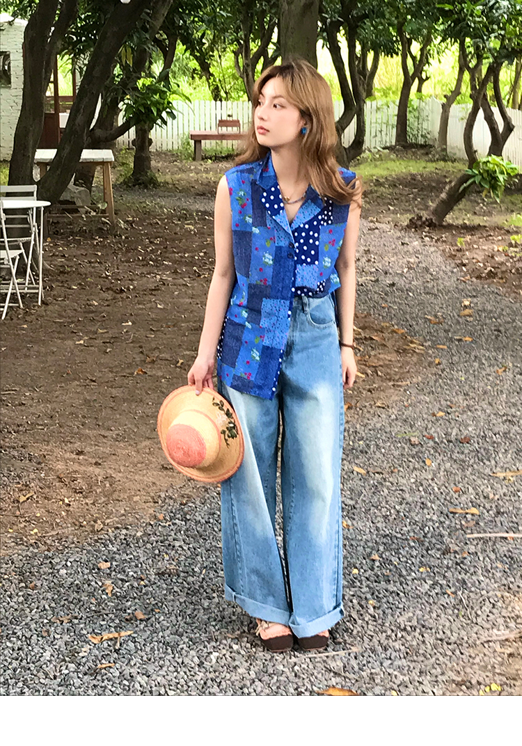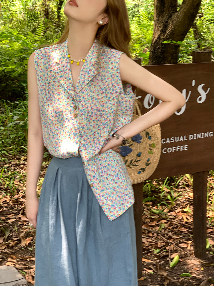 JC古著商店 "花夢"藍色無袖雪紡襯衫女夏復古V領拼布碎花背心上衣