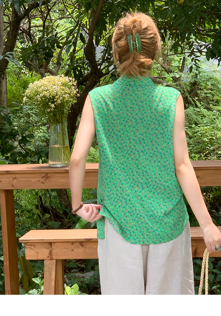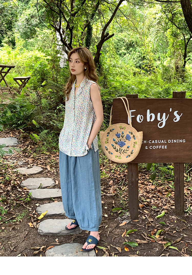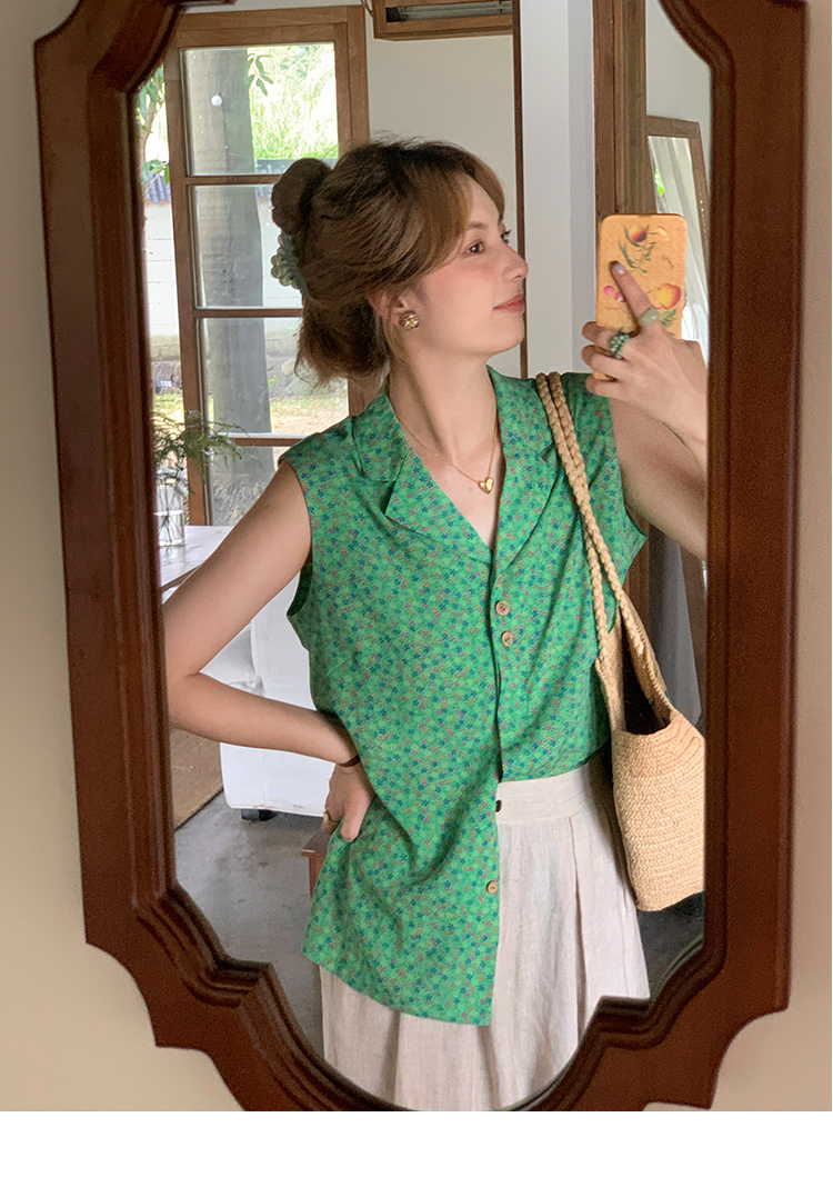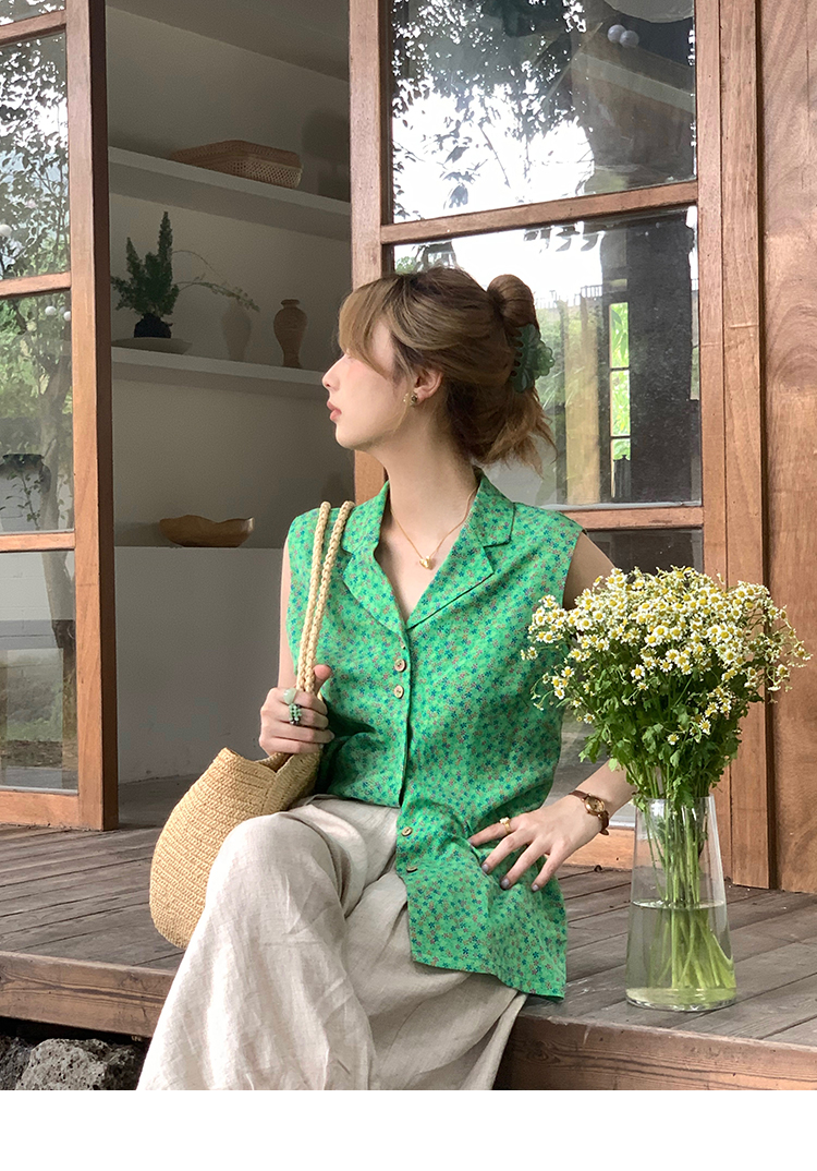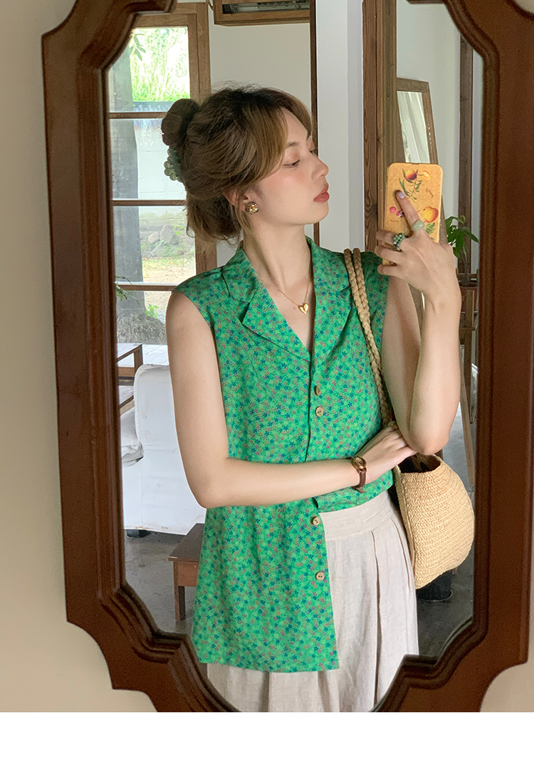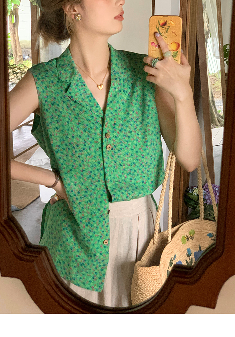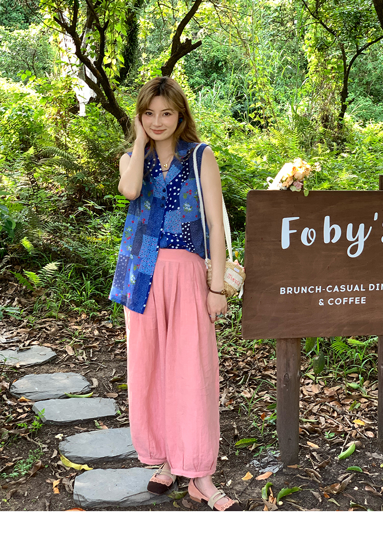 JC古著商店 "花夢"藍色無袖雪紡襯衫女夏復古V領拼布碎花背心上衣