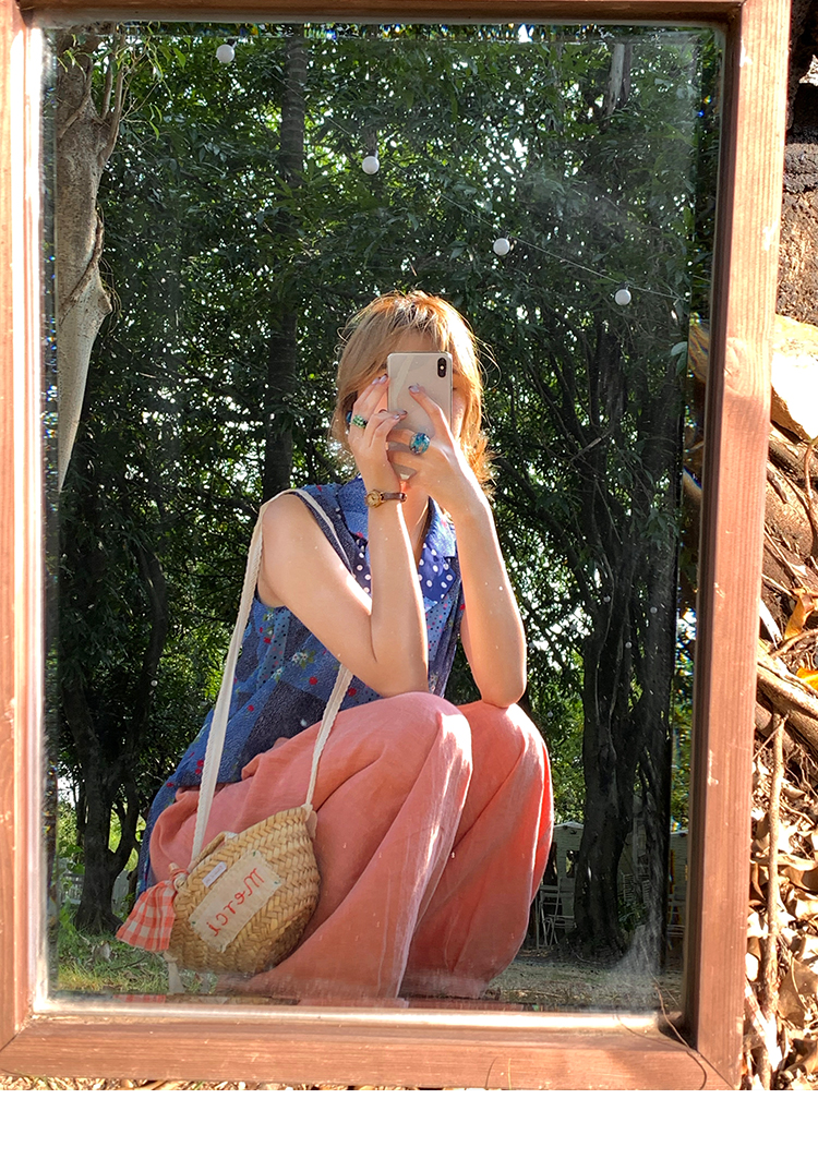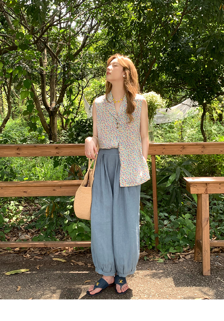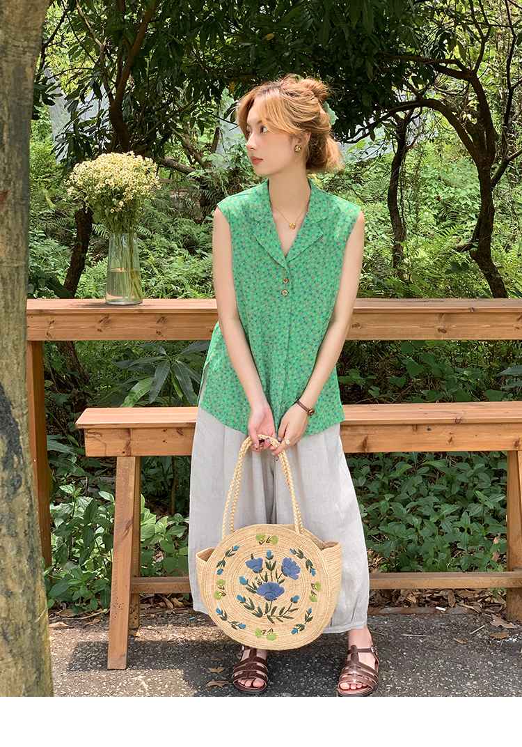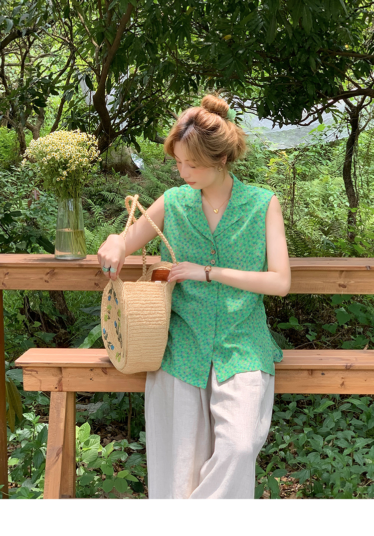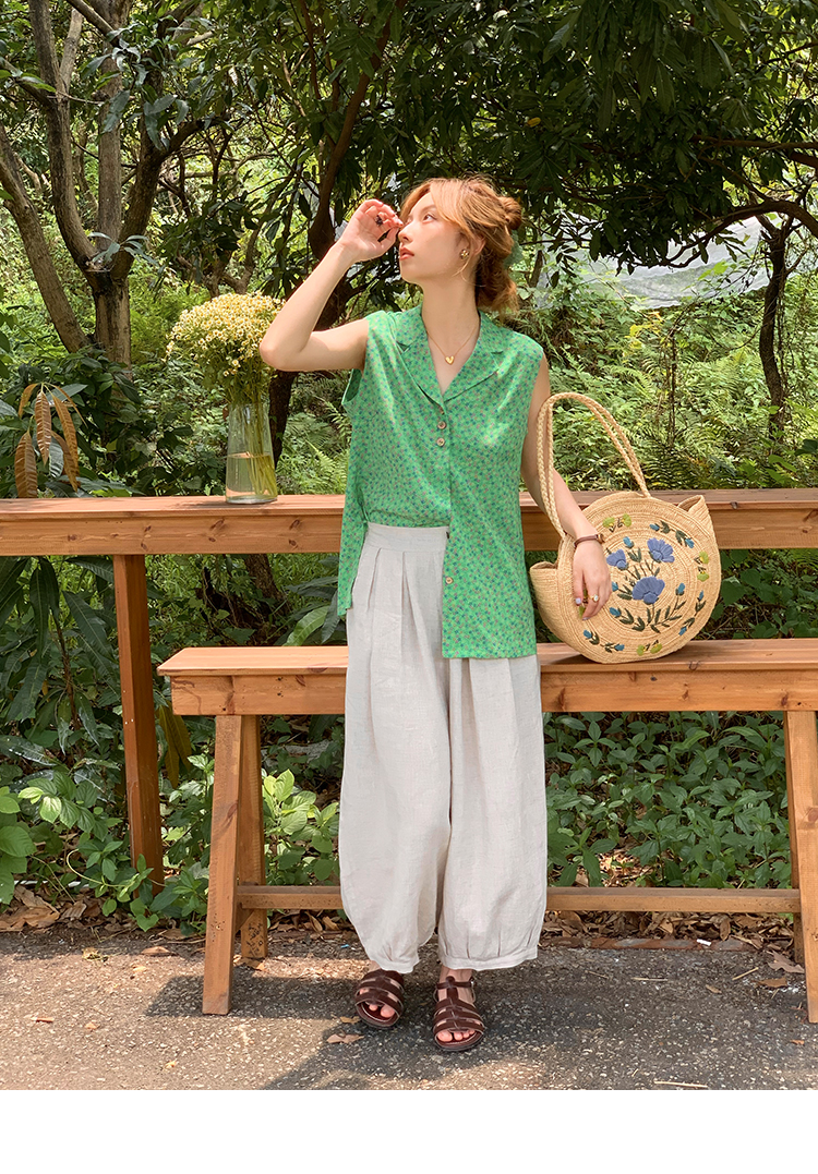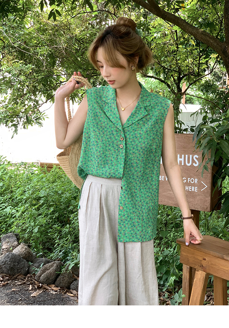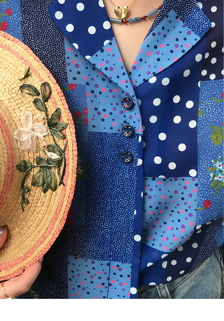 JC古著商店 "花夢"藍色無袖雪紡襯衫女夏復古V領拼布碎花背心上衣