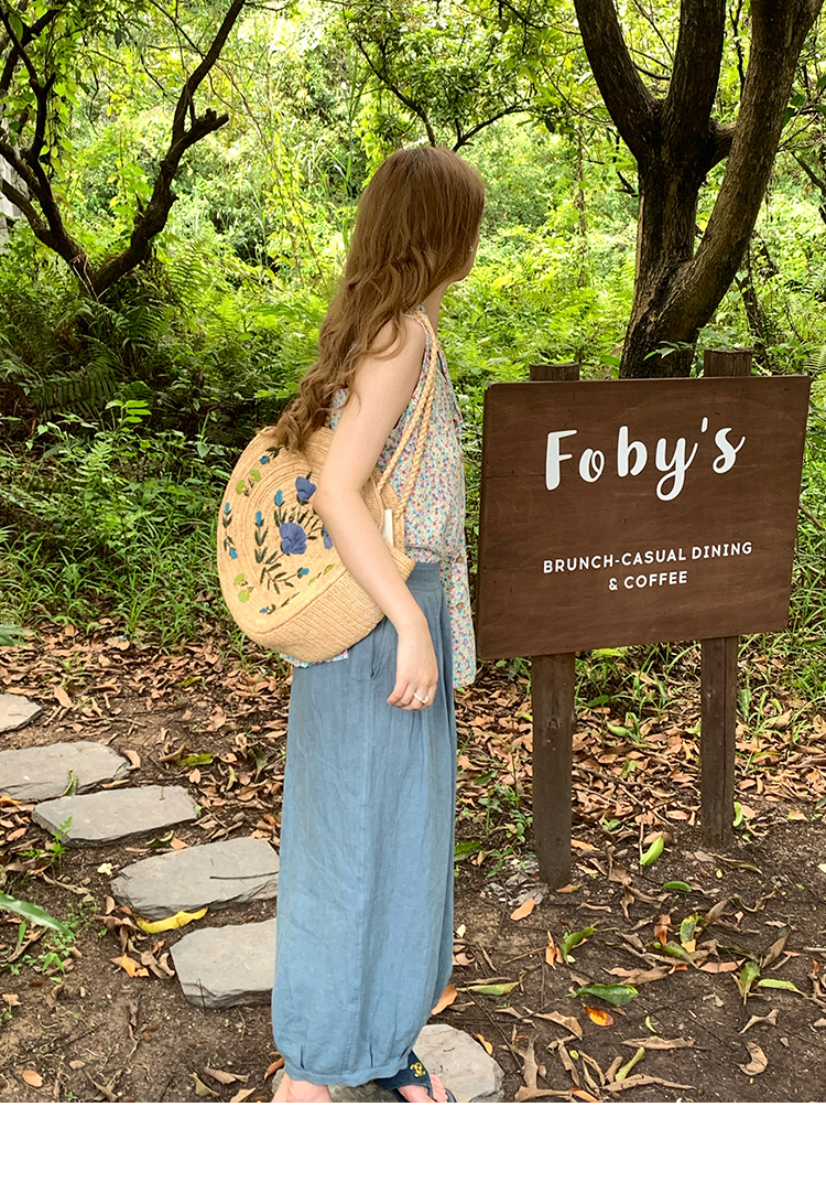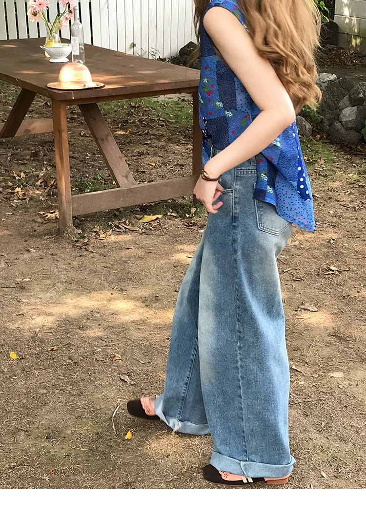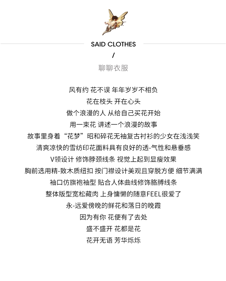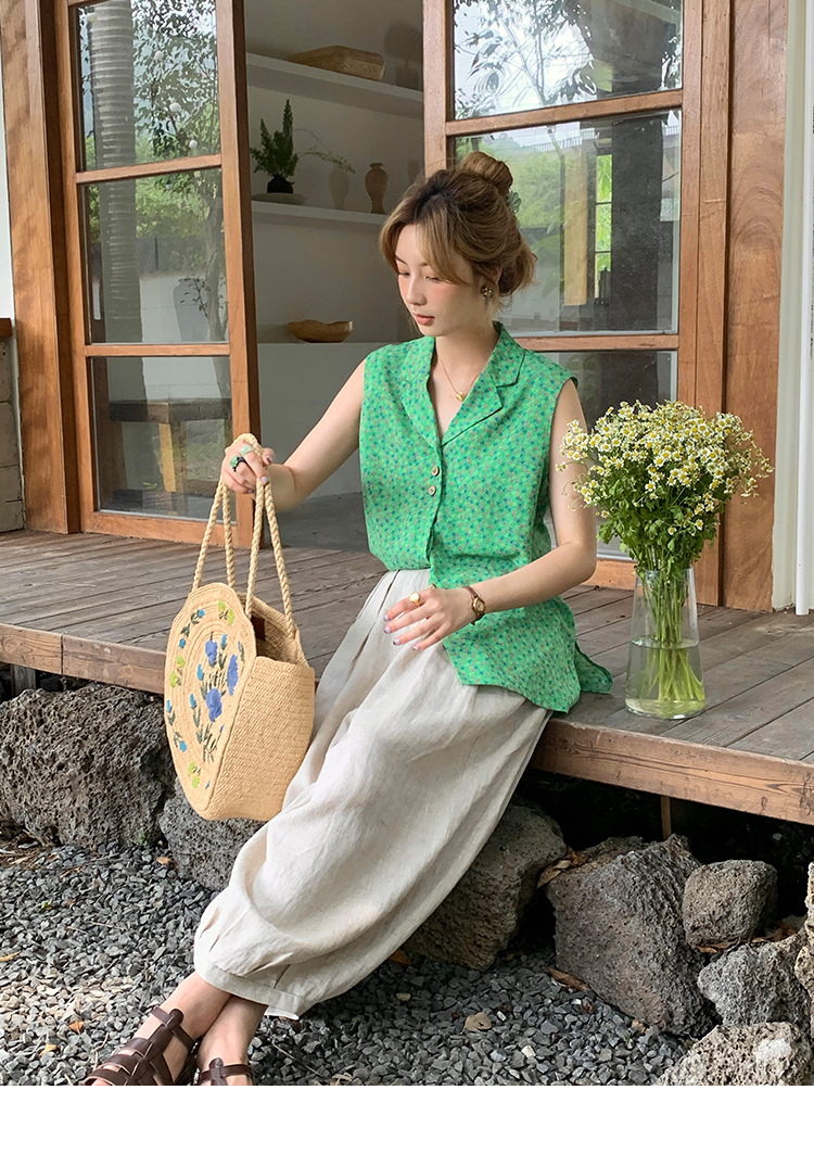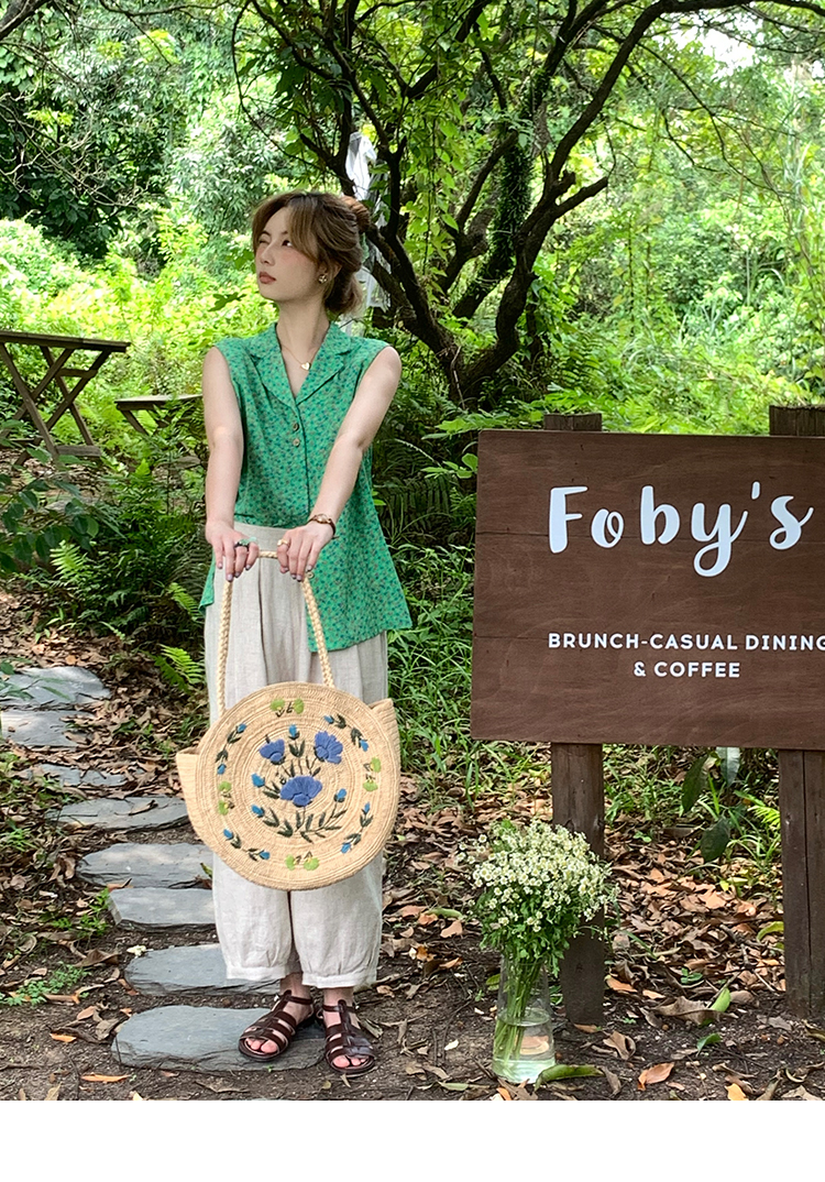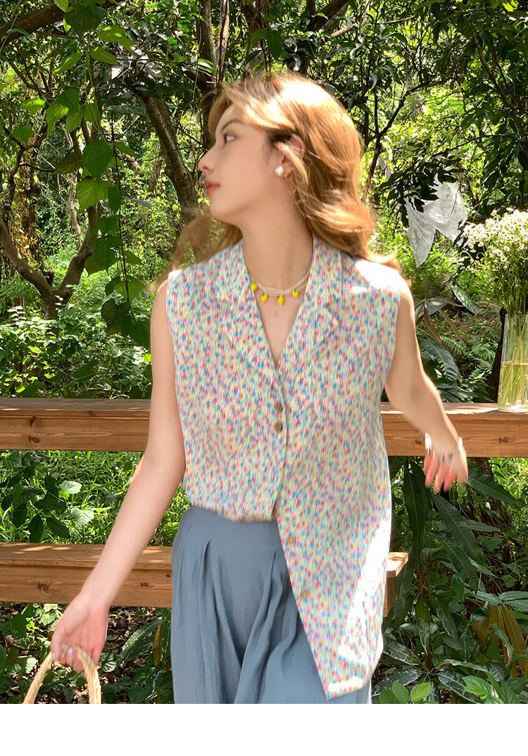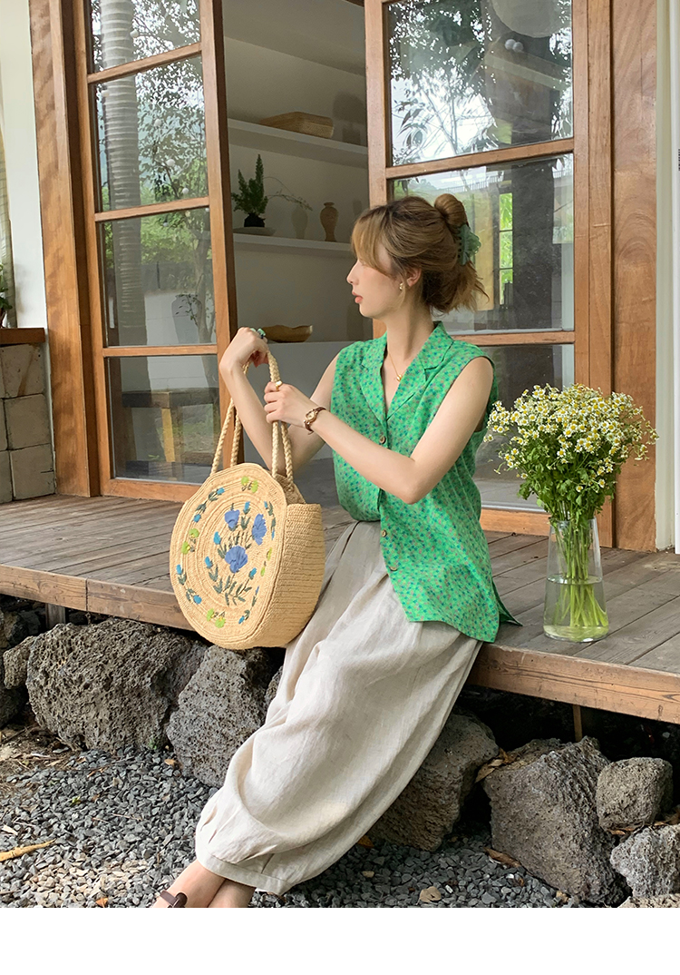 JC古著商店 "花夢"藍色無袖雪紡襯衫女夏復古V領拼布碎花背心上衣