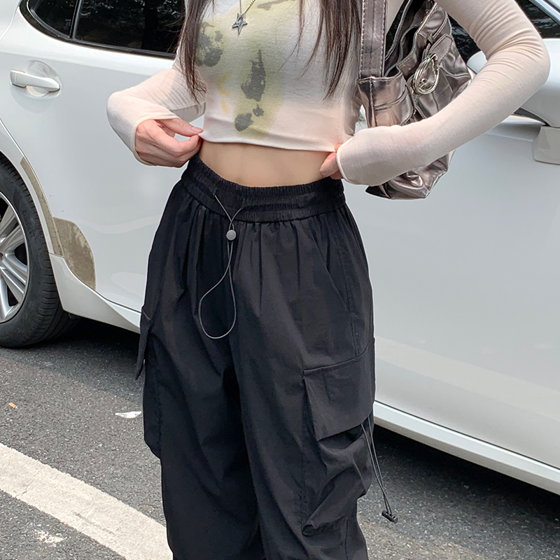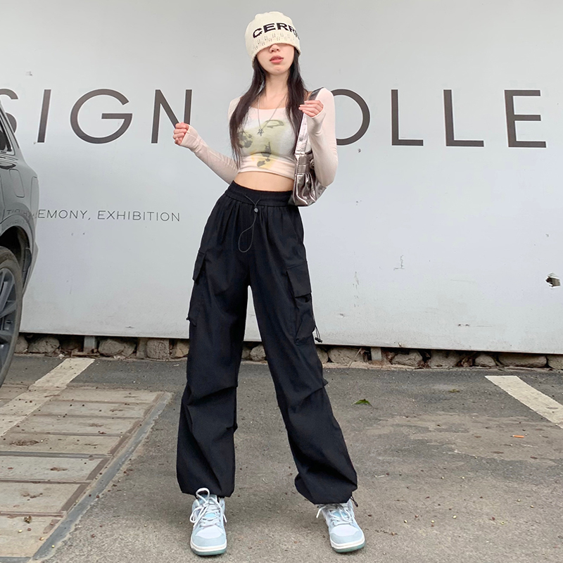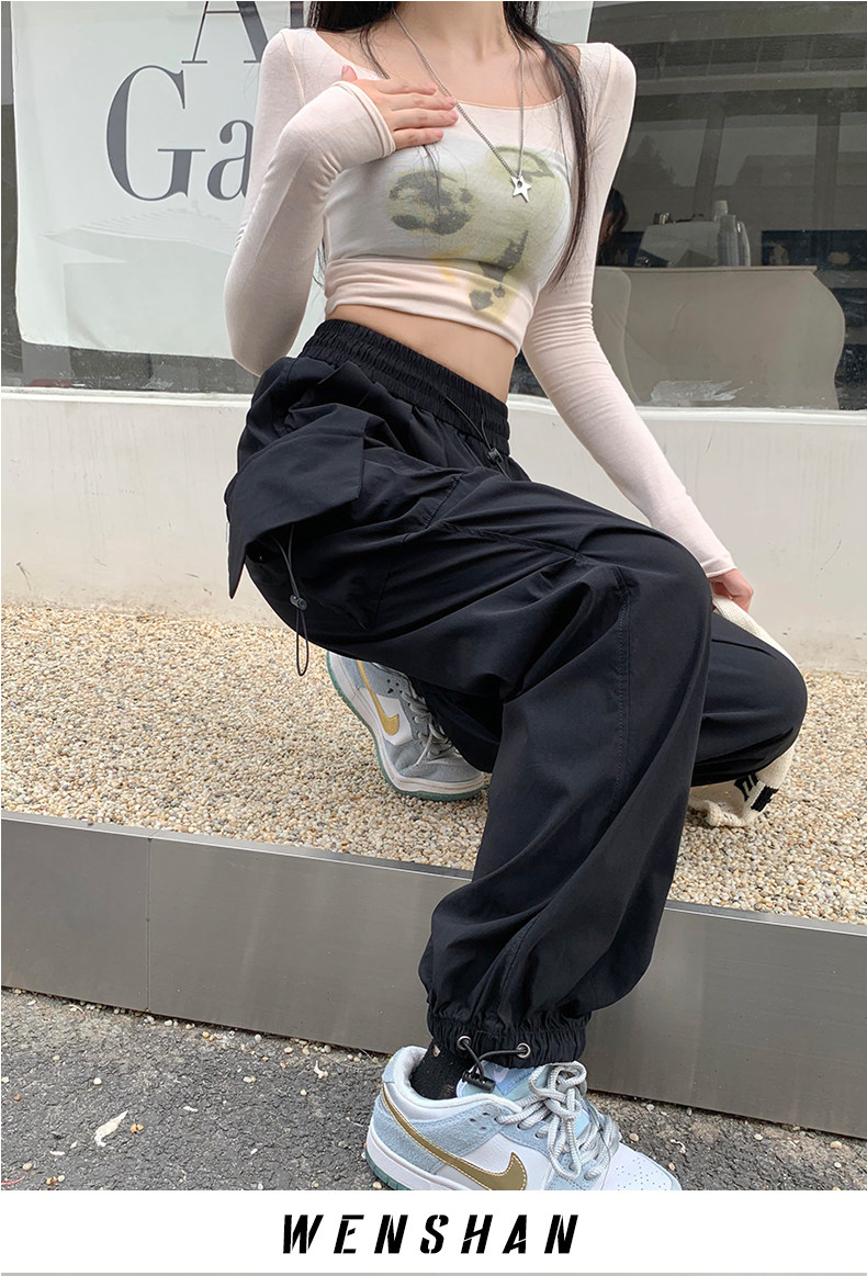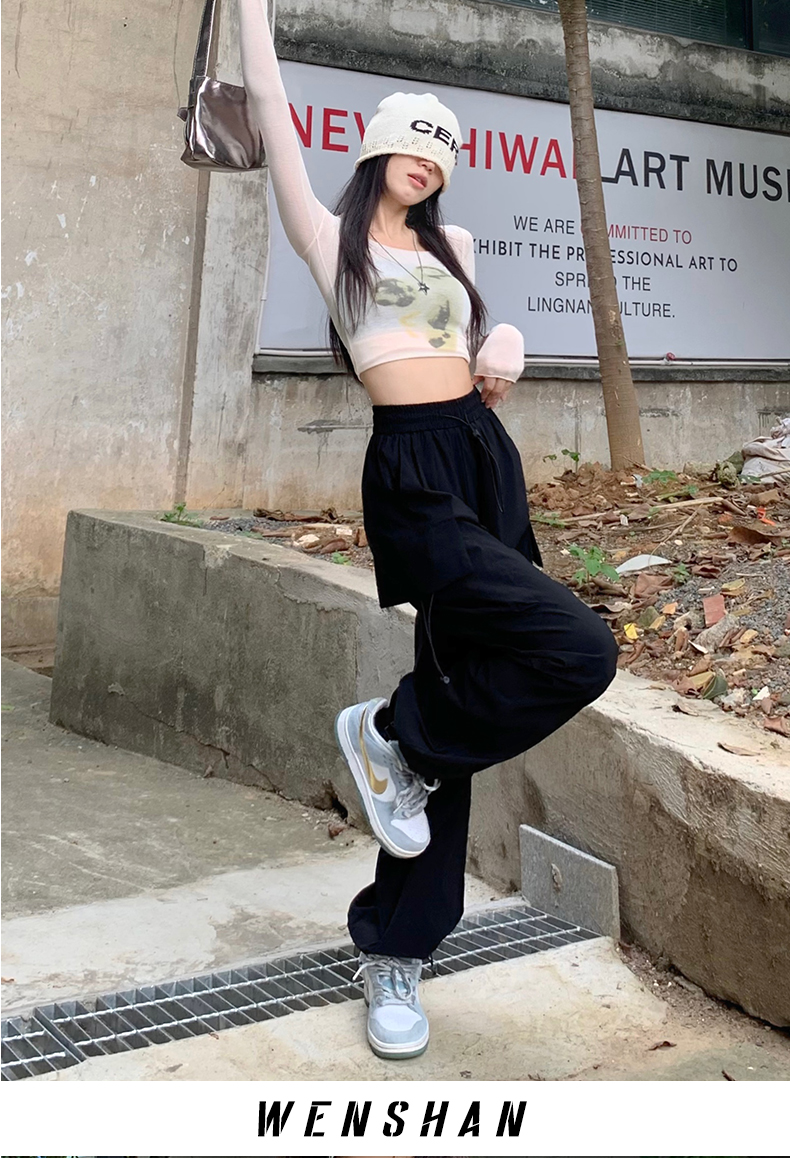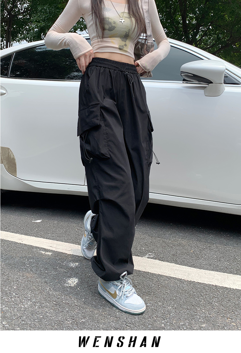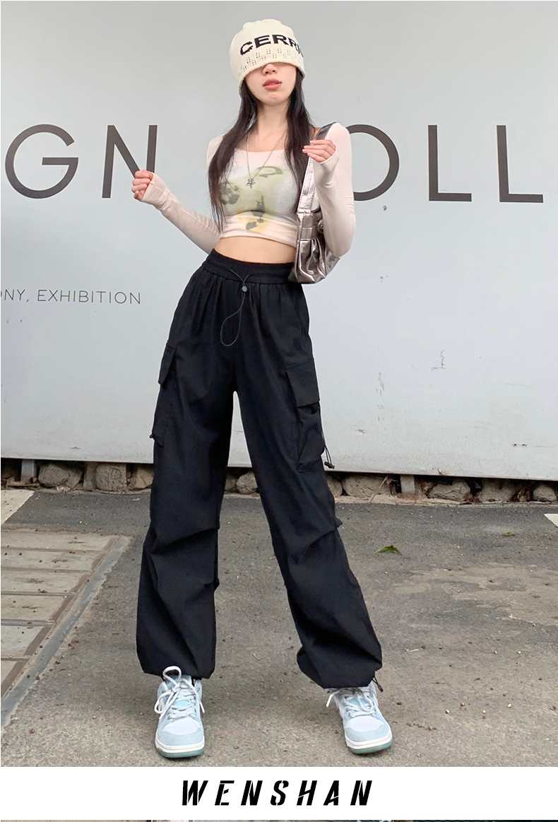溫姍美式高街工裝束腳設計高腰休閒褲女春夏寬鬆闊腿百搭顯瘦長褲