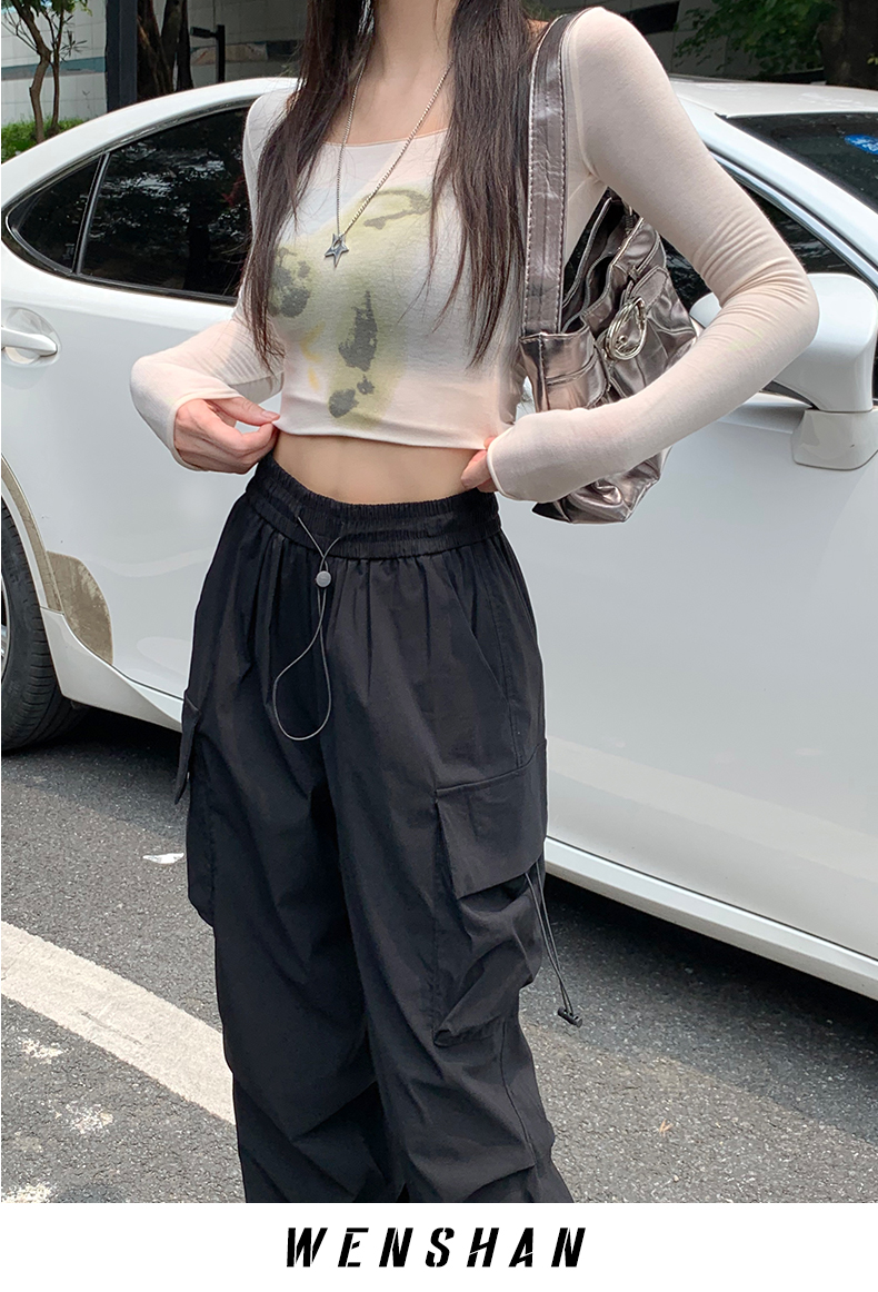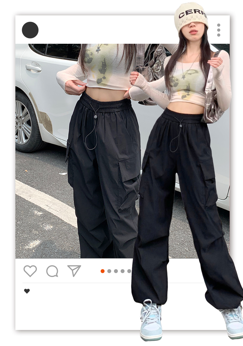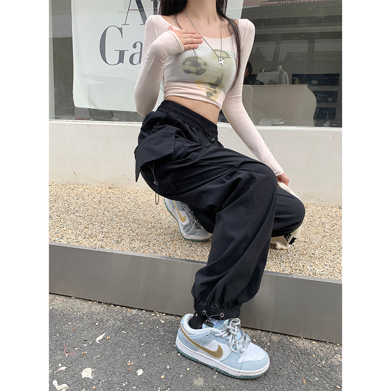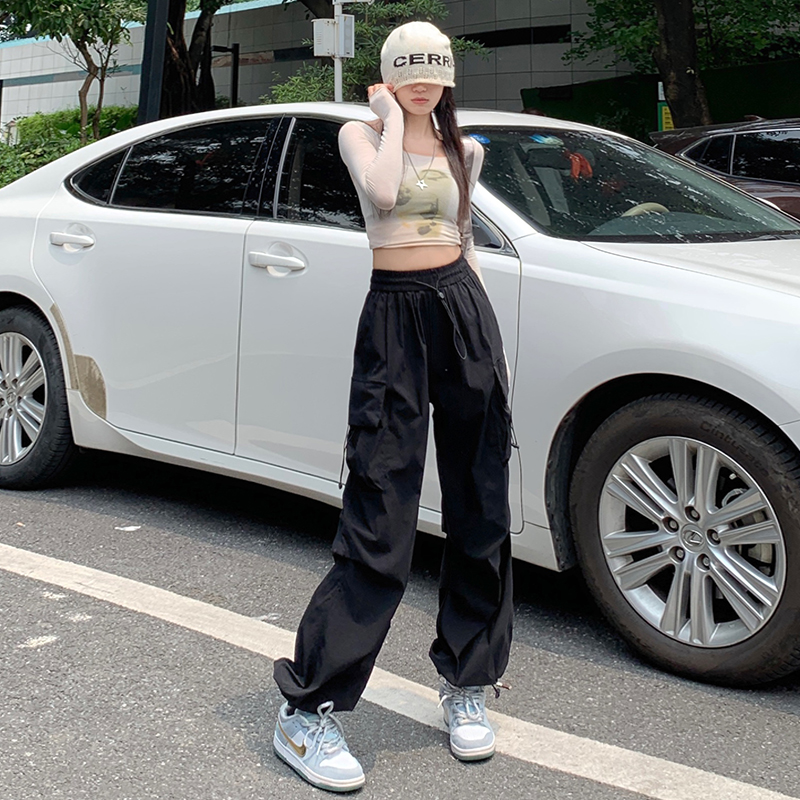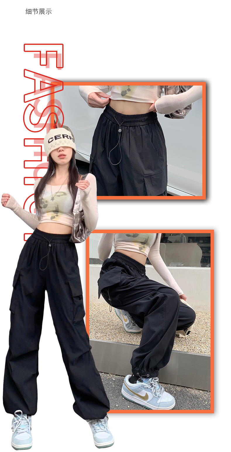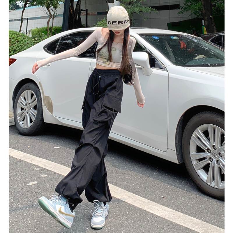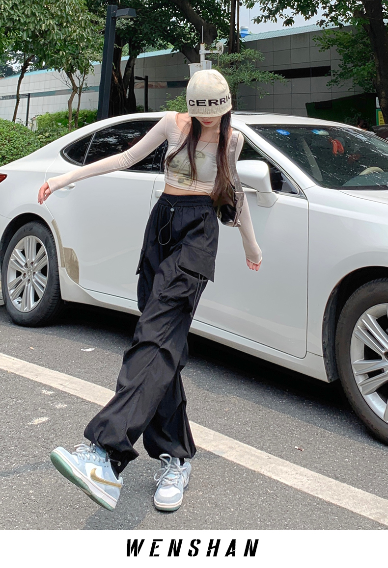 溫姍美式高街工裝束腳設計高腰休閒褲女春夏寬鬆闊腿百搭顯瘦長褲