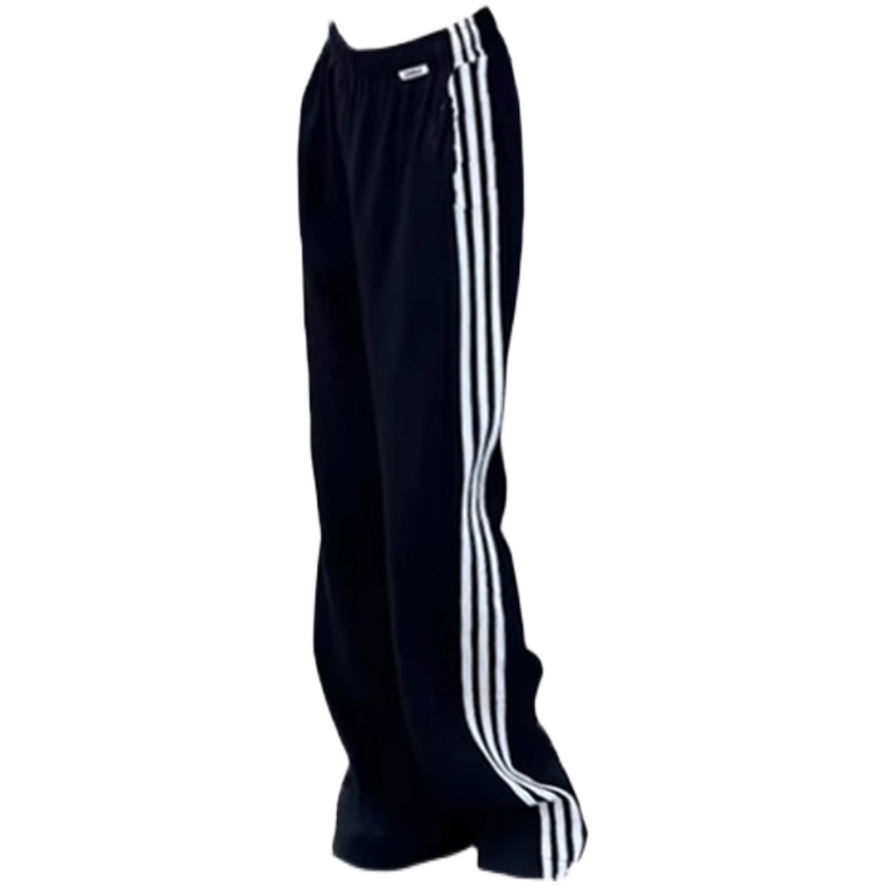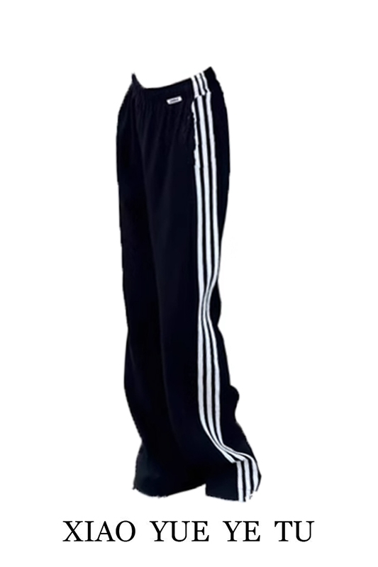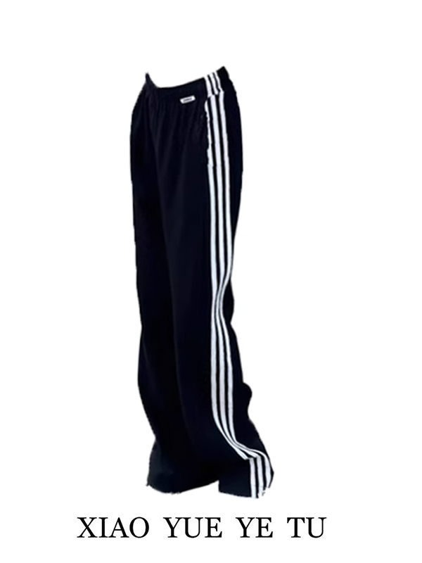 曉月野兔 黑色直筒運動褲女春夏新款衛褲百搭條紋三條槓長褲褲子