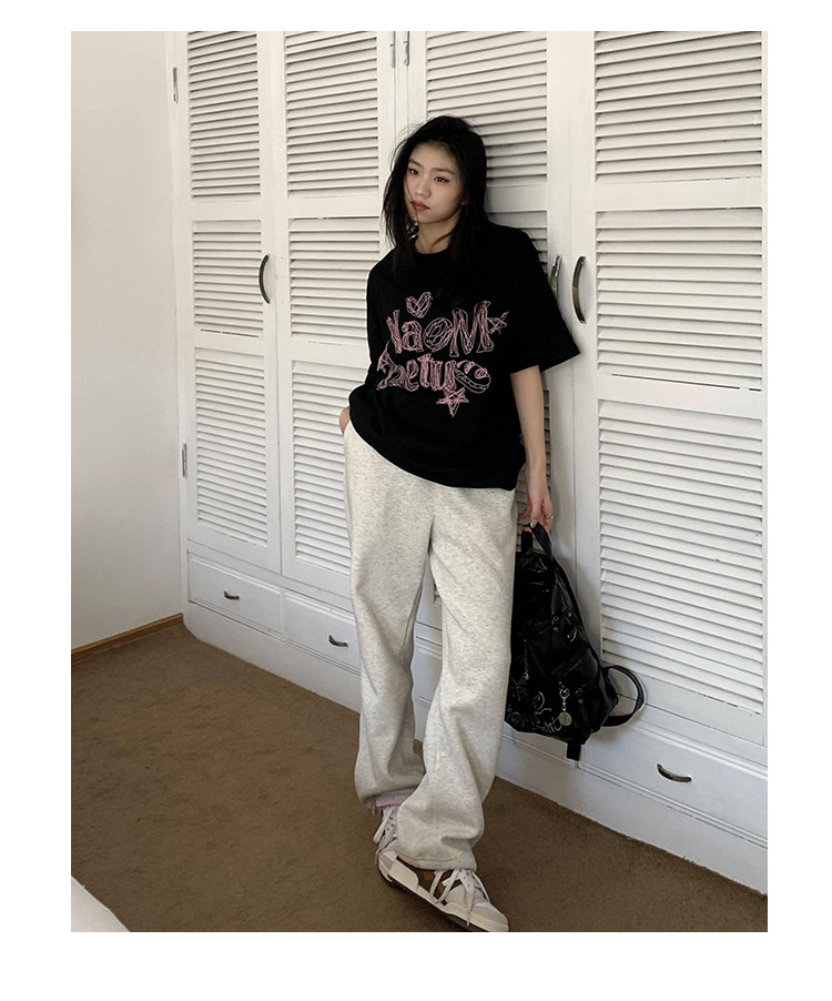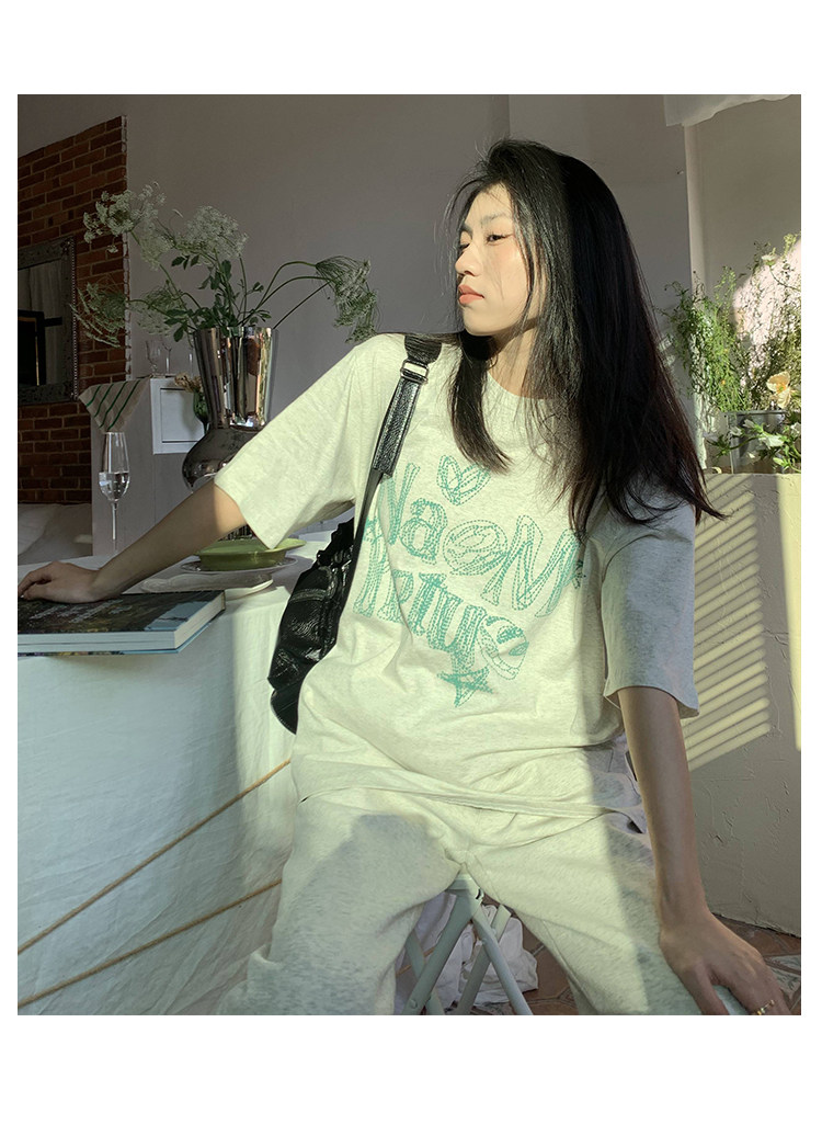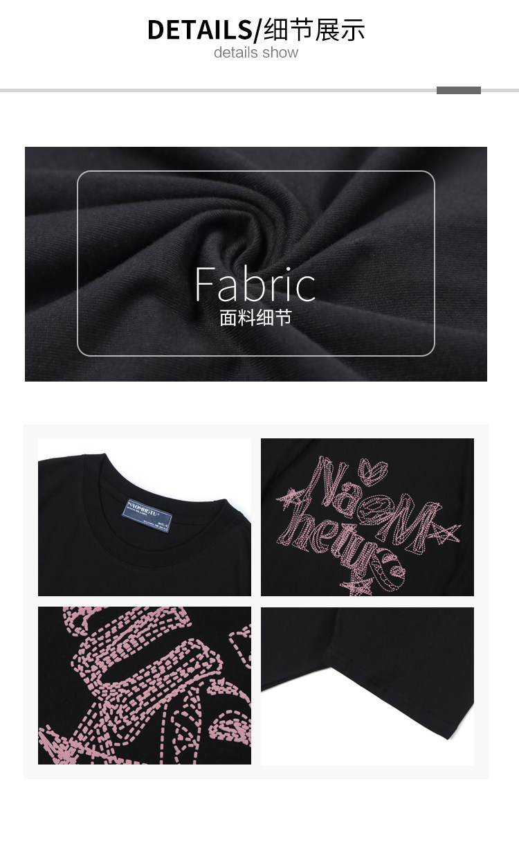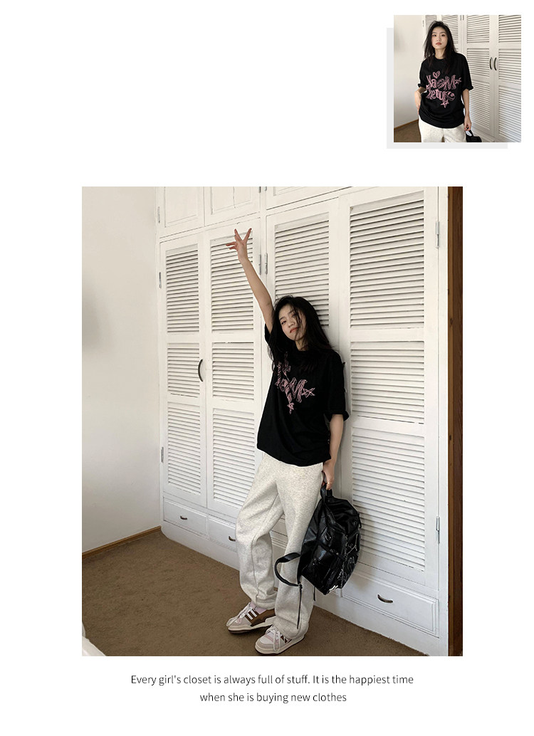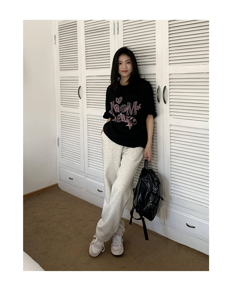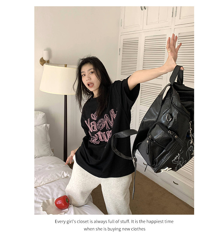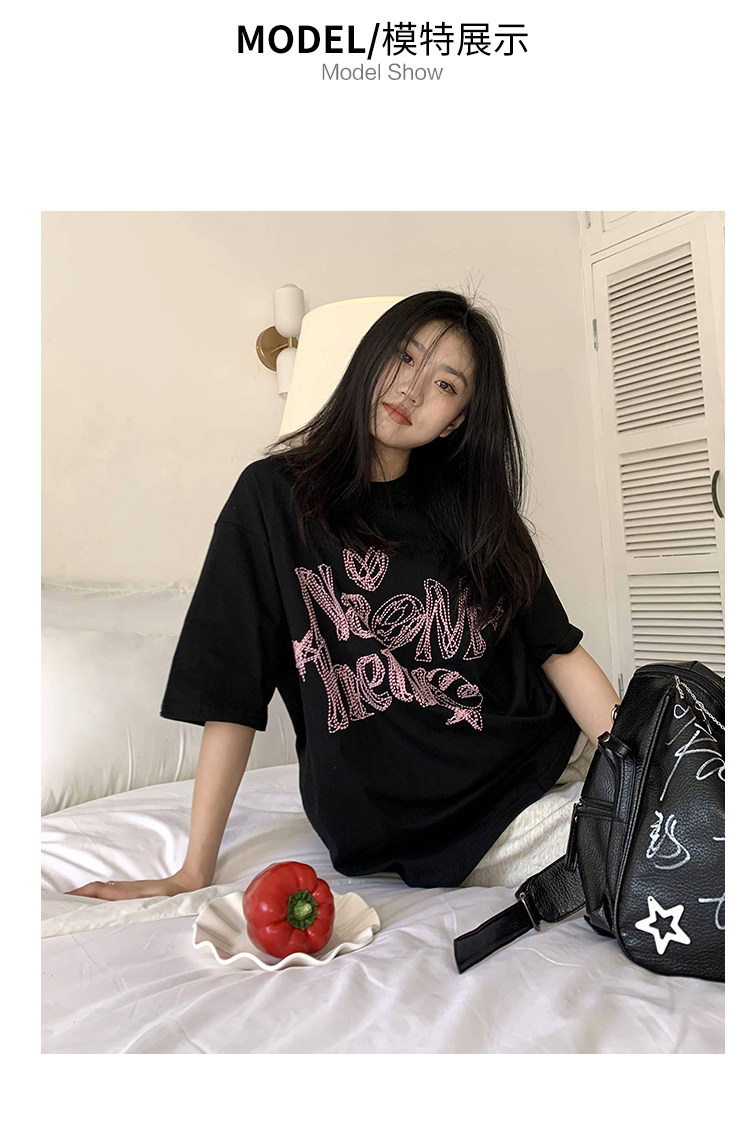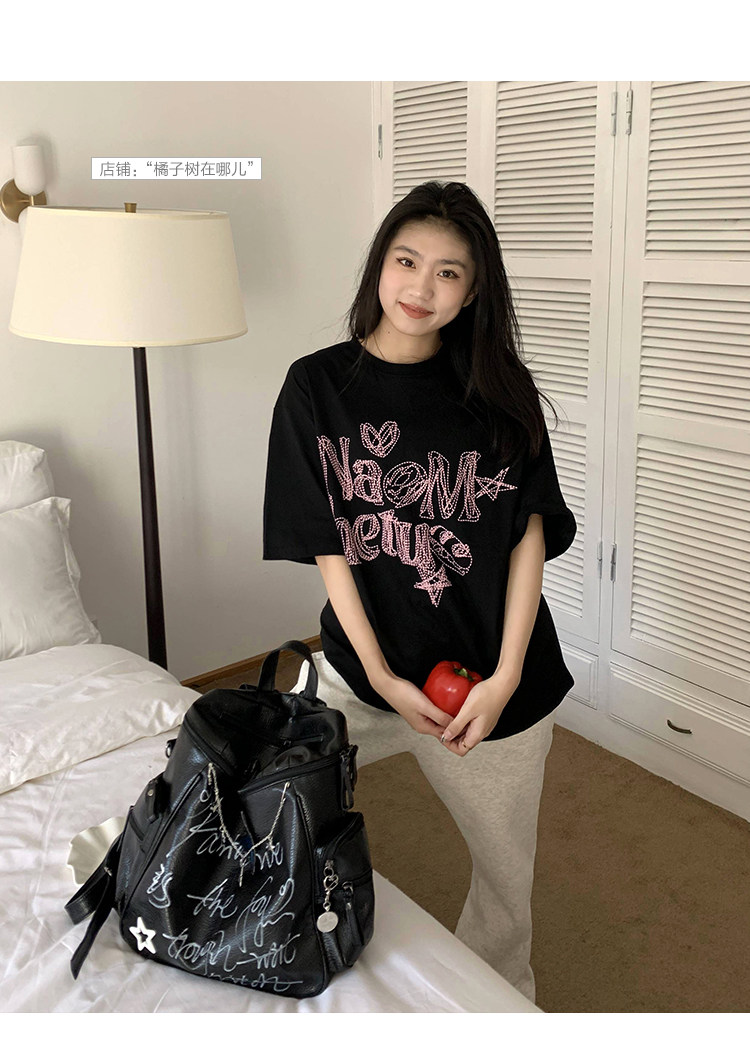 橘子樹在哪兒字母印花圓領短袖T恤女夏休閒寬鬆甜酷黑色半袖T恤
