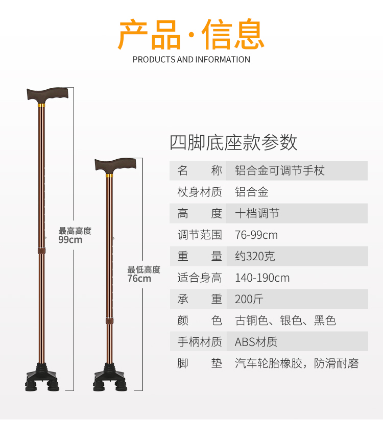 顏色分類 (黑色)單腳柺杖,(黑色)單腳柺杖+備用腳墊,(黑色)小四腳互換款,(黑色)小四腳互換款+備用腳墊,(古銅色)單腳柺杖,(古銅色)單腳柺杖+備用腳墊,(古銅色)小四腳互換款,古銅色)小四腳互換款+備用腳墊,(銀白色)單腳柺杖,(銀白色)單腳柺杖+備用腳墊,(銀白色)小四角互換款,銀白色)小四角互換款+備用腳墊