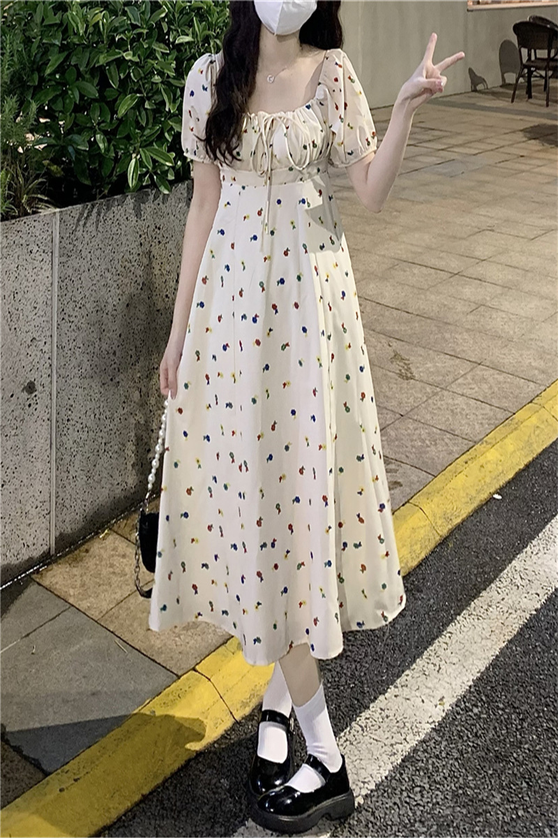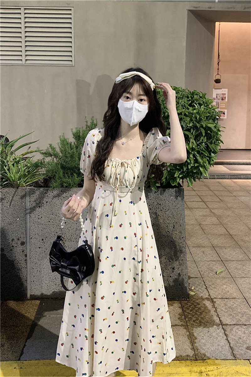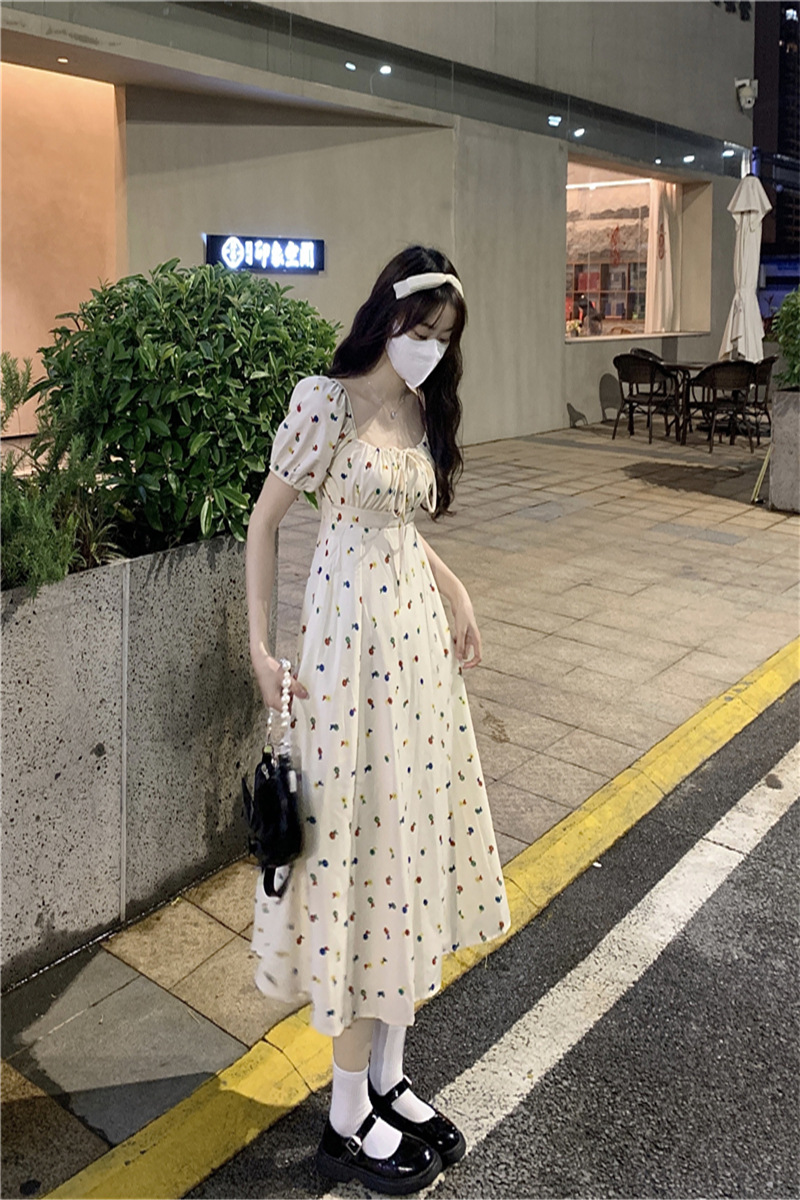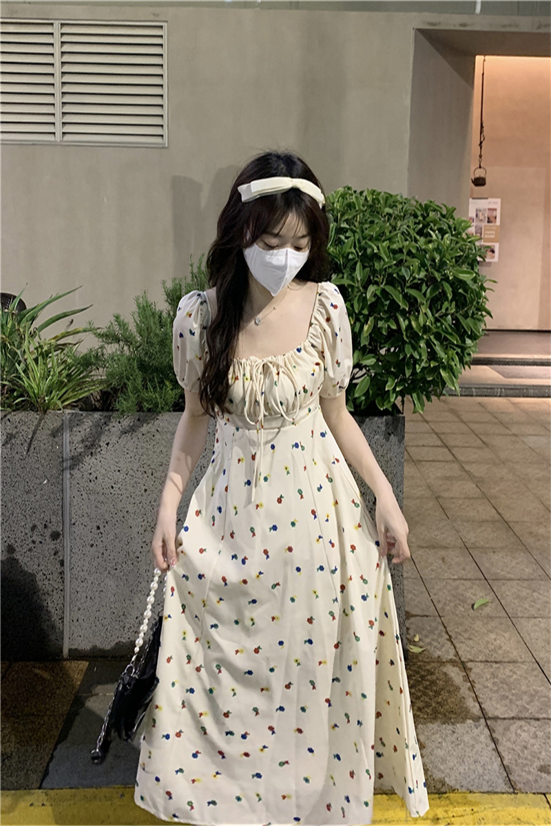 法式小众奶甜茶歇碎花长裙子收腰显瘦温柔风泡泡袖初恋连衣裙夏女
