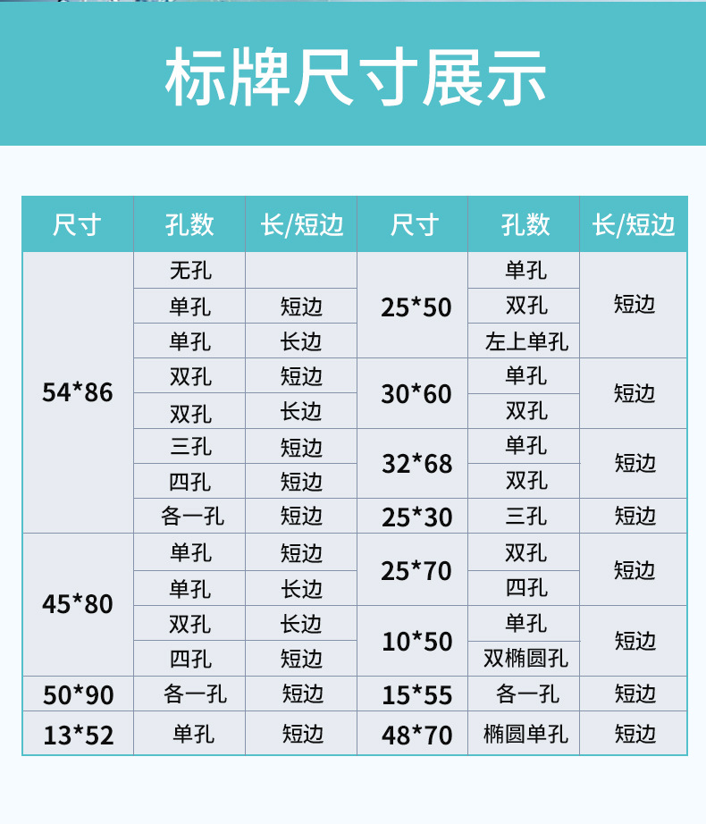 颜色 空白挂牌32X68短边单孔,空白挂牌32X68短边双孔,空白挂牌30X60短边双孔,空白挂牌30X60短边单孔,空白挂牌10*50短边单孔,空白挂牌25X50单孔,空白挂牌25X70短边双孔,空白挂牌25X70四孔,空白挂牌45X80长边单孔,空白挂牌45X80长边双孔,空白挂牌45X80短边单孔,空白挂牌45X80四孔,空白挂牌50X80短边双孔,空白挂牌50X90短边各一孔,空白挂牌54X86长边单孔,空白挂牌54X86长边双孔,空白挂牌54X86短边单孔,空白挂牌54X86短边双孔,空白挂牌60X80短边单孔,空白挂牌80X120长边双孔,空白挂牌80X120短边双孔,需要定制加工联系客服
