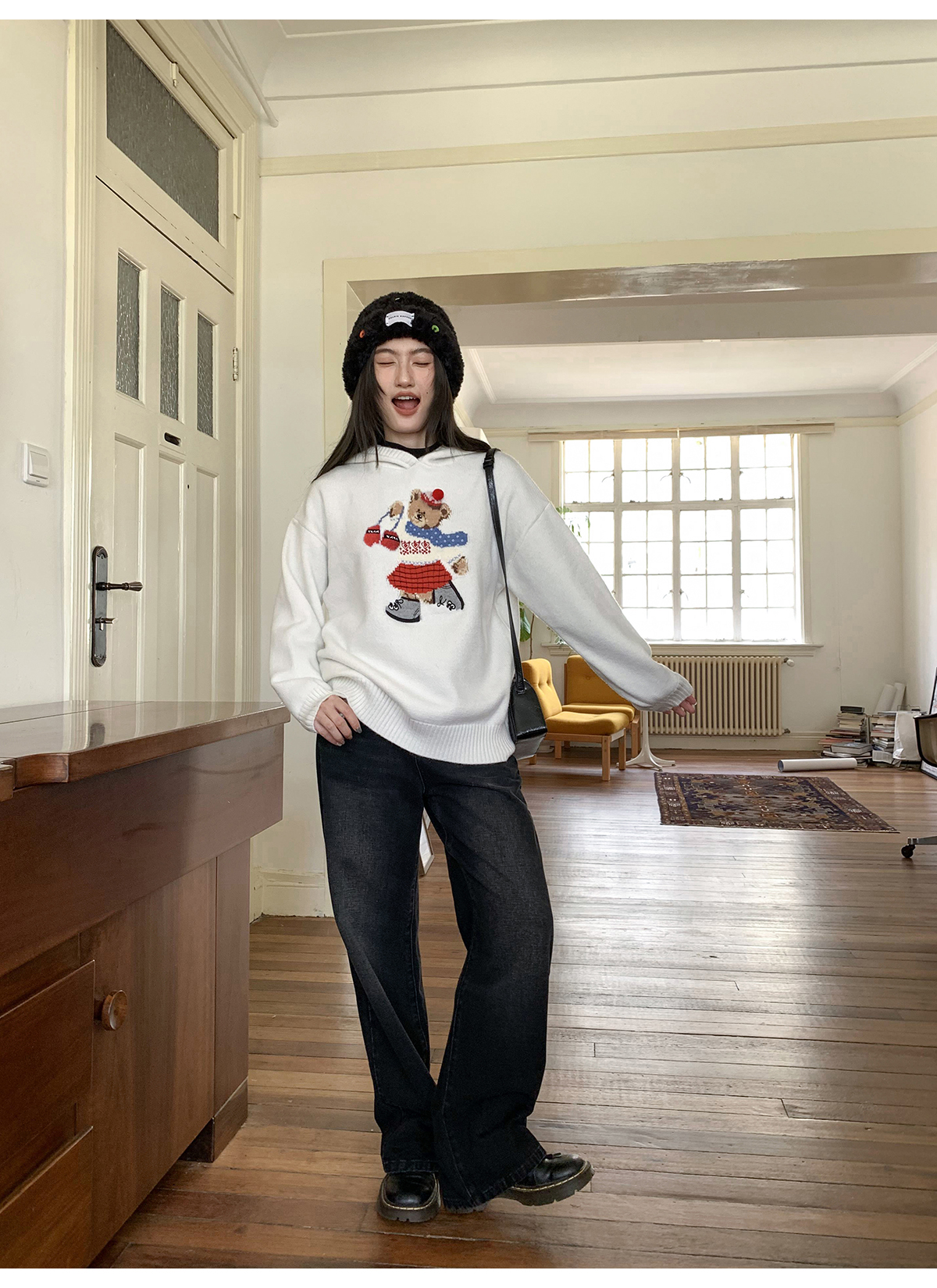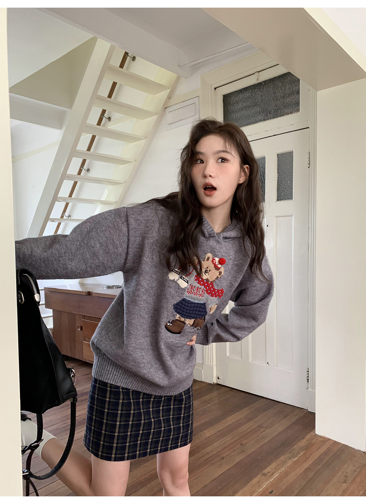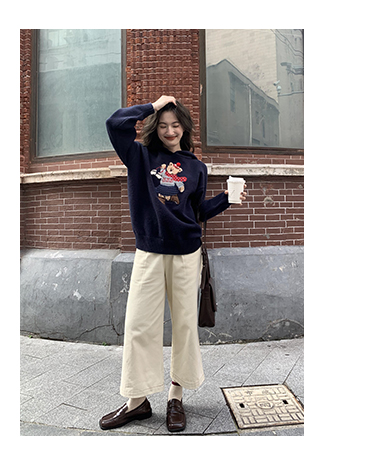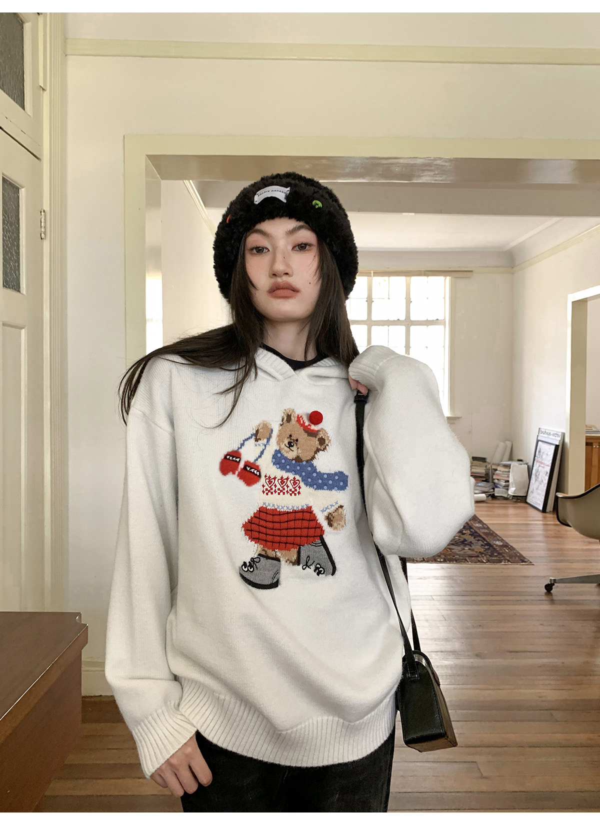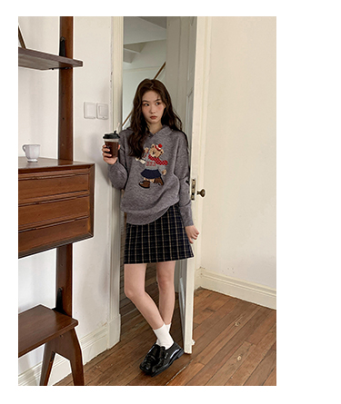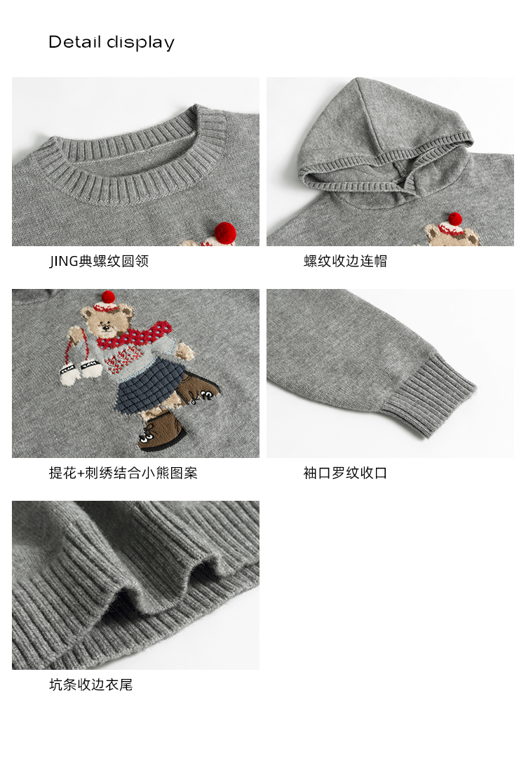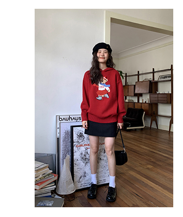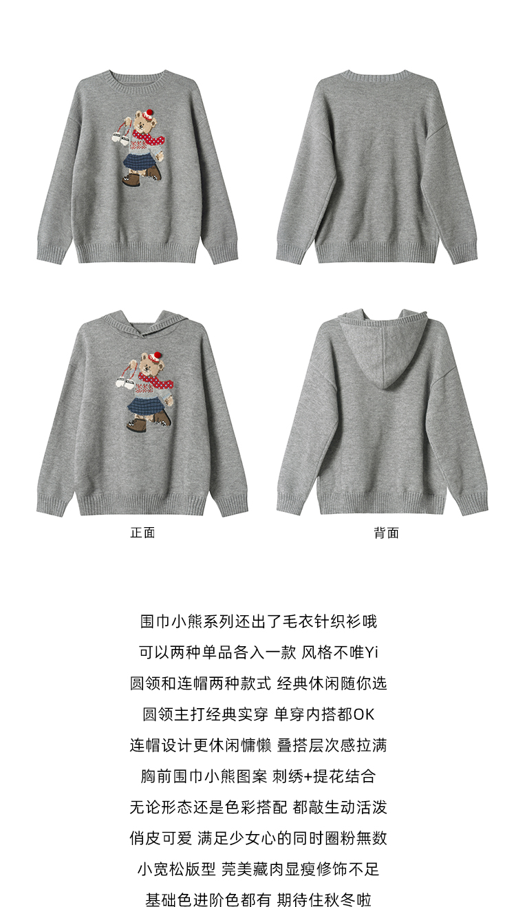 你好卡農 原創小熊提花圓領套頭毛衣女秋季新款寬鬆連帽針織上衣