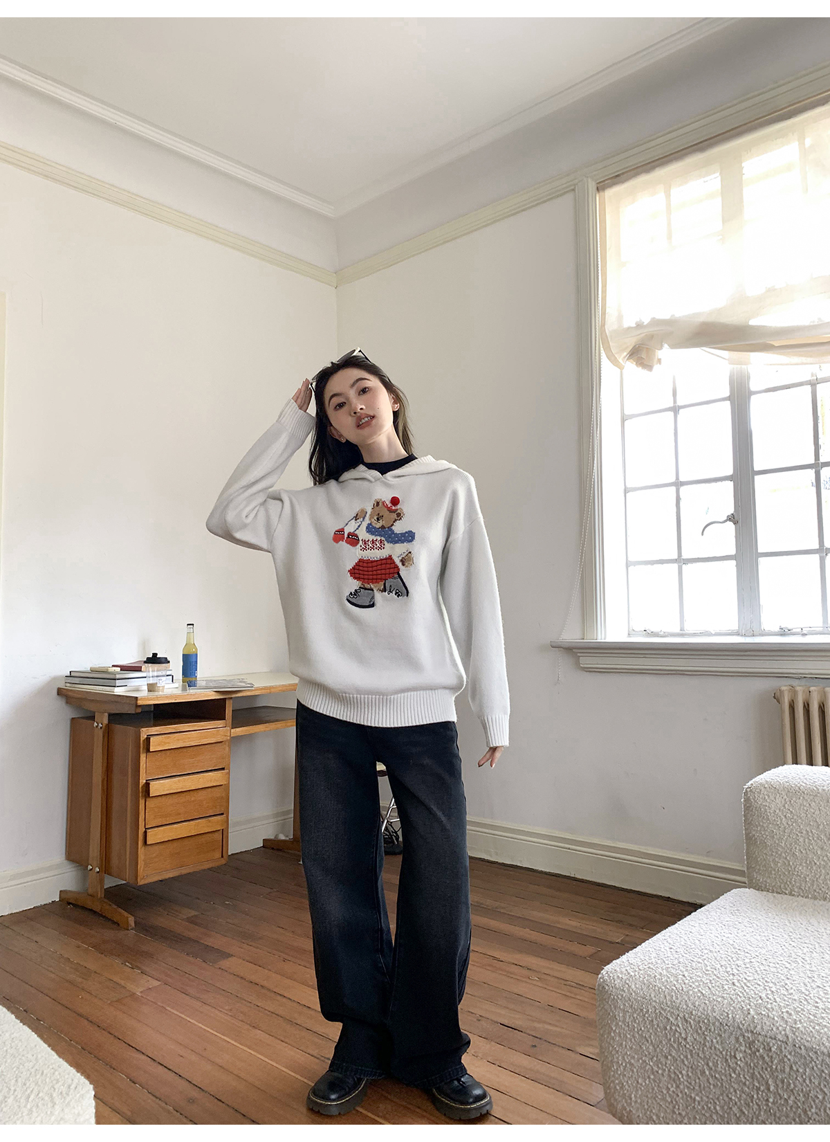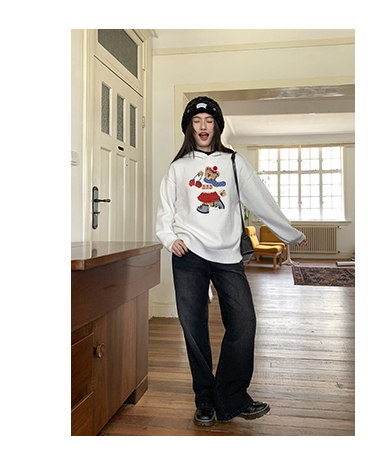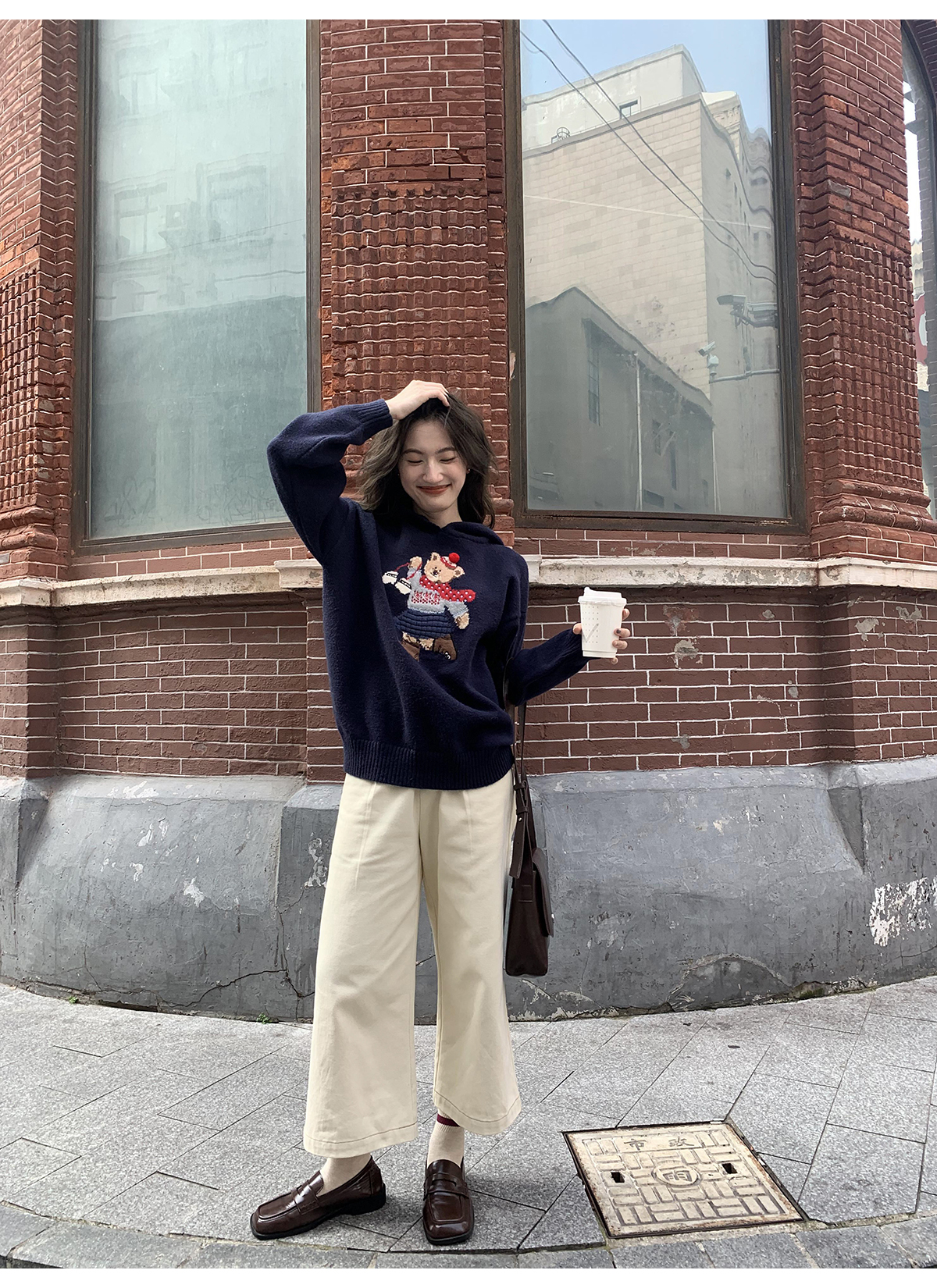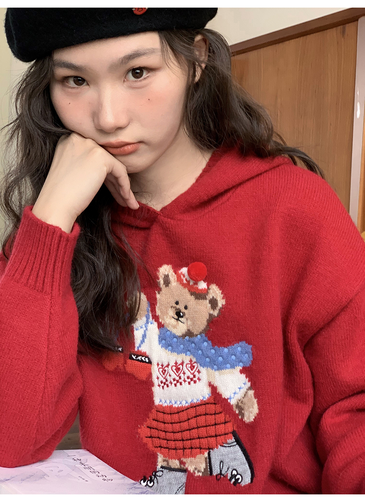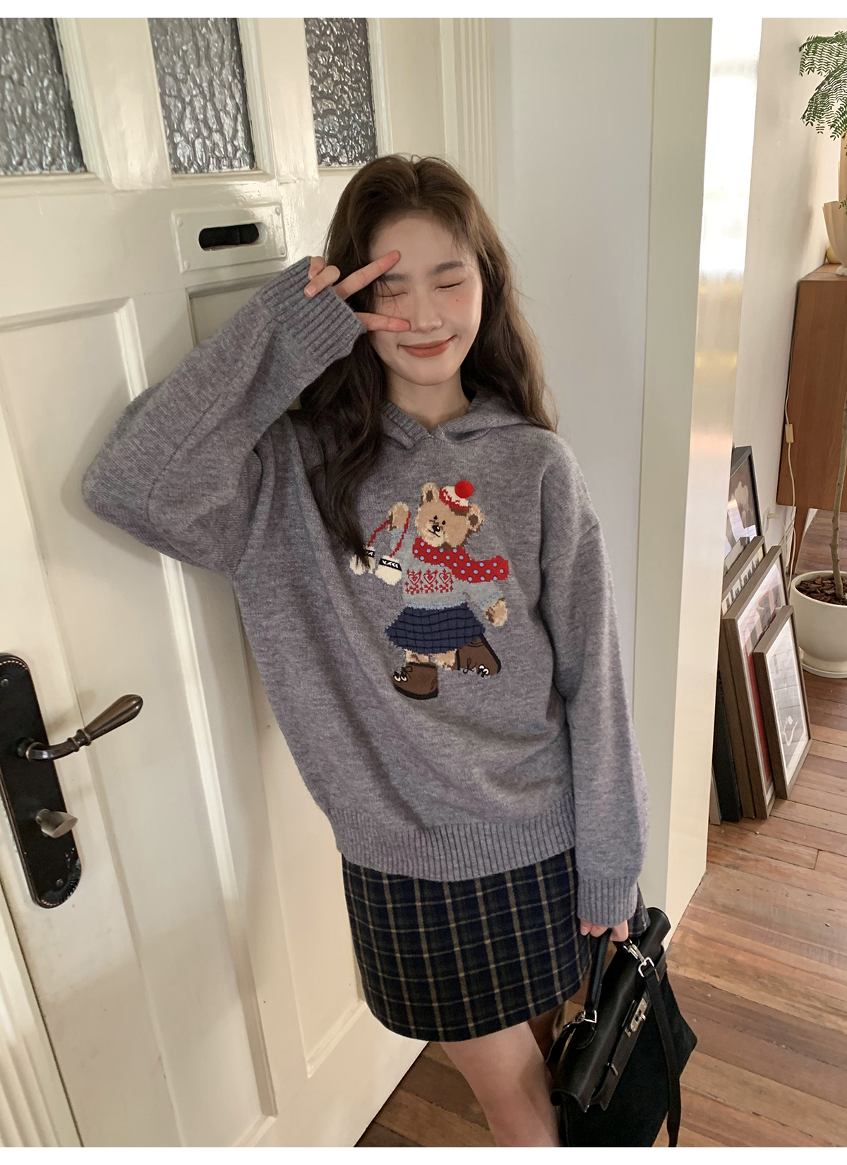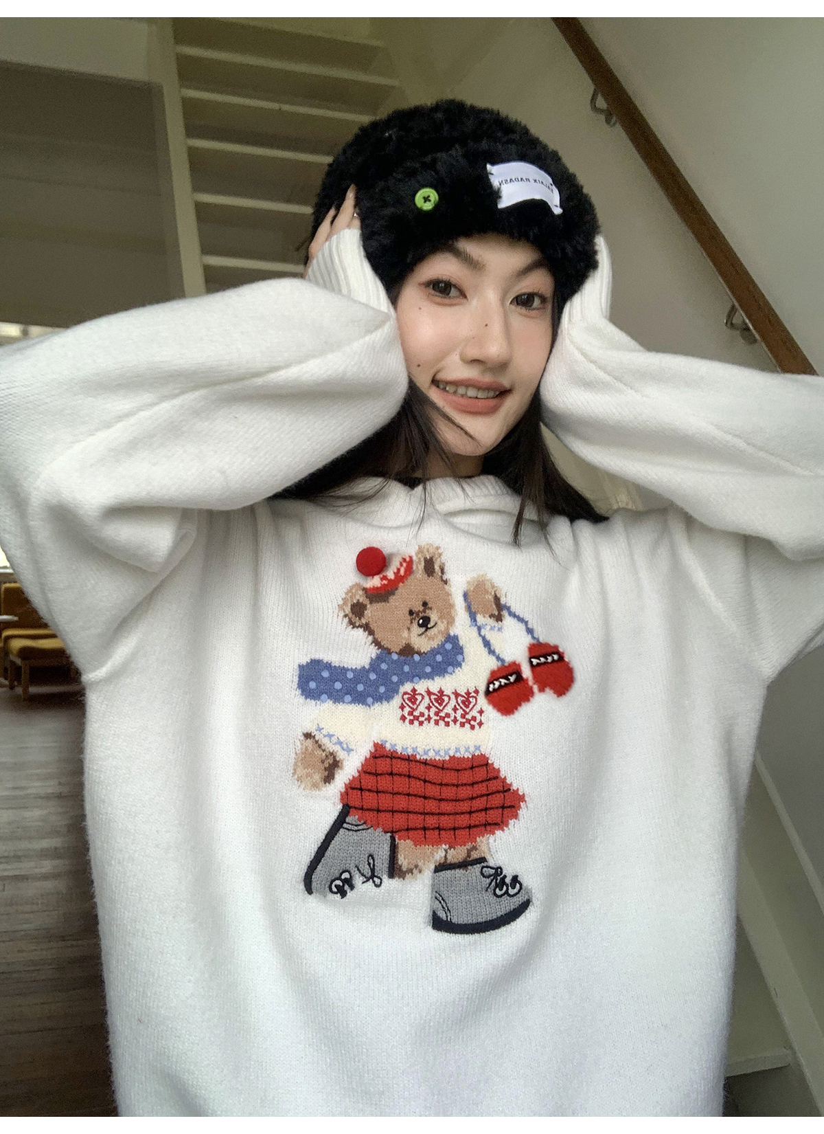 你好卡農 原創小熊提花圓領套頭毛衣女秋季新款寬鬆連帽針織上衣