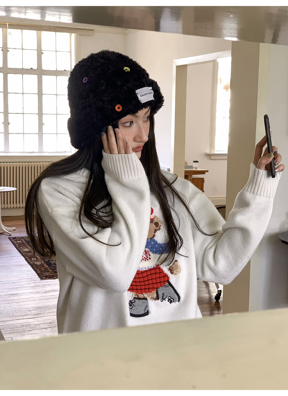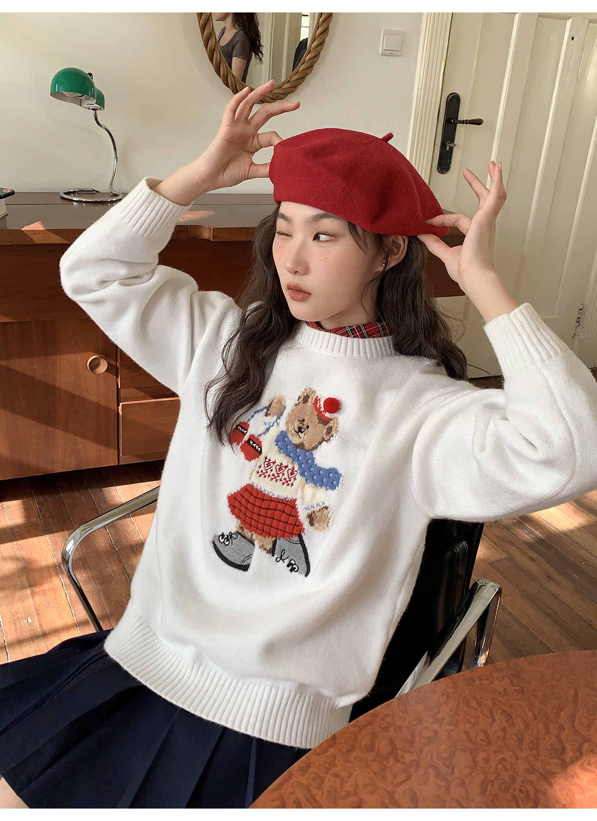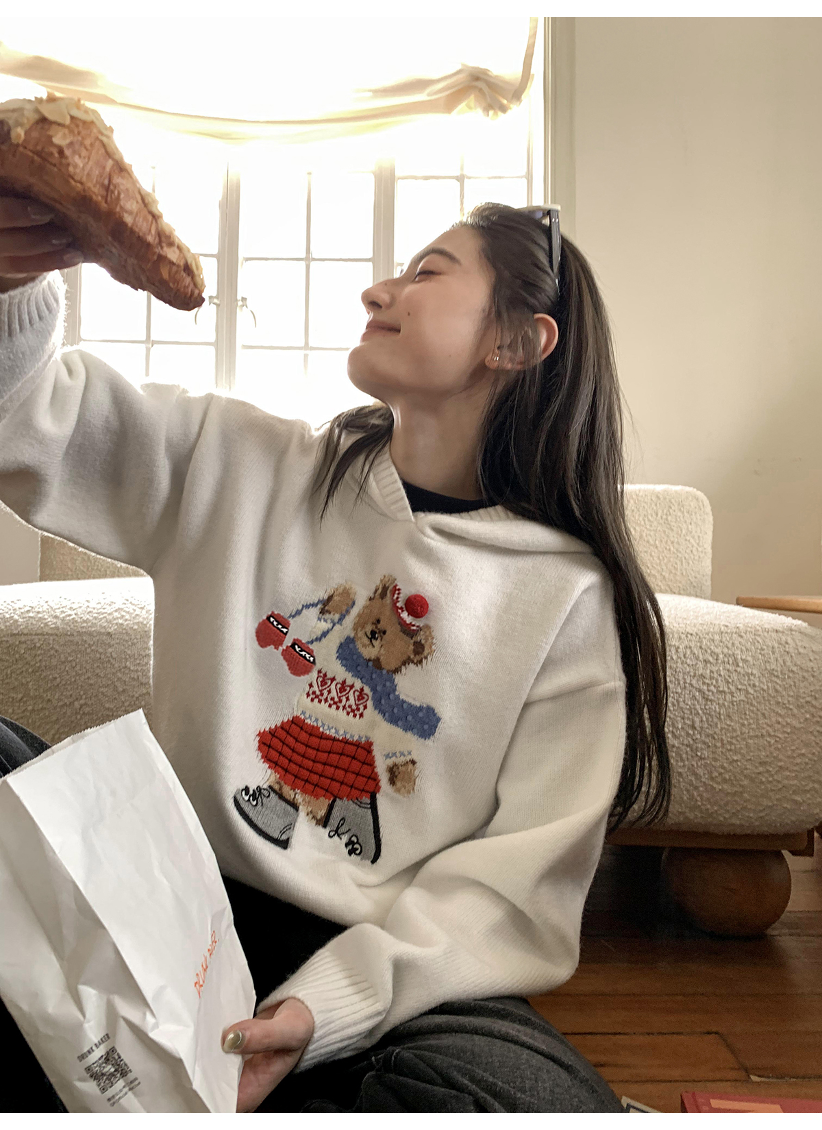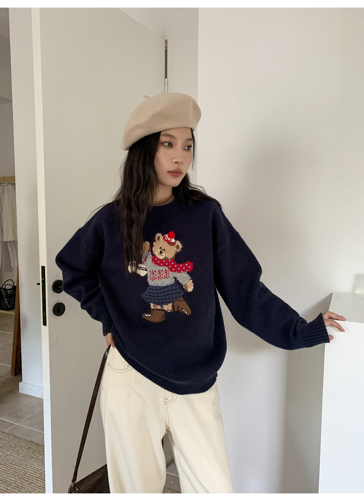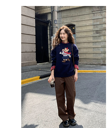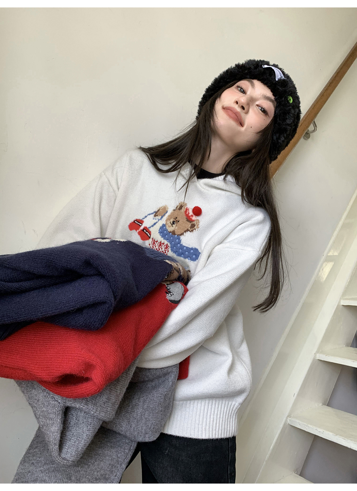 你好卡農 原創小熊提花圓領套頭毛衣女秋季新款寬鬆連帽針織上衣