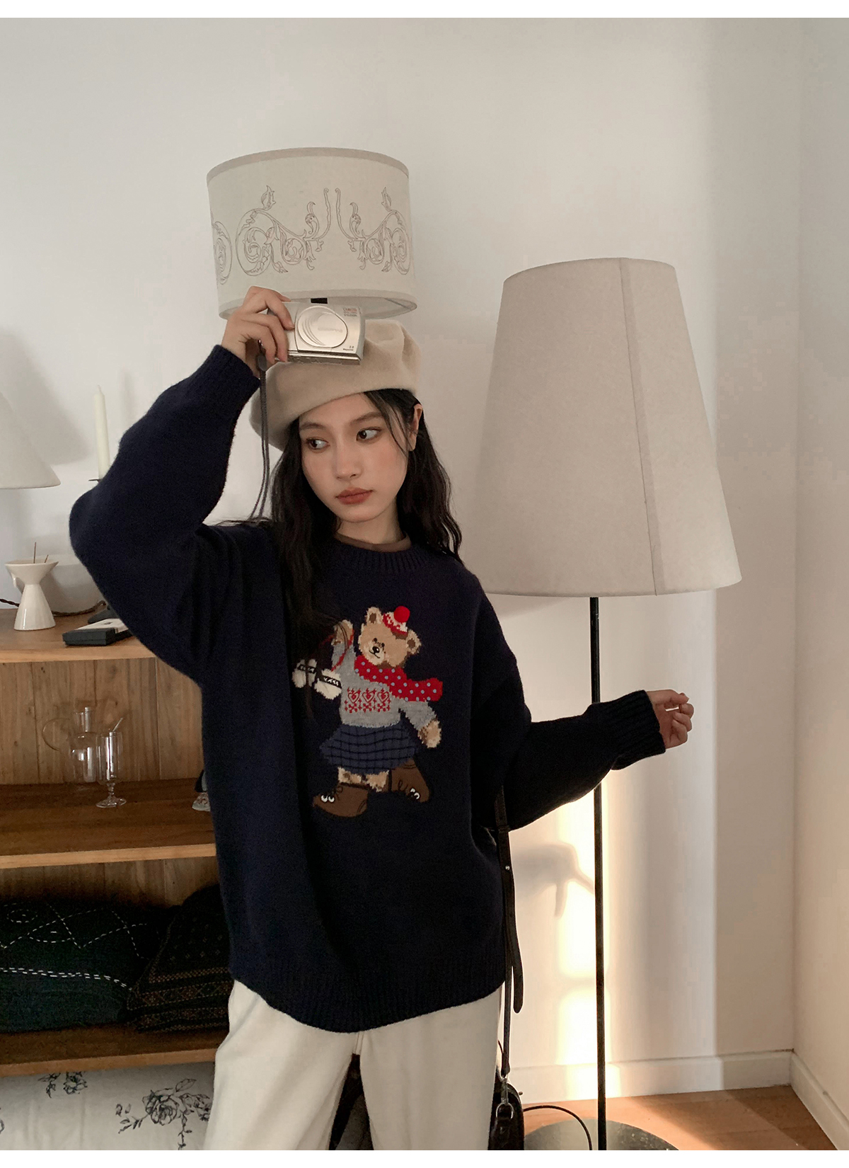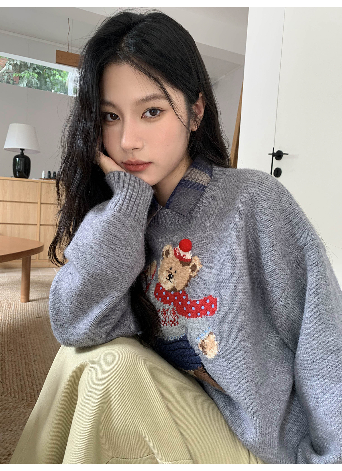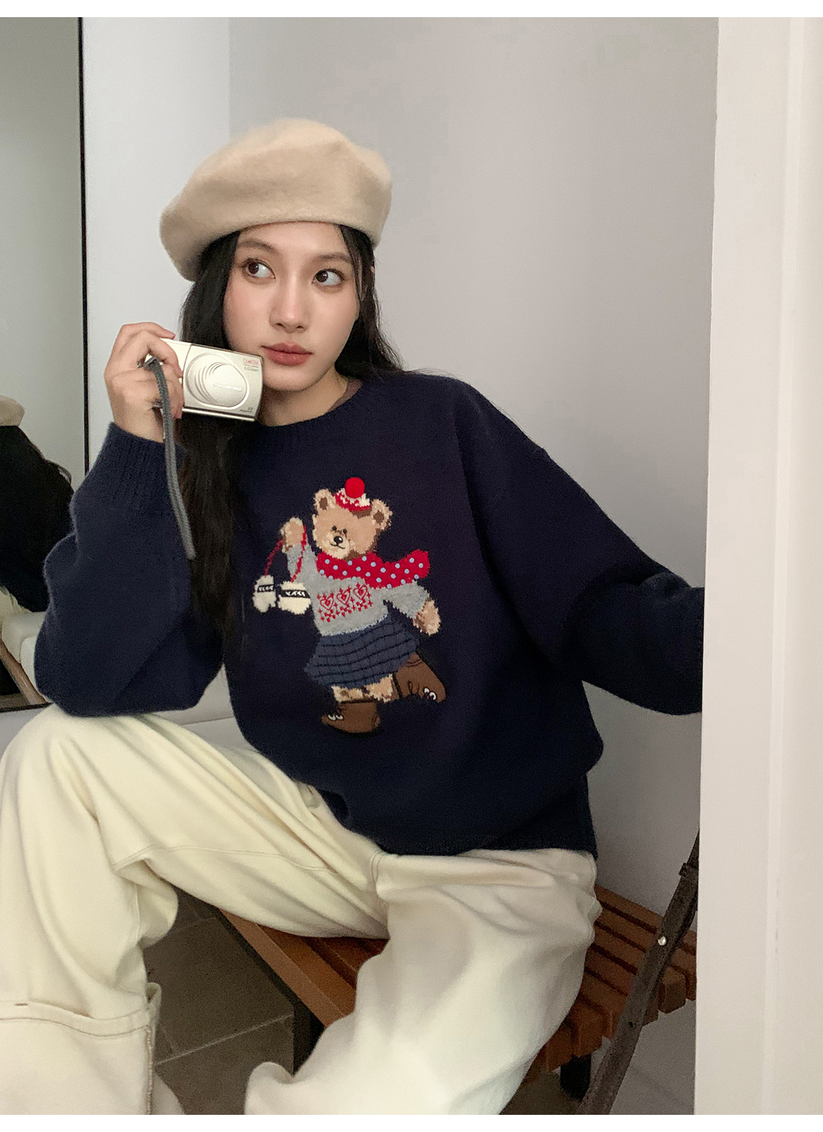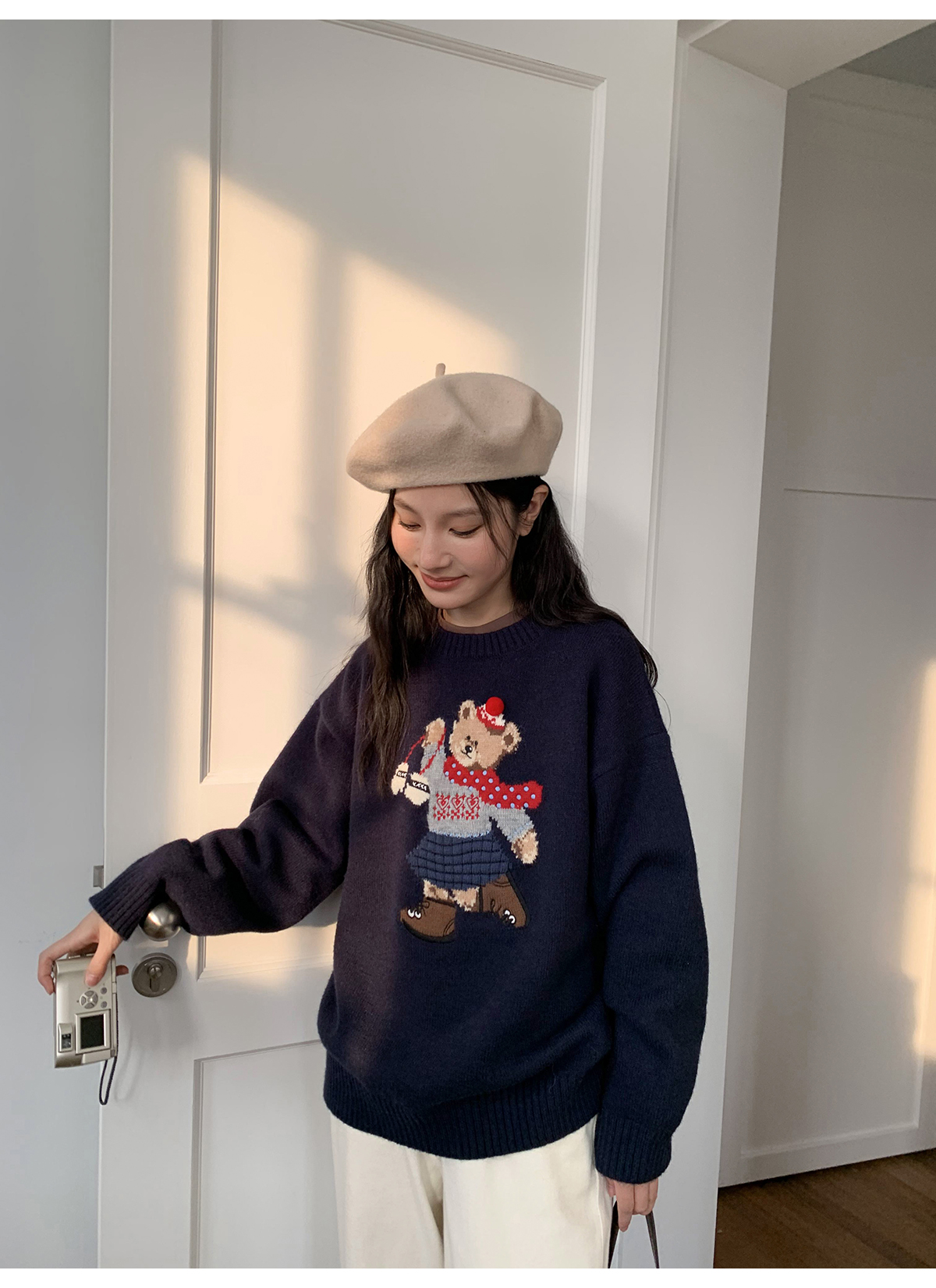 你好卡農 原創小熊提花圓領套頭毛衣女秋季新款寬鬆連帽針織上衣