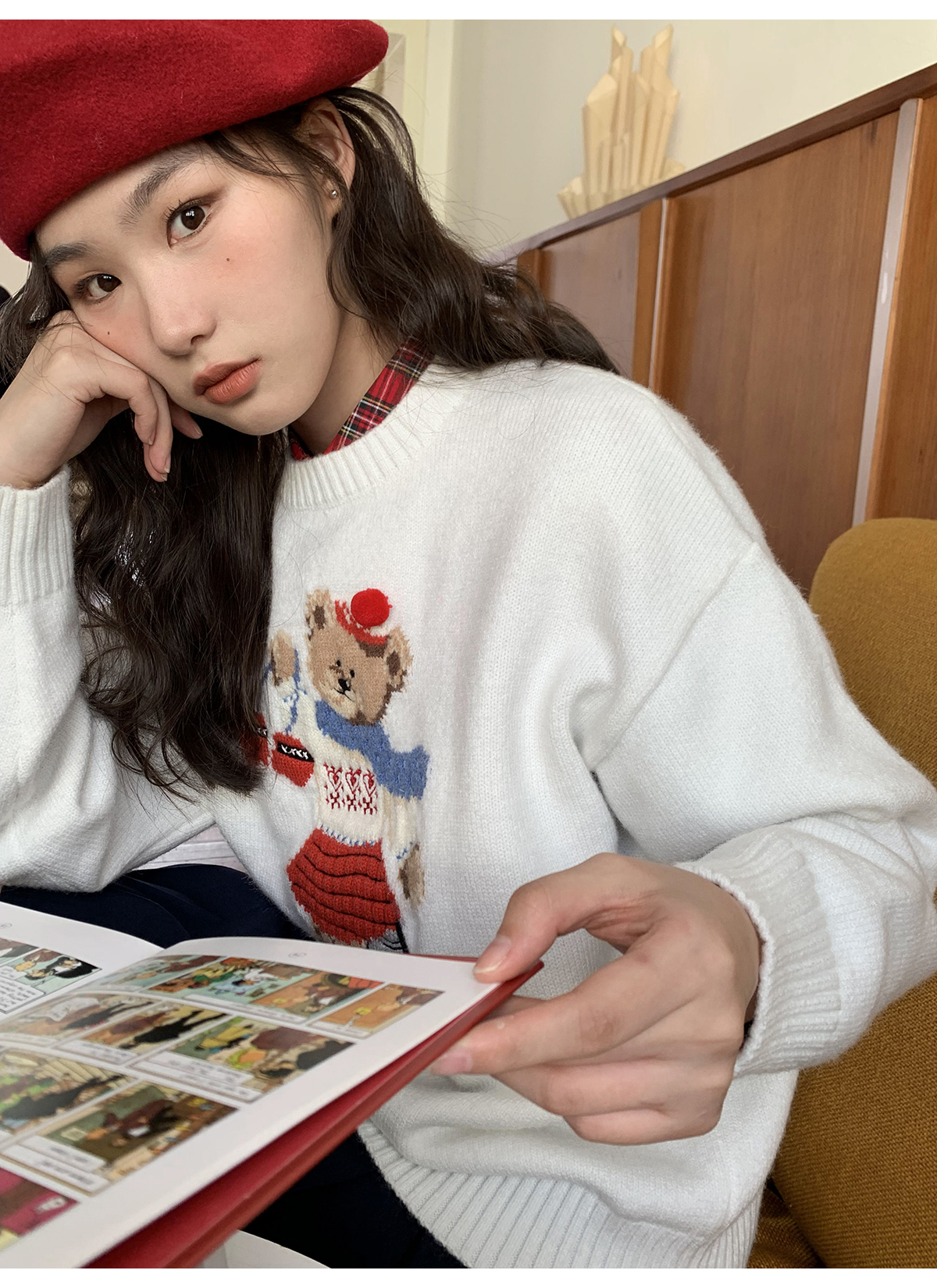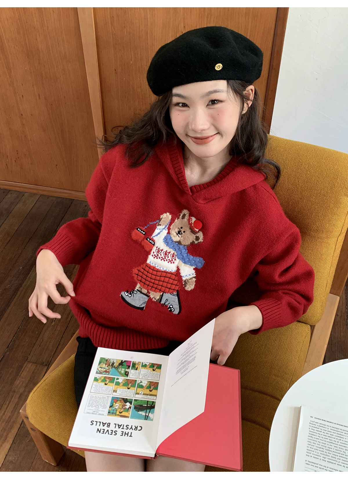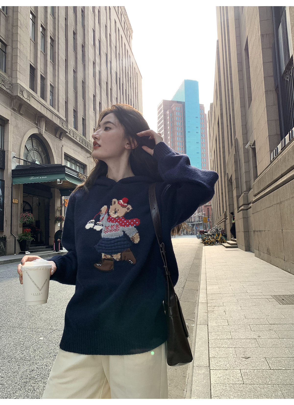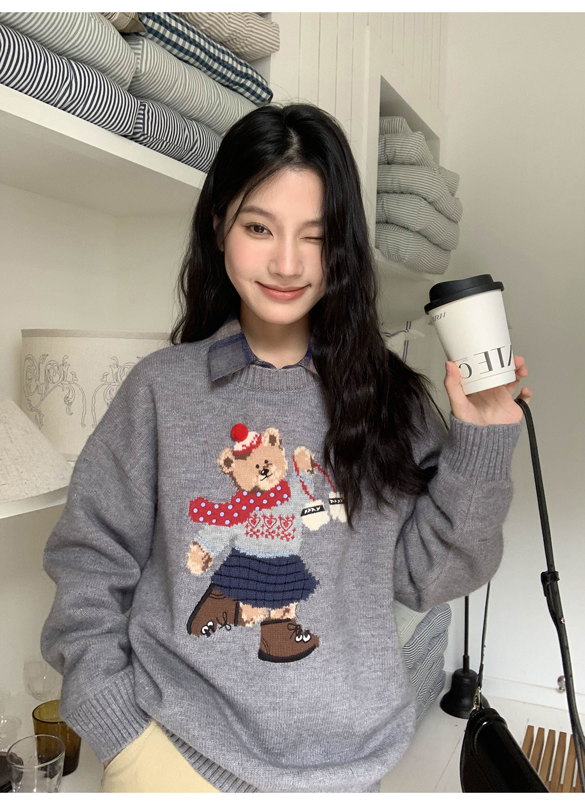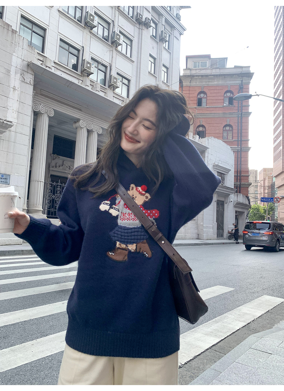 你好卡農 原創小熊提花圓領套頭毛衣女秋季新款寬鬆連帽針織上衣