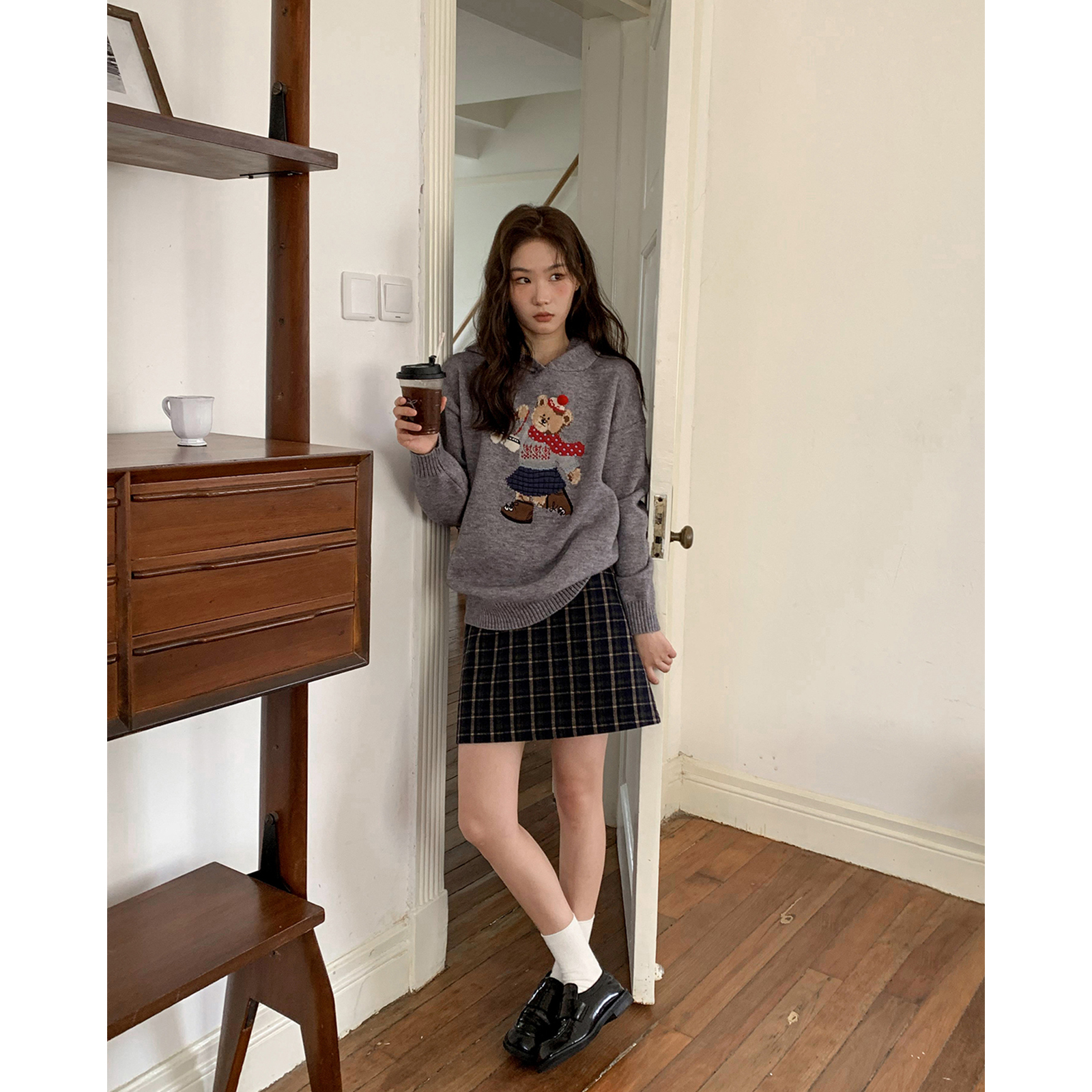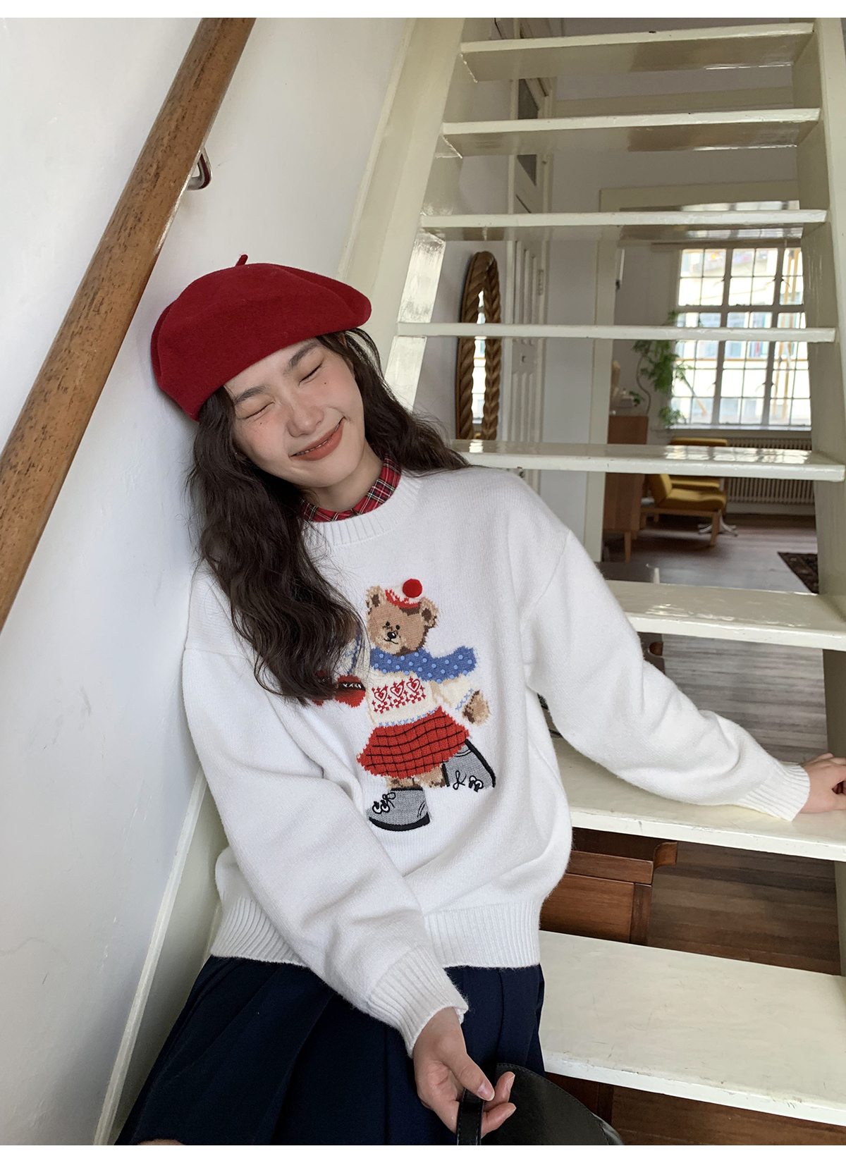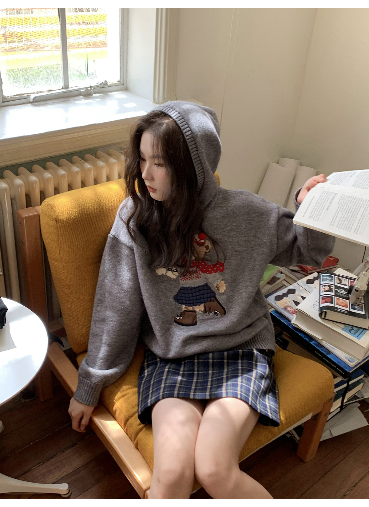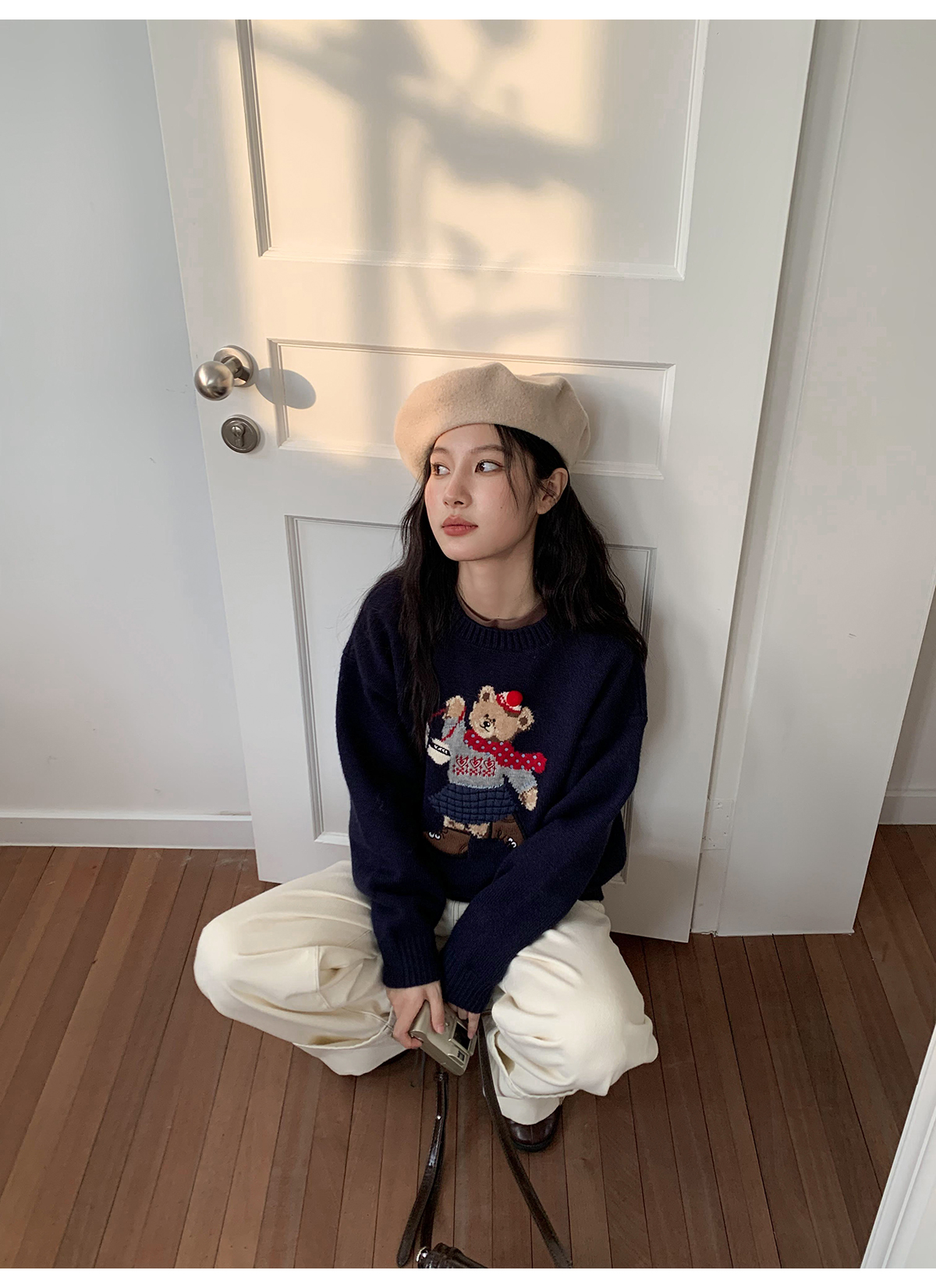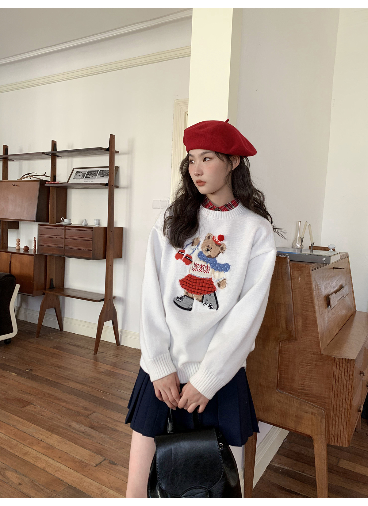 你好卡農 原創小熊提花圓領套頭毛衣女秋季新款寬鬆連帽針織上衣
