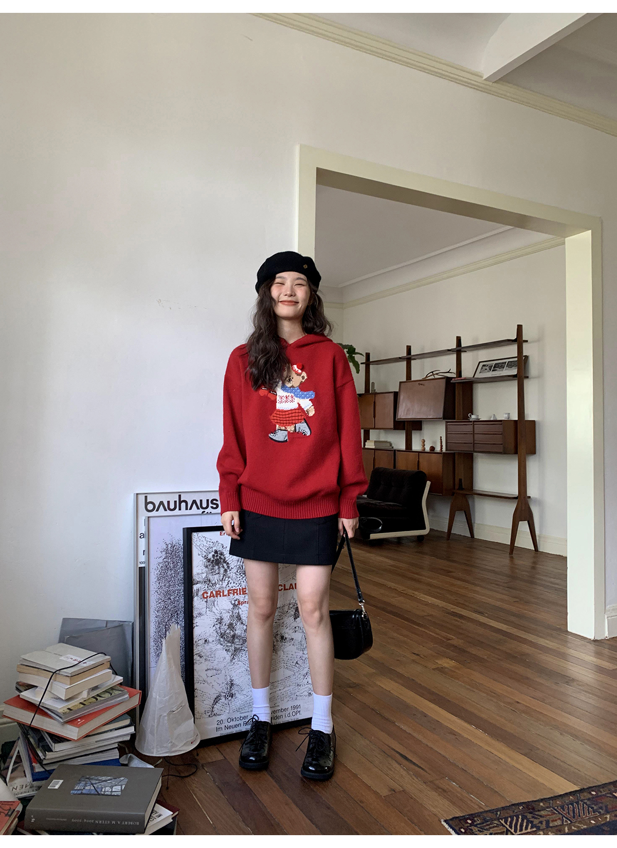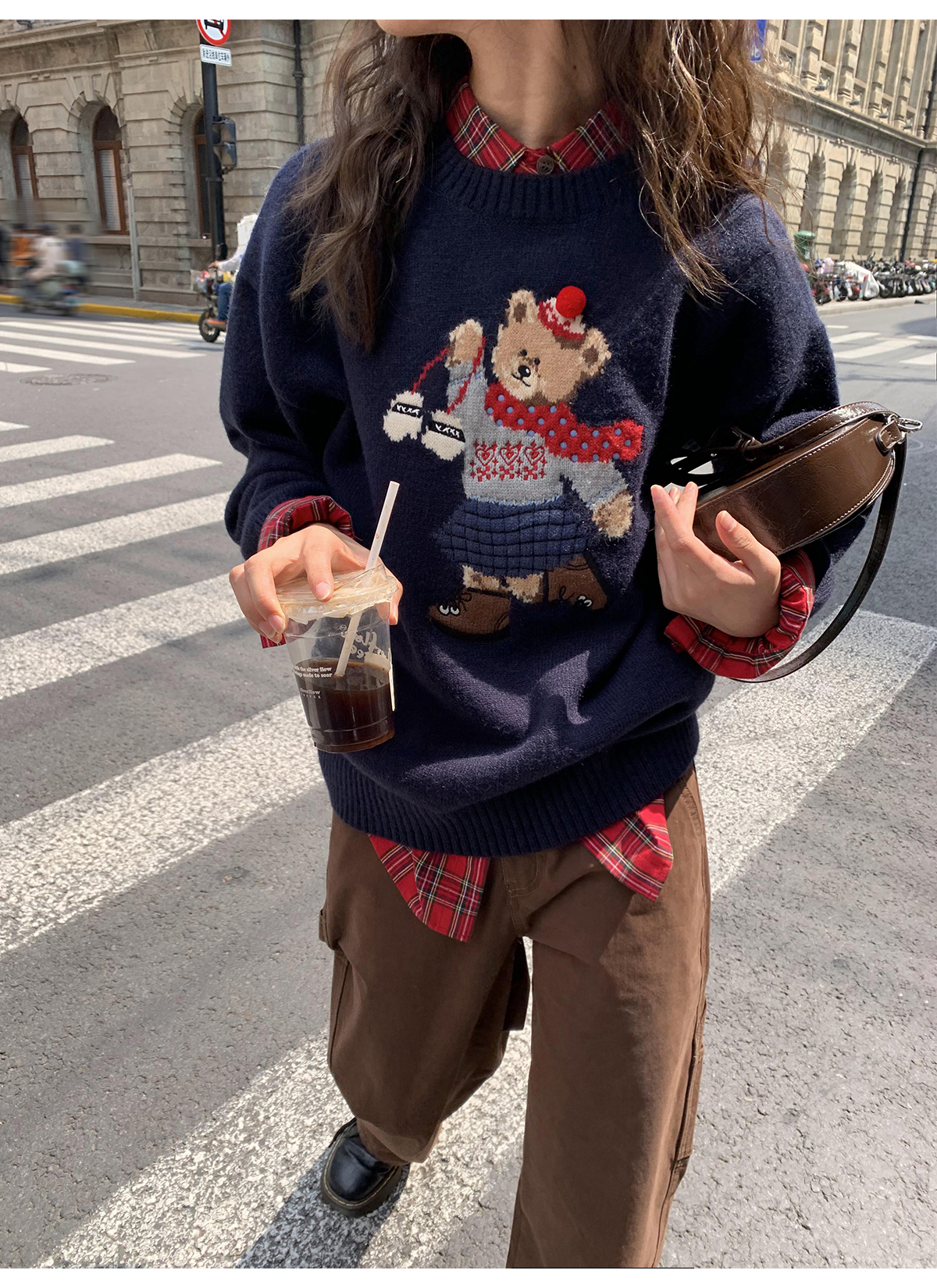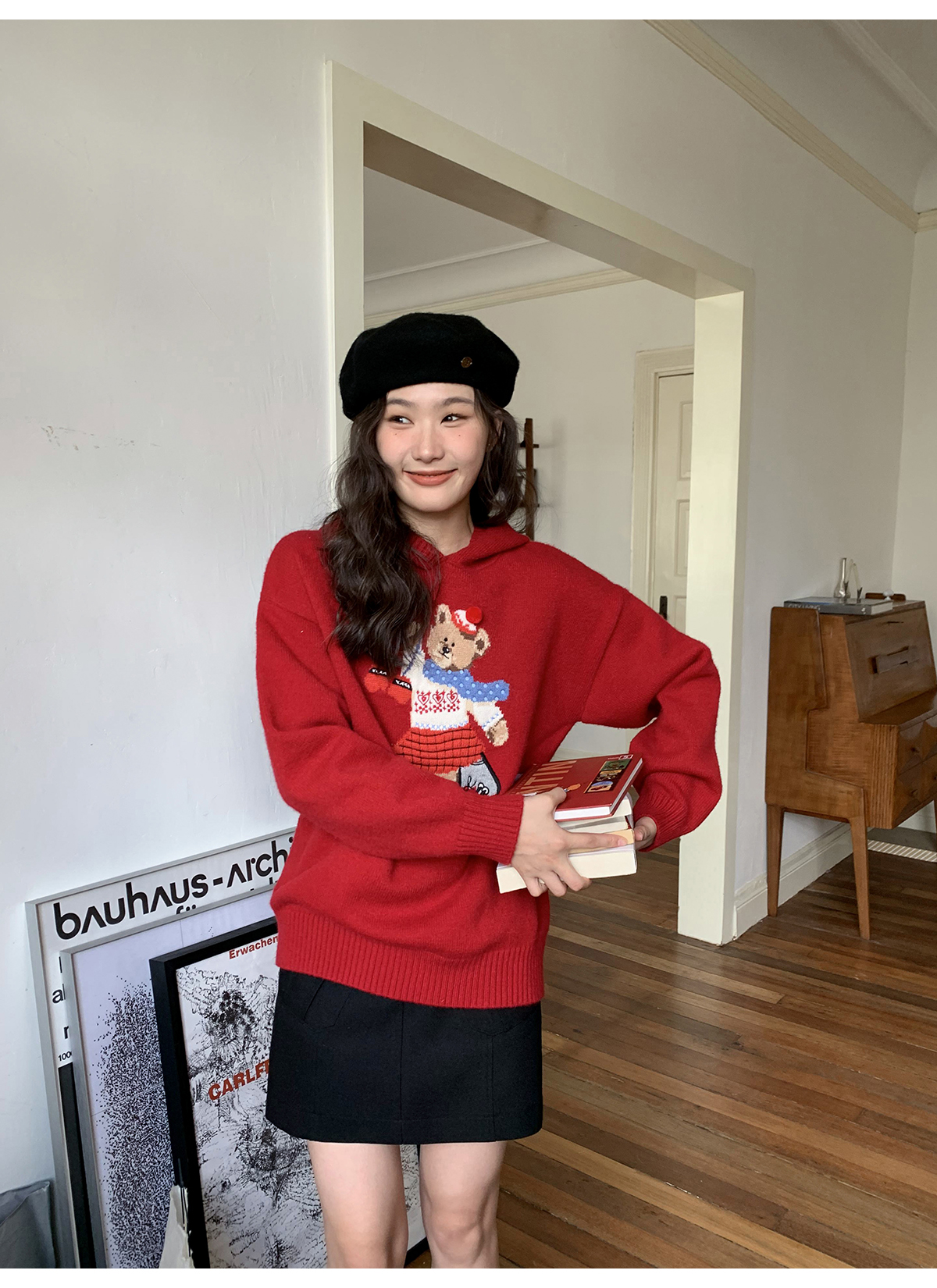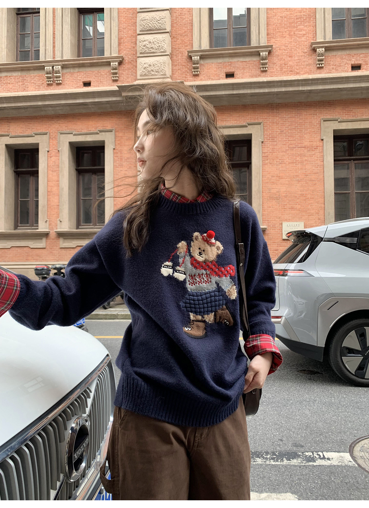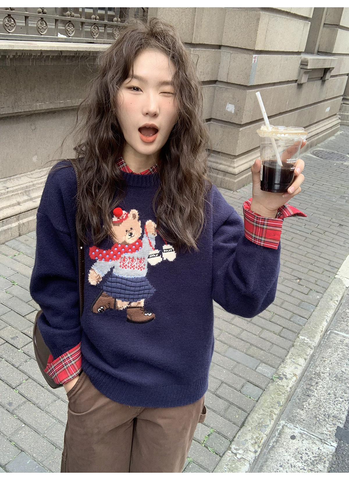 你好卡農 原創小熊提花圓領套頭毛衣女秋季新款寬鬆連帽針織上衣