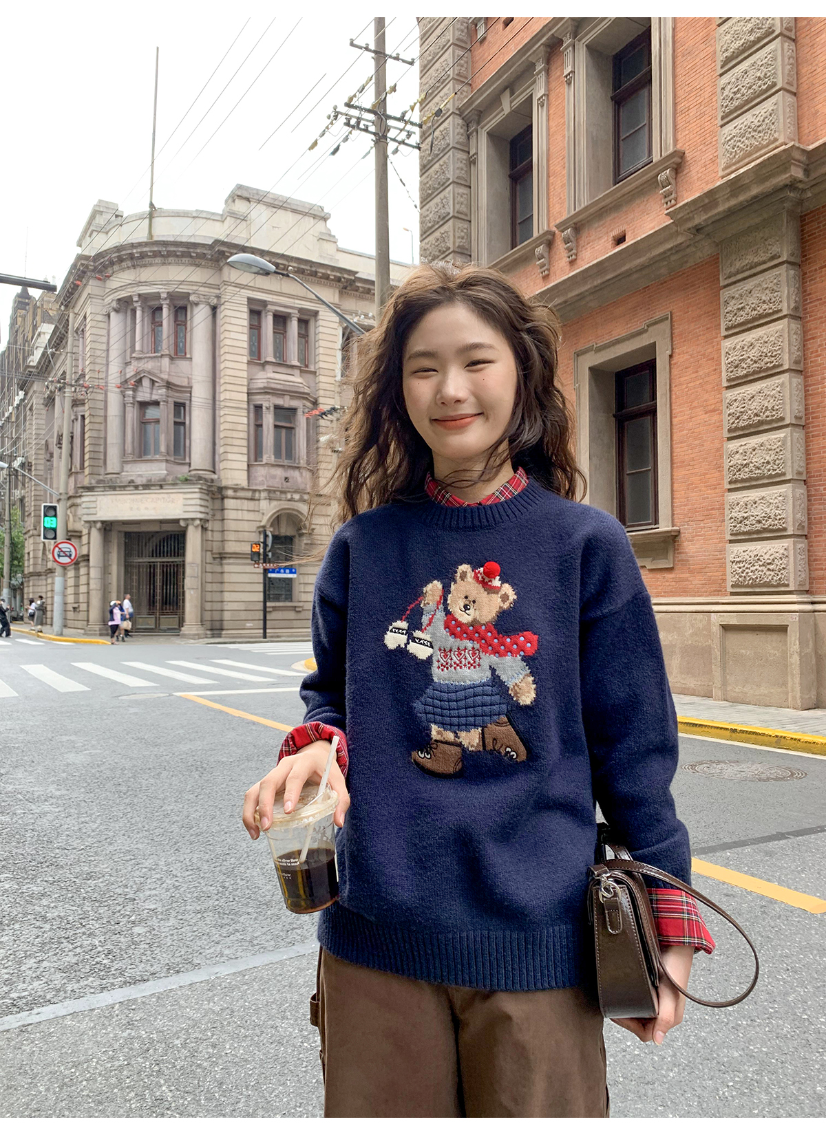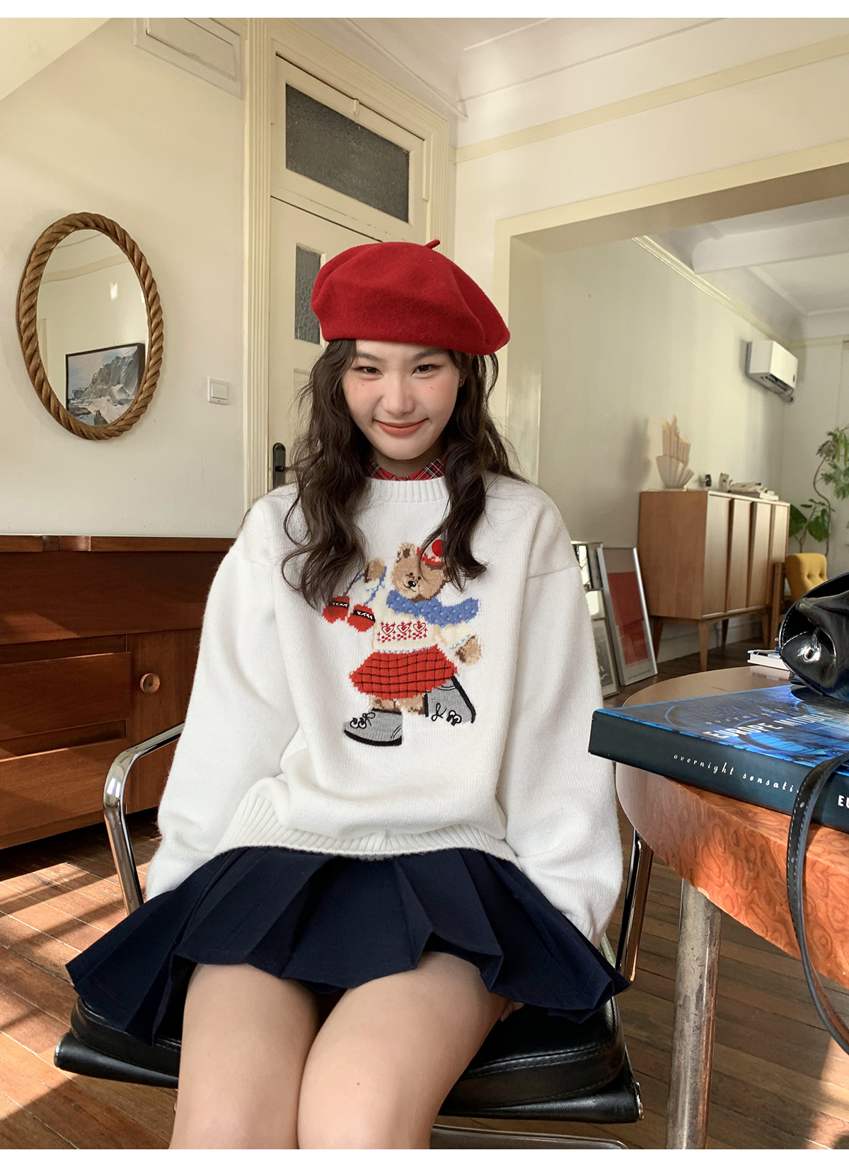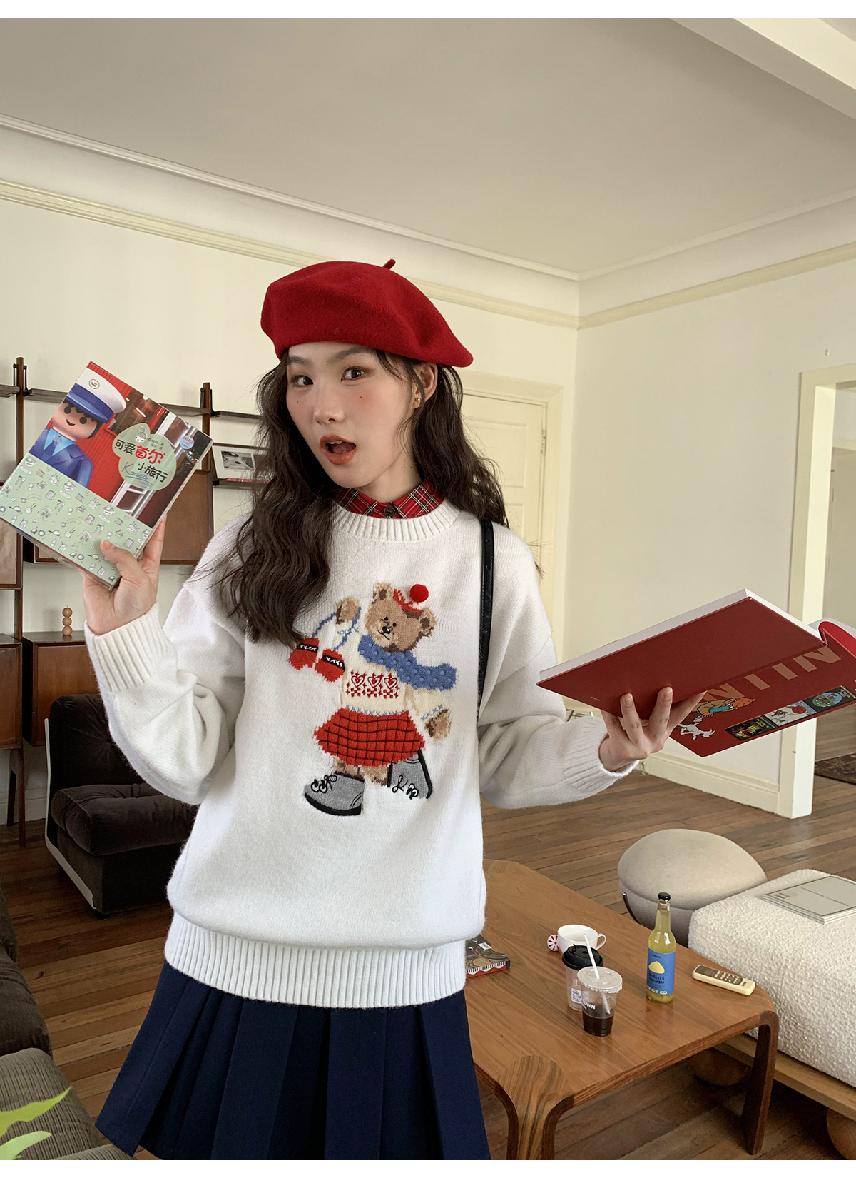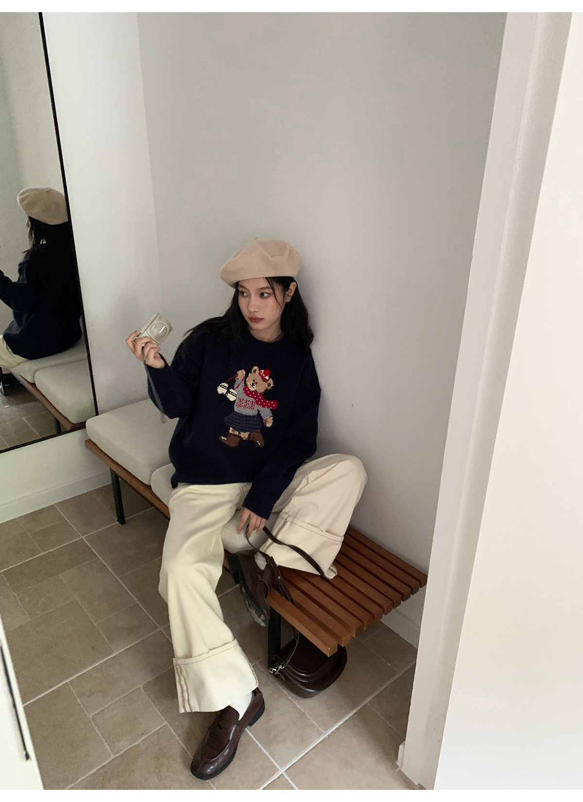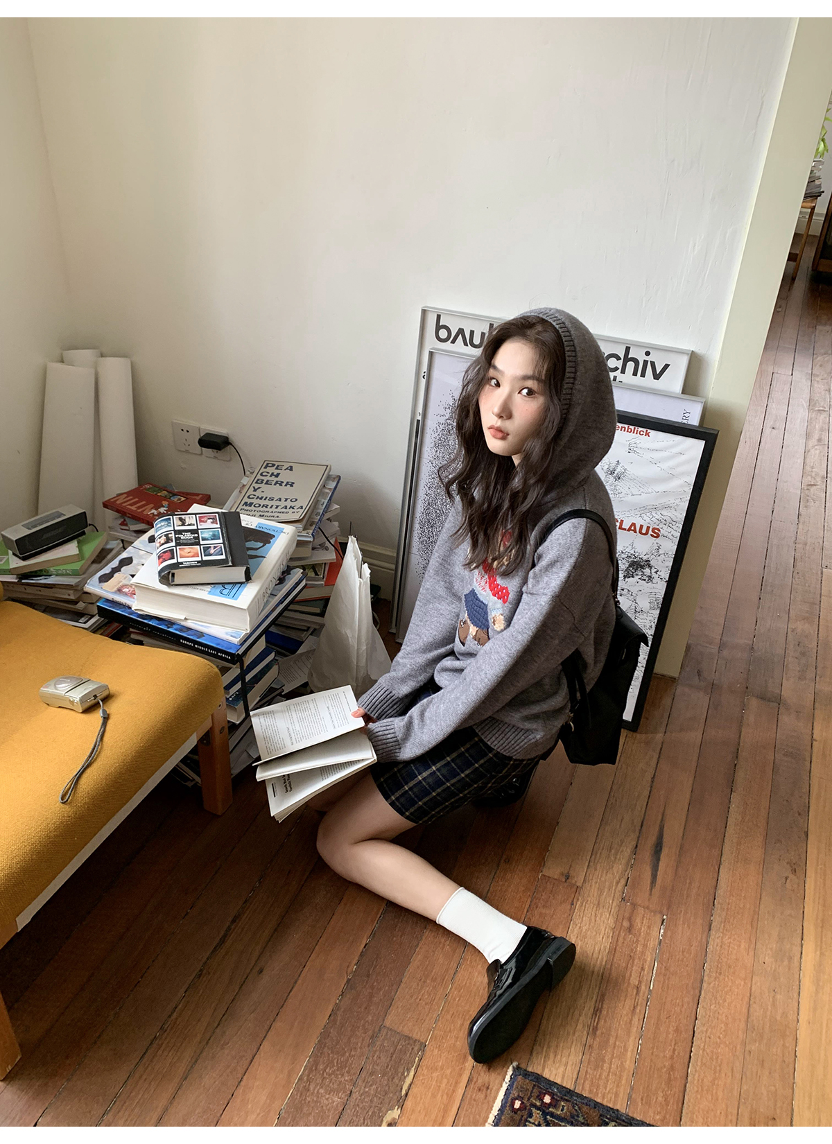 你好卡農 原創小熊提花圓領套頭毛衣女秋季新款寬鬆連帽針織上衣