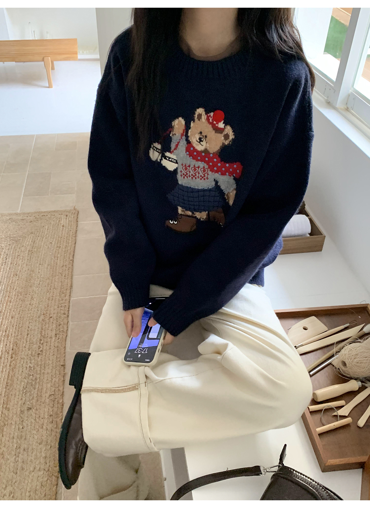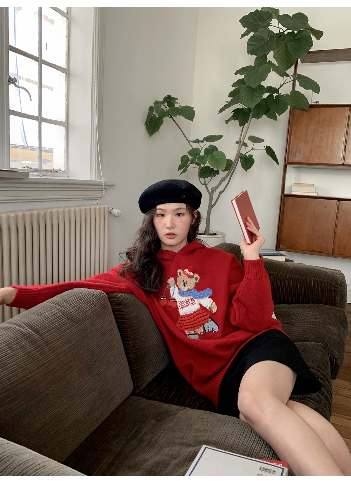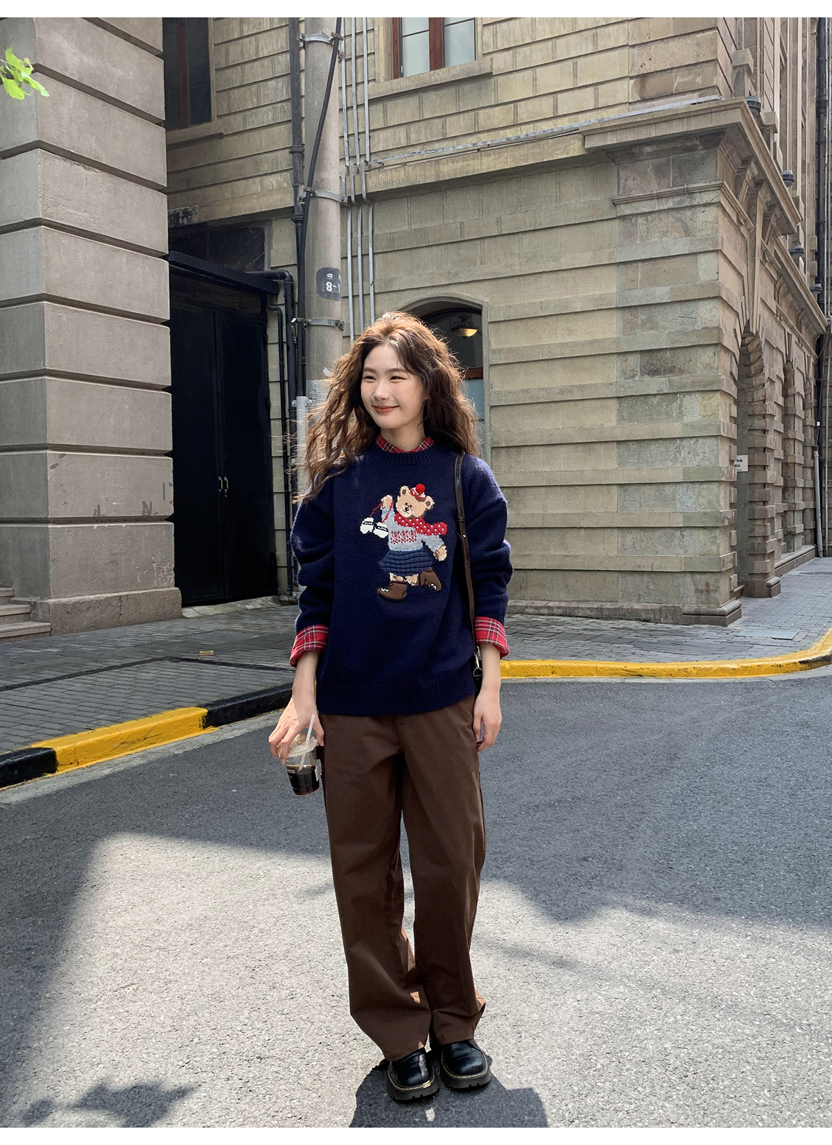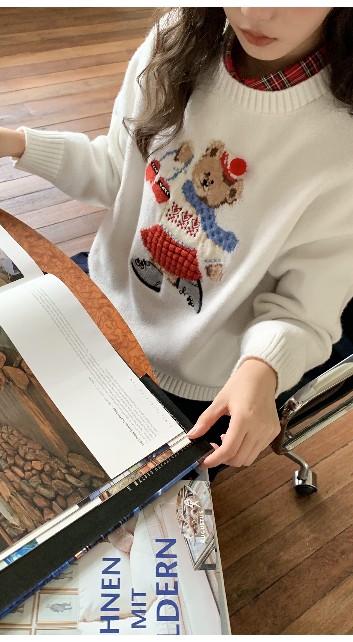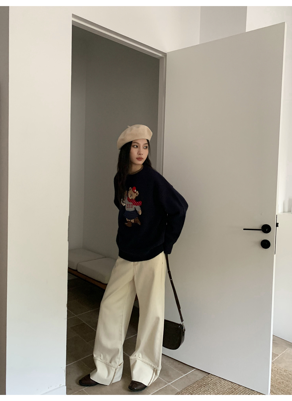 你好卡農 原創小熊提花圓領套頭毛衣女秋季新款寬鬆連帽針織上衣