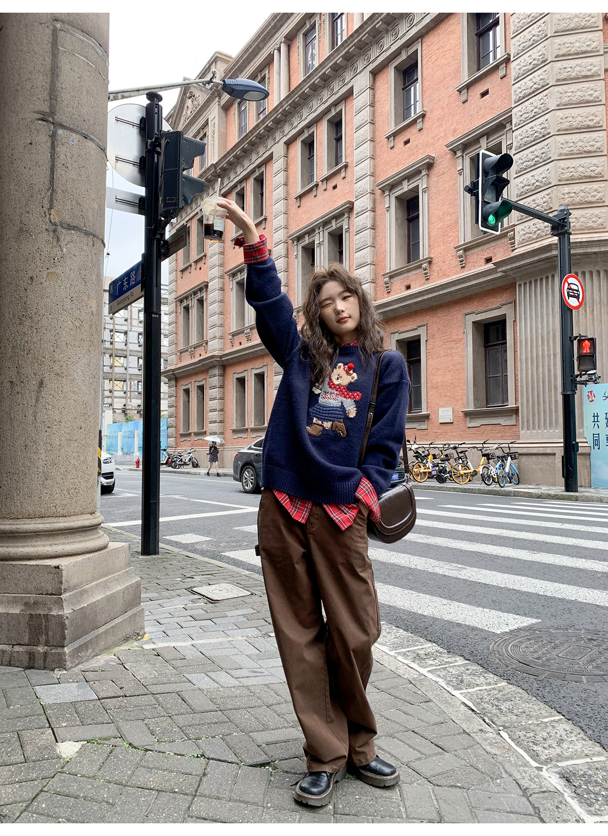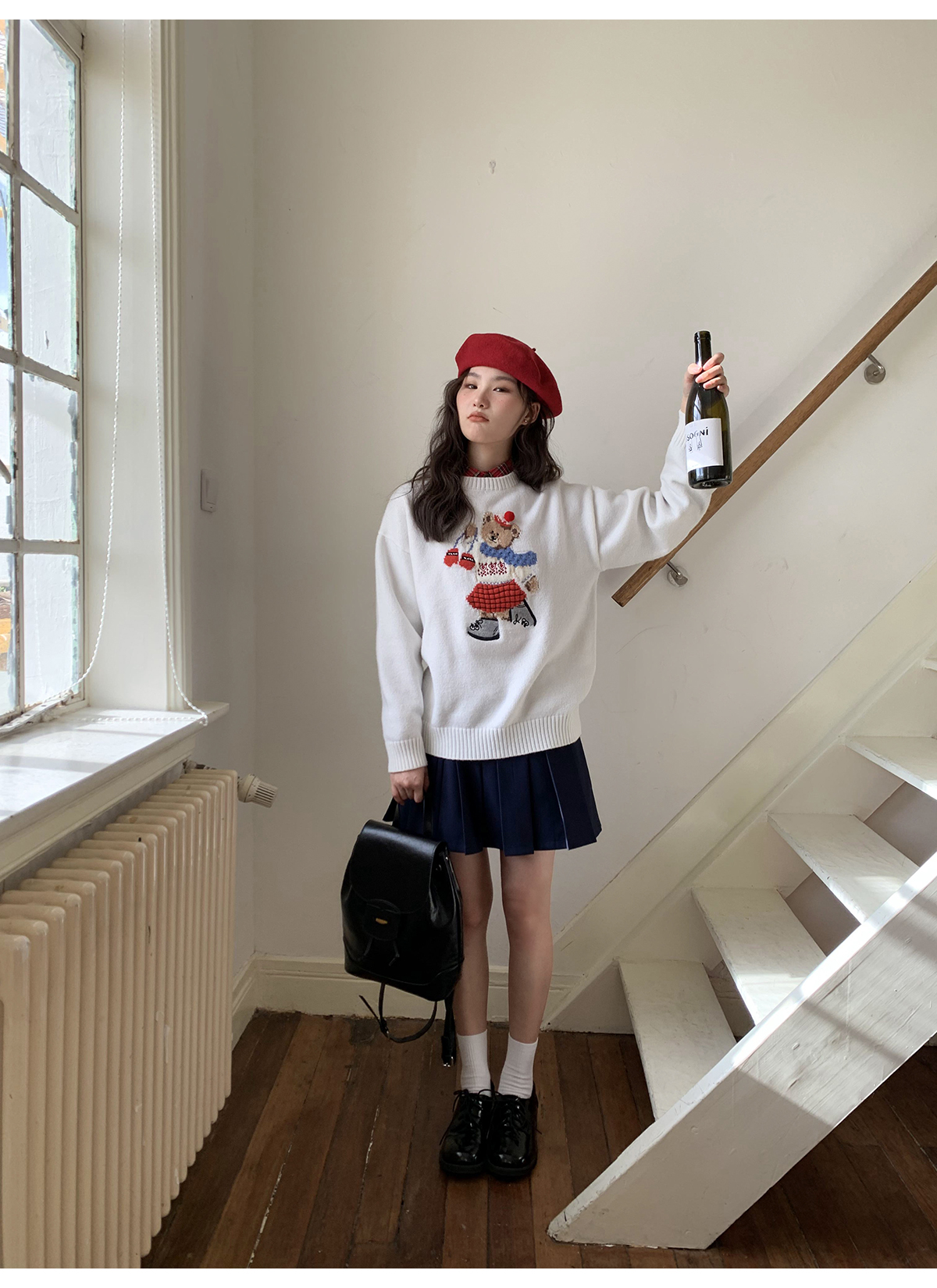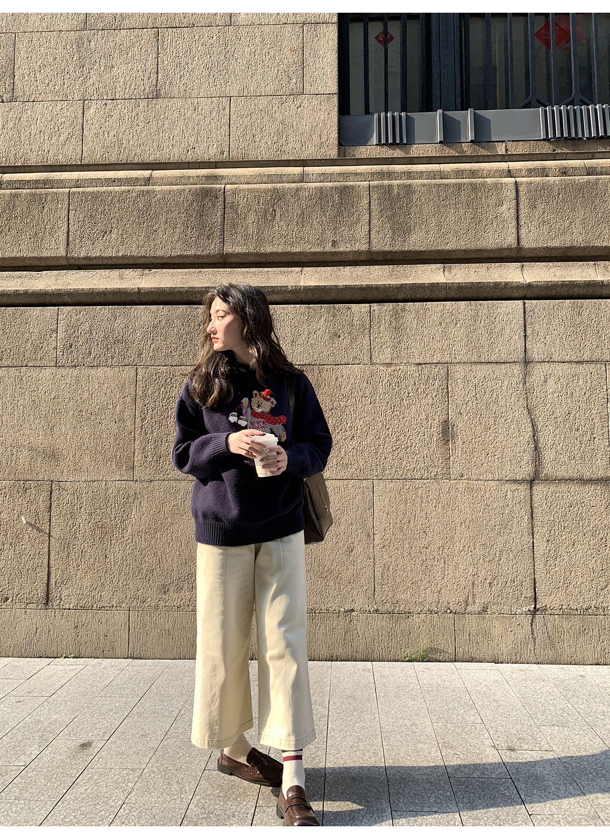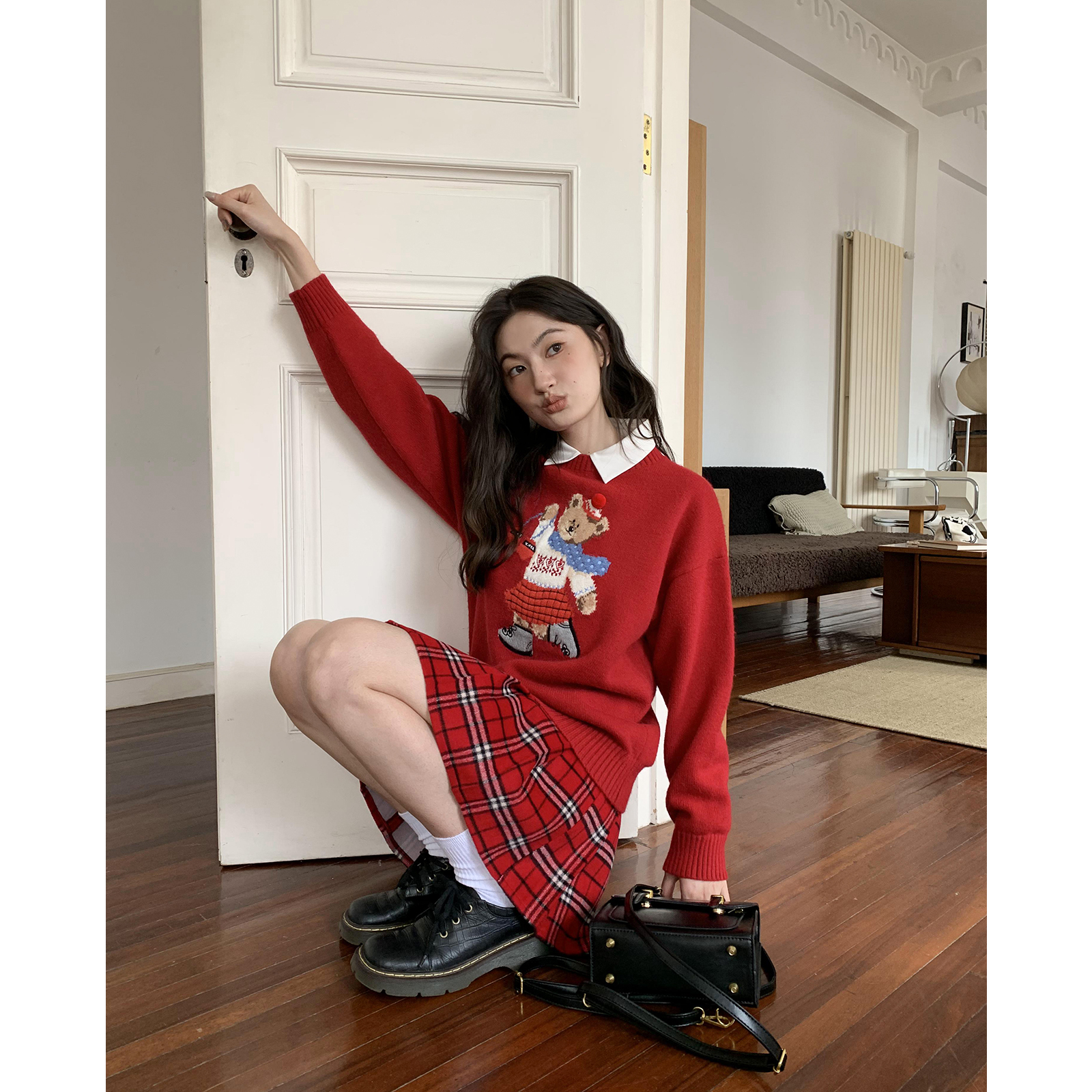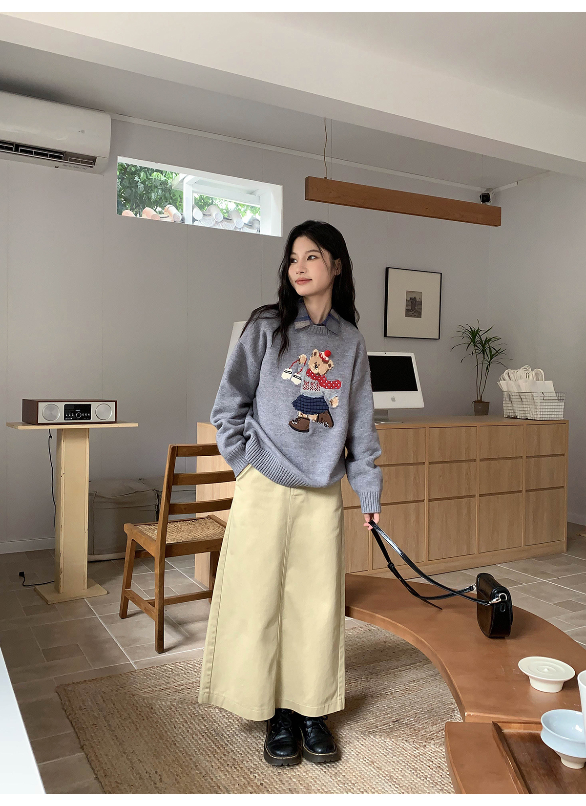 你好卡農 原創小熊提花圓領套頭毛衣女秋季新款寬鬆連帽針織上衣
