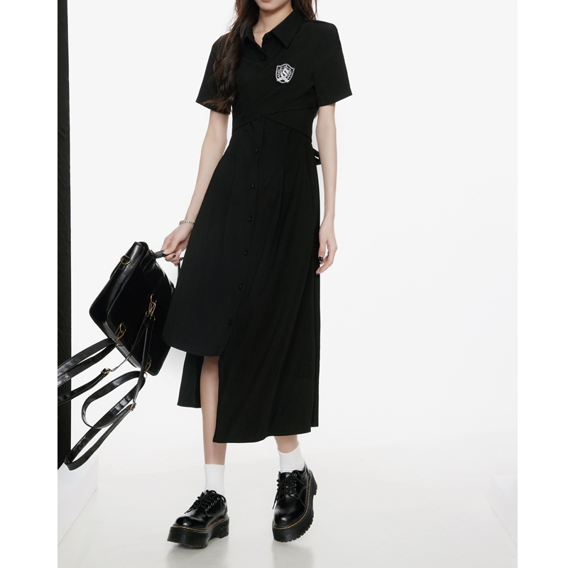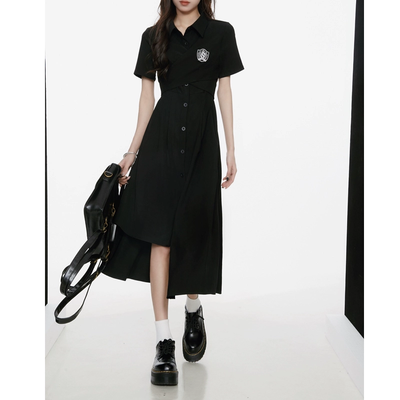 學院風黑色polo領顯瘦洋裝夏女小個子辣妹風減齡不規則下擺長裙