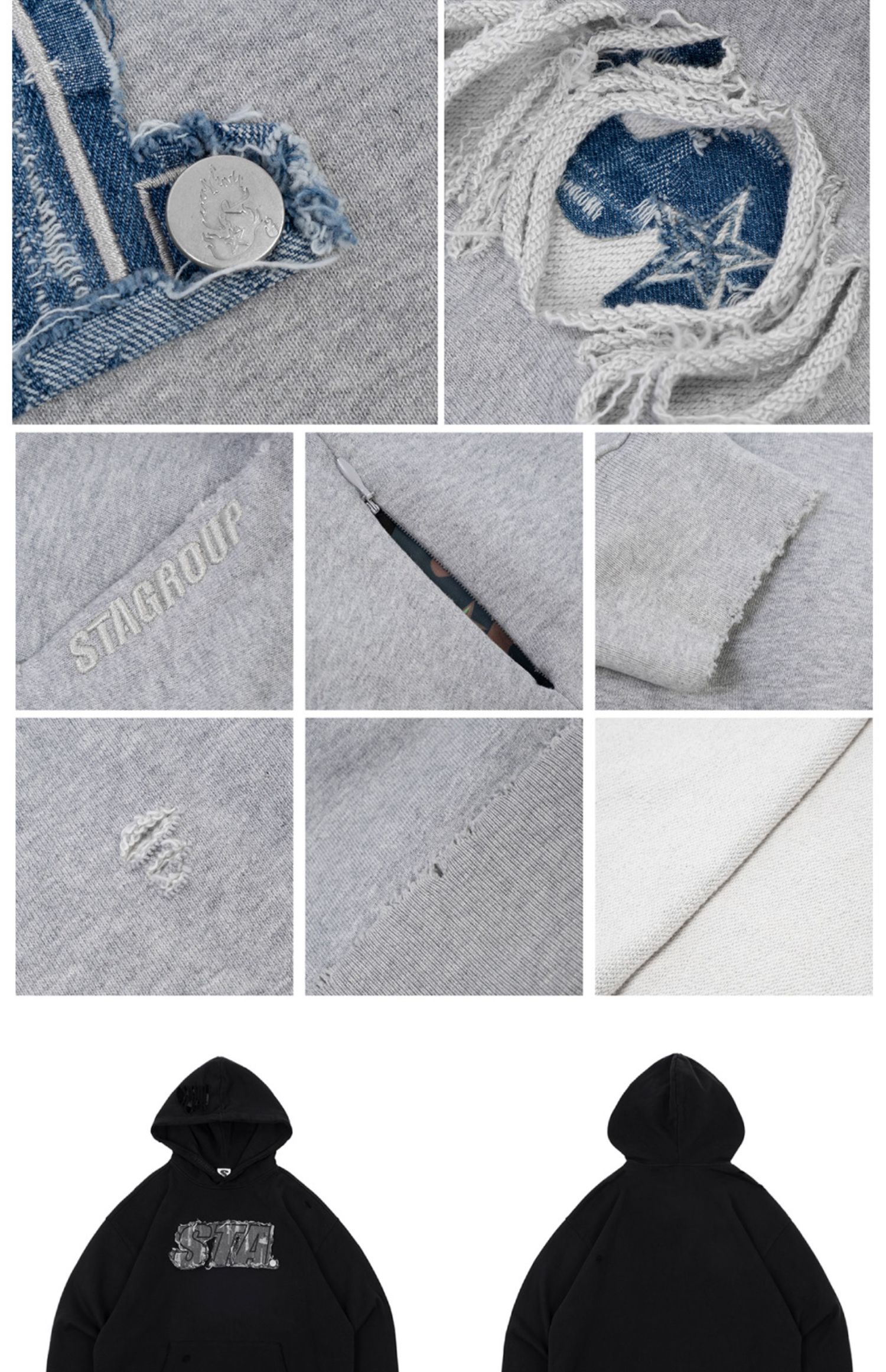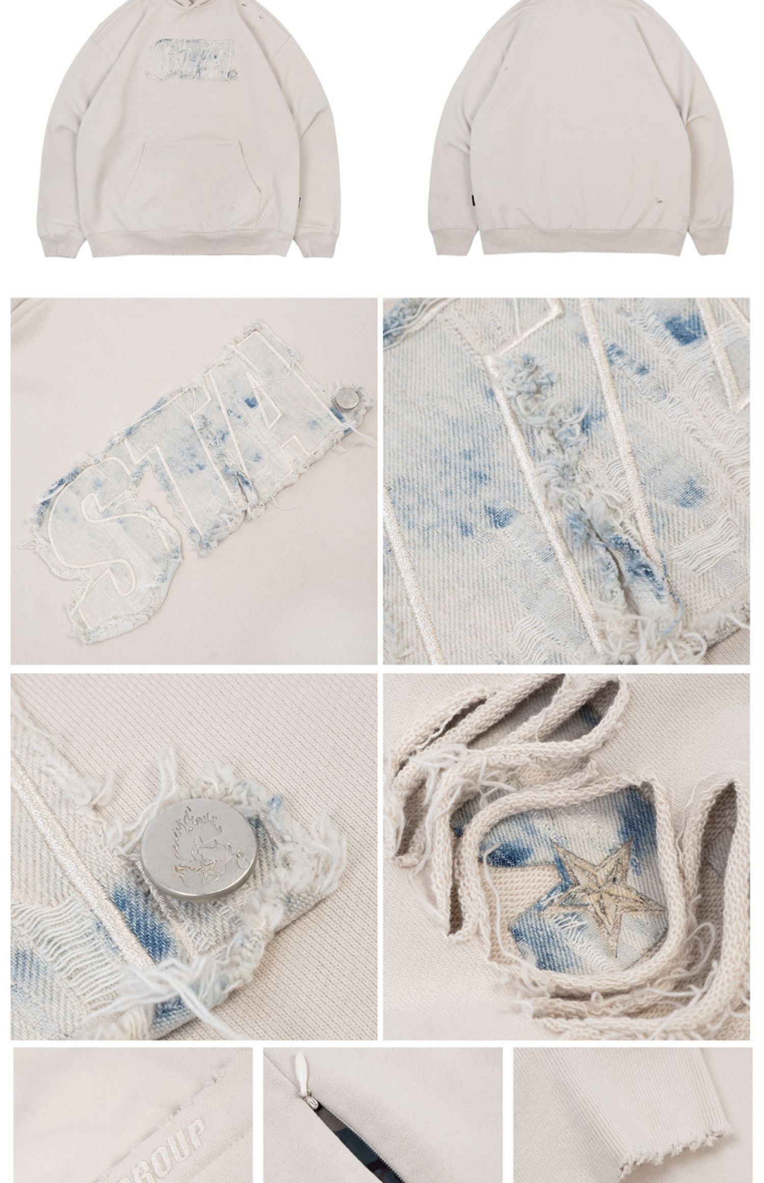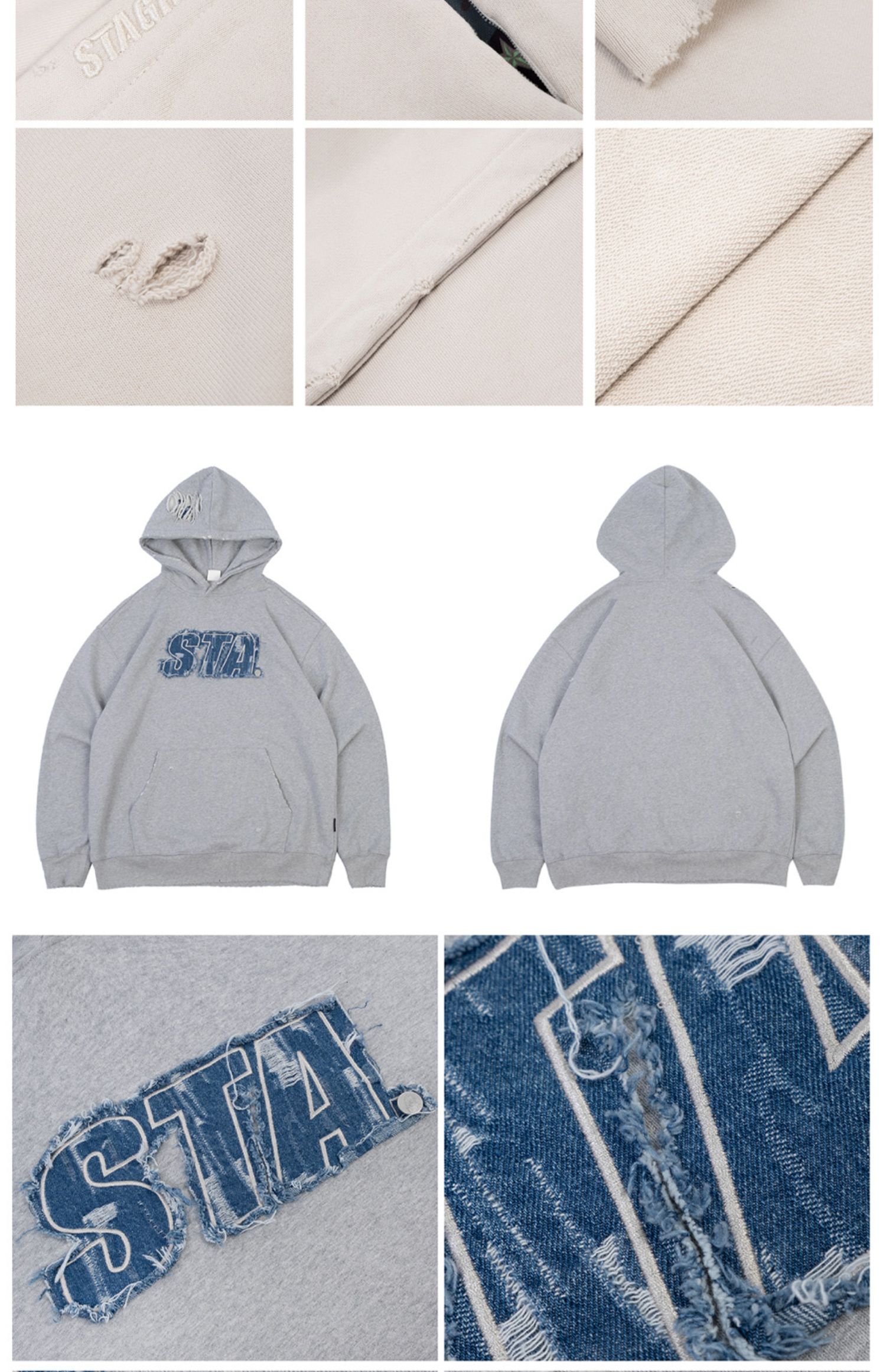 STA 2023春秋季刺繡牛仔LOGO破壞國潮寬鬆純棉加絨連帽衫衛衣男女