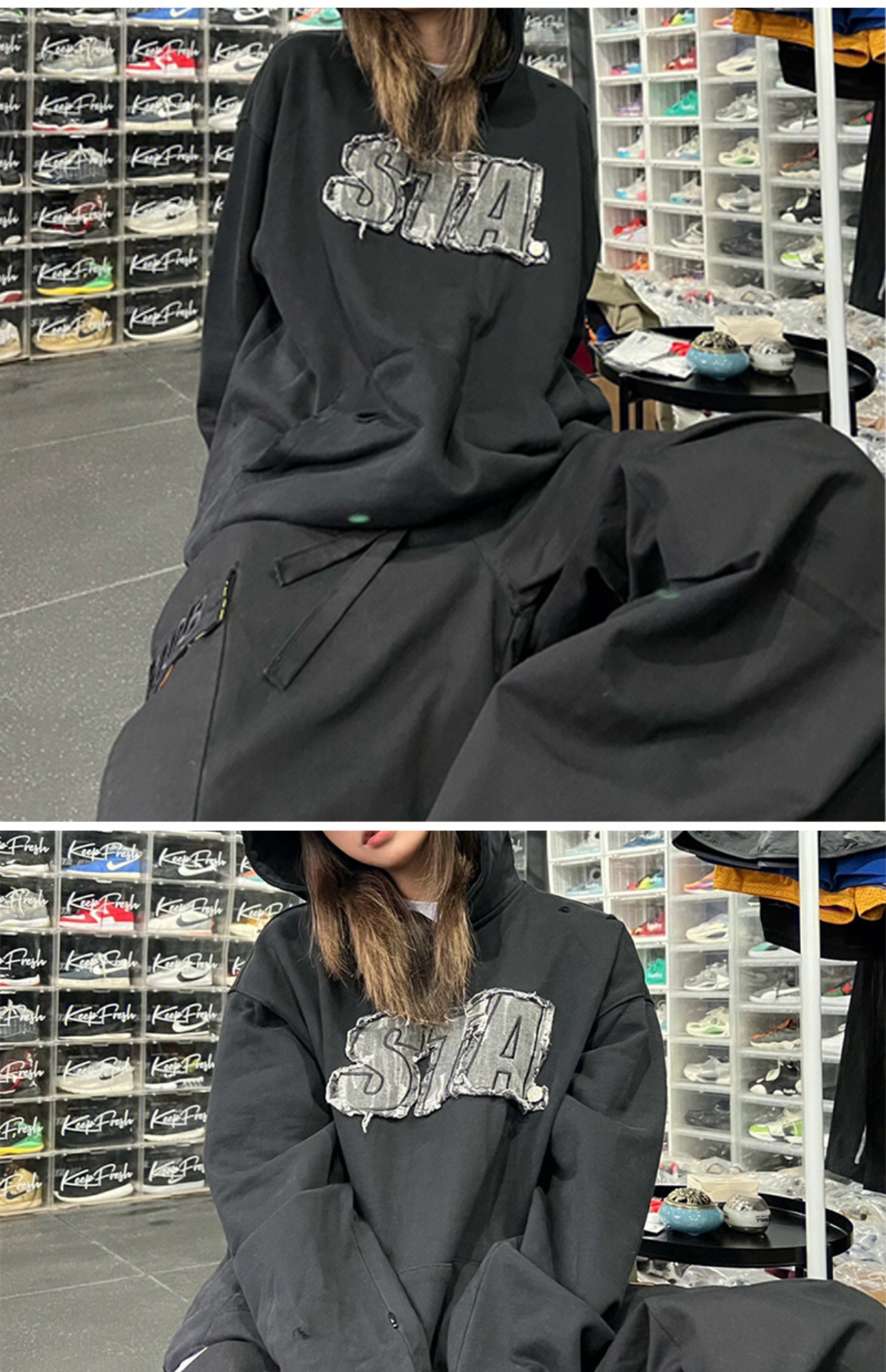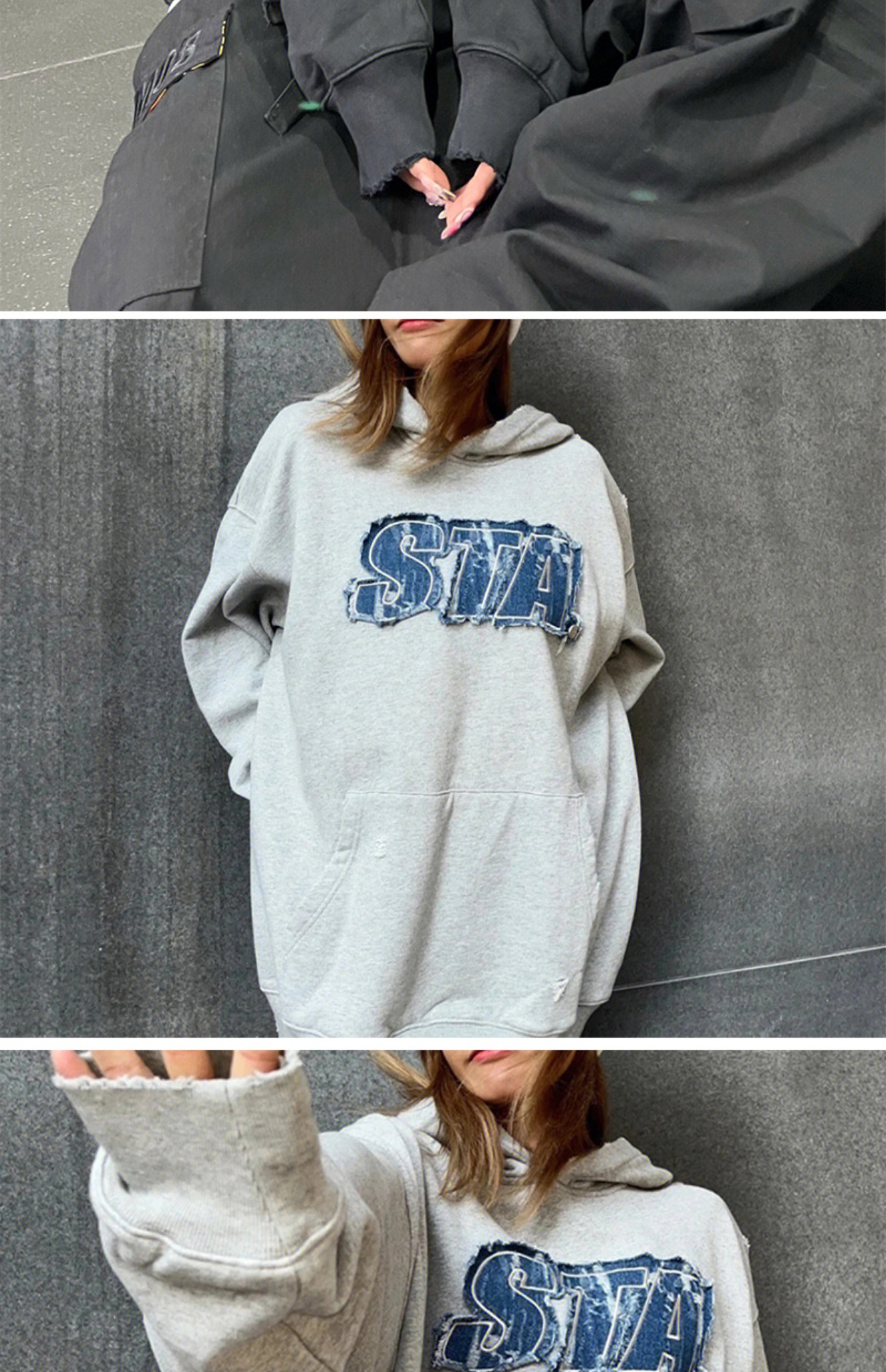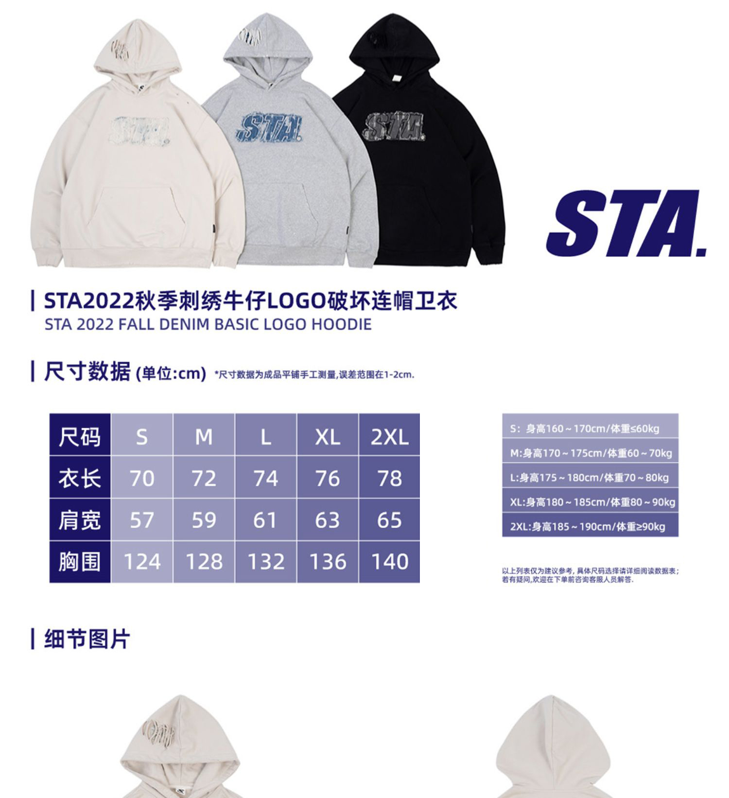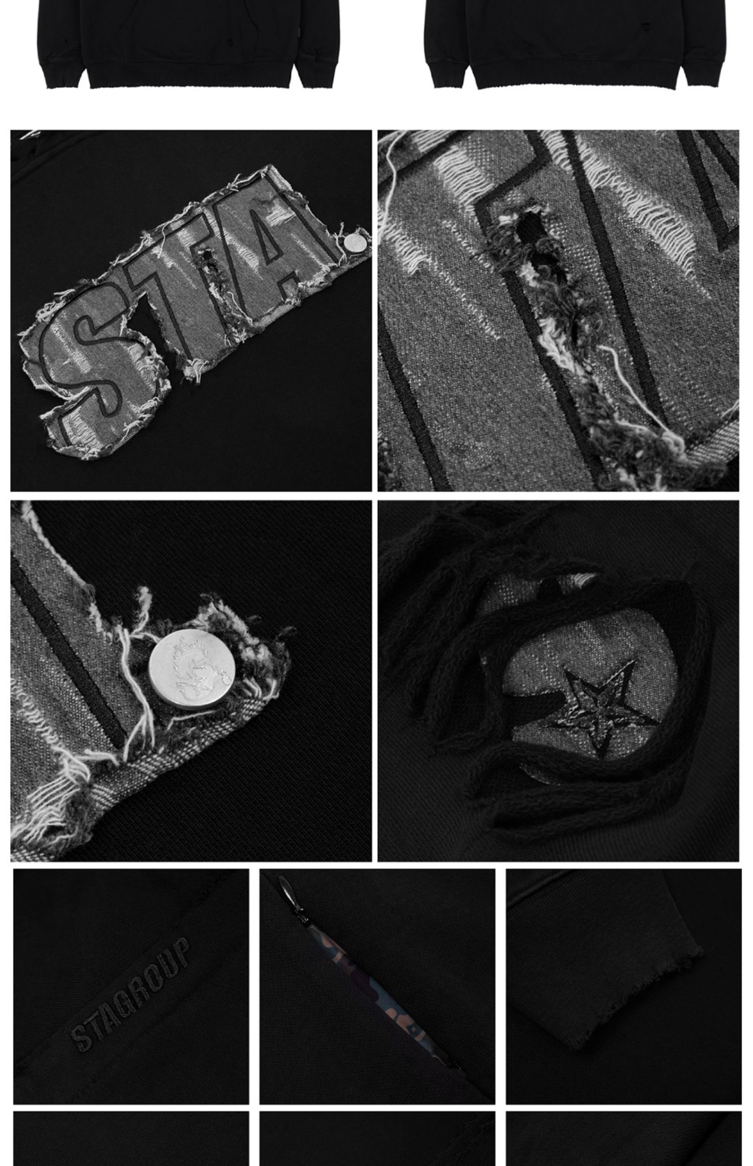 STA 2023春秋季刺繡牛仔LOGO破壞國潮寬鬆純棉加絨連帽衫衛衣男女