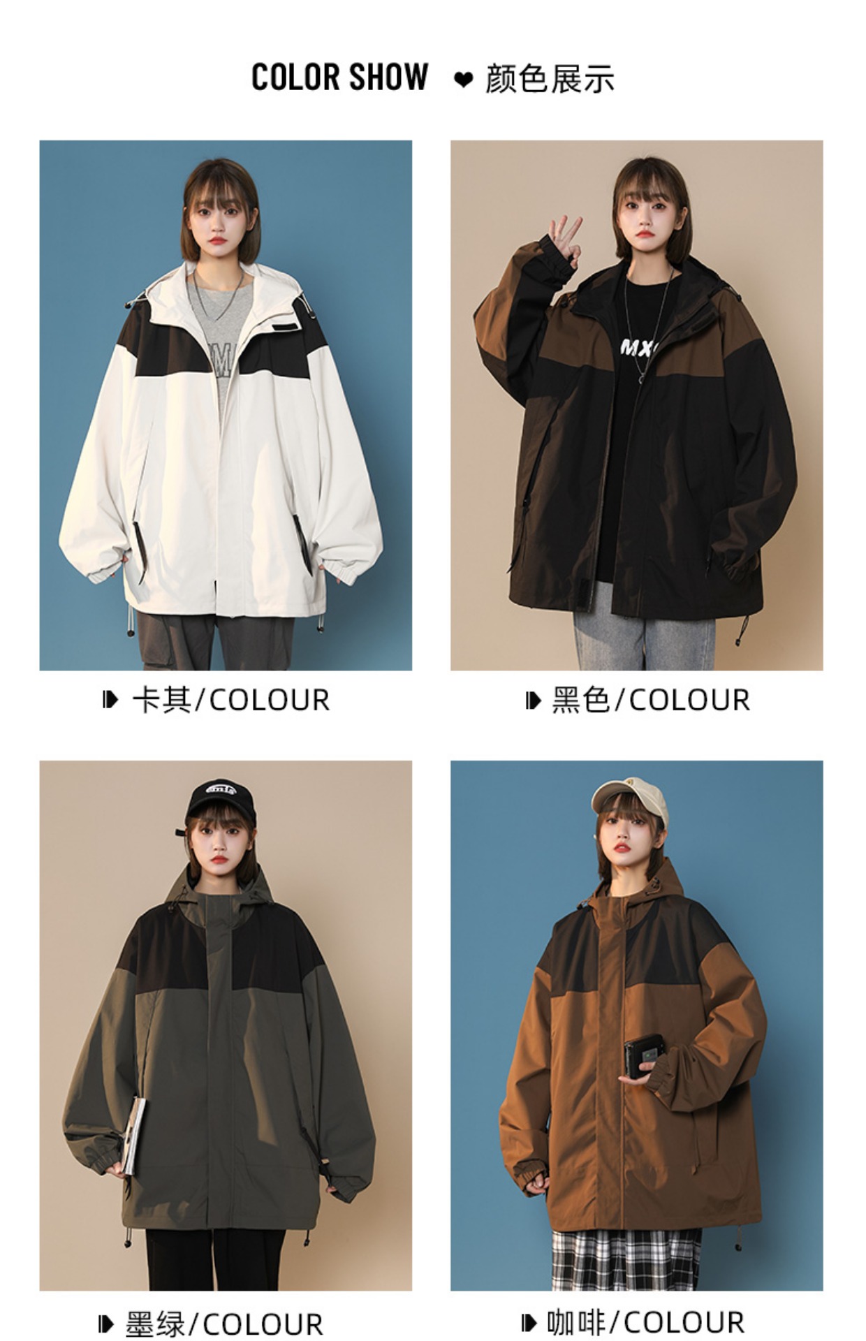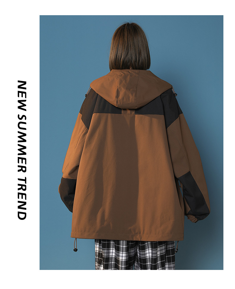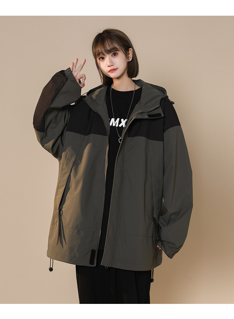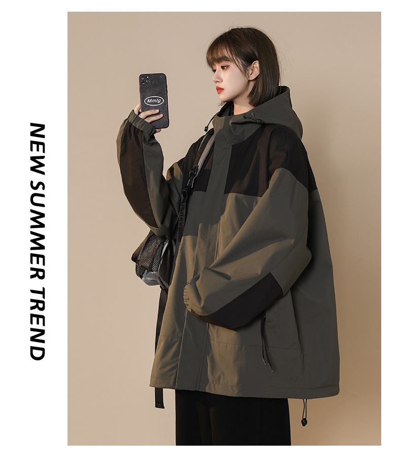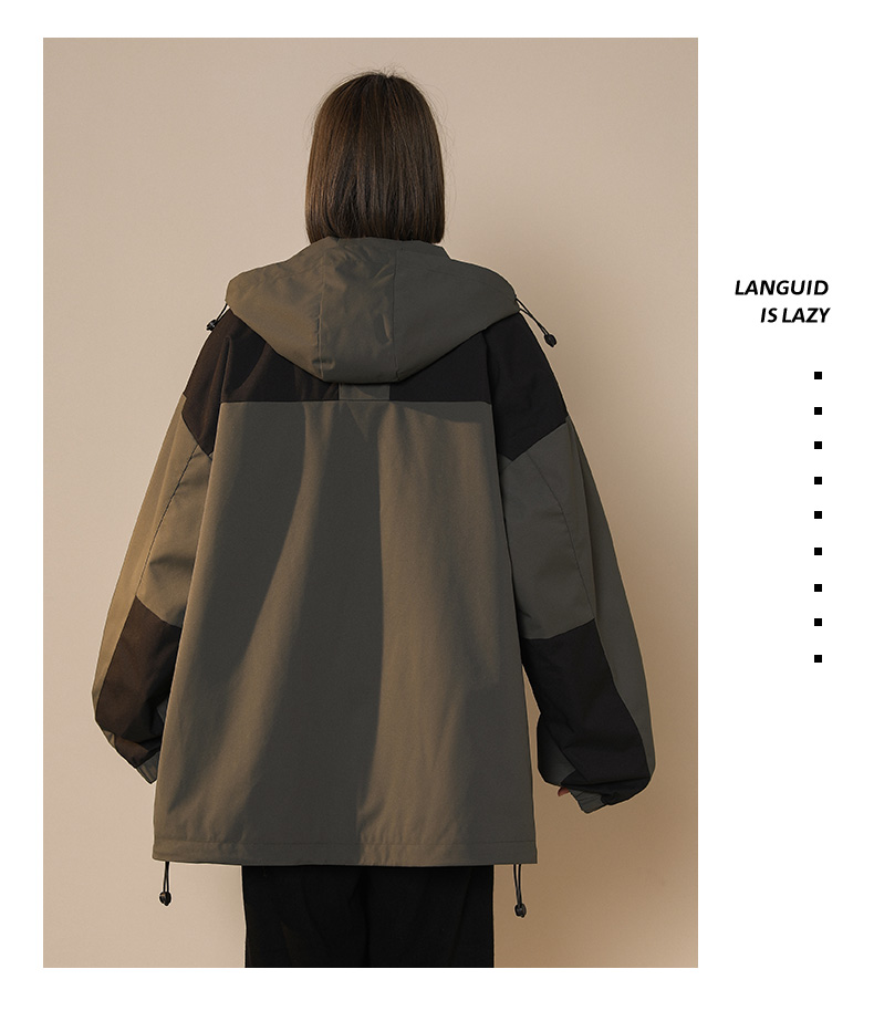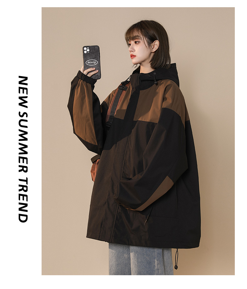 拼接撞色連帽衝鋒衣外套女春季胖mm寬鬆復古中性街頭潮牌工裝夾克