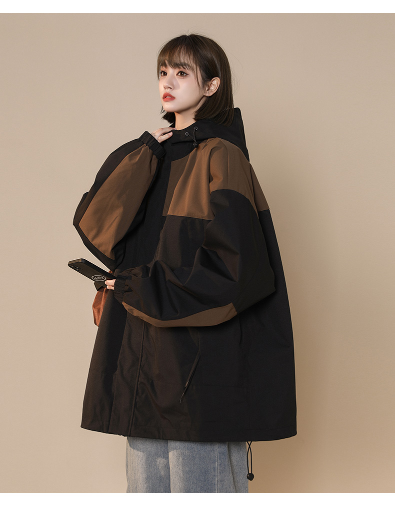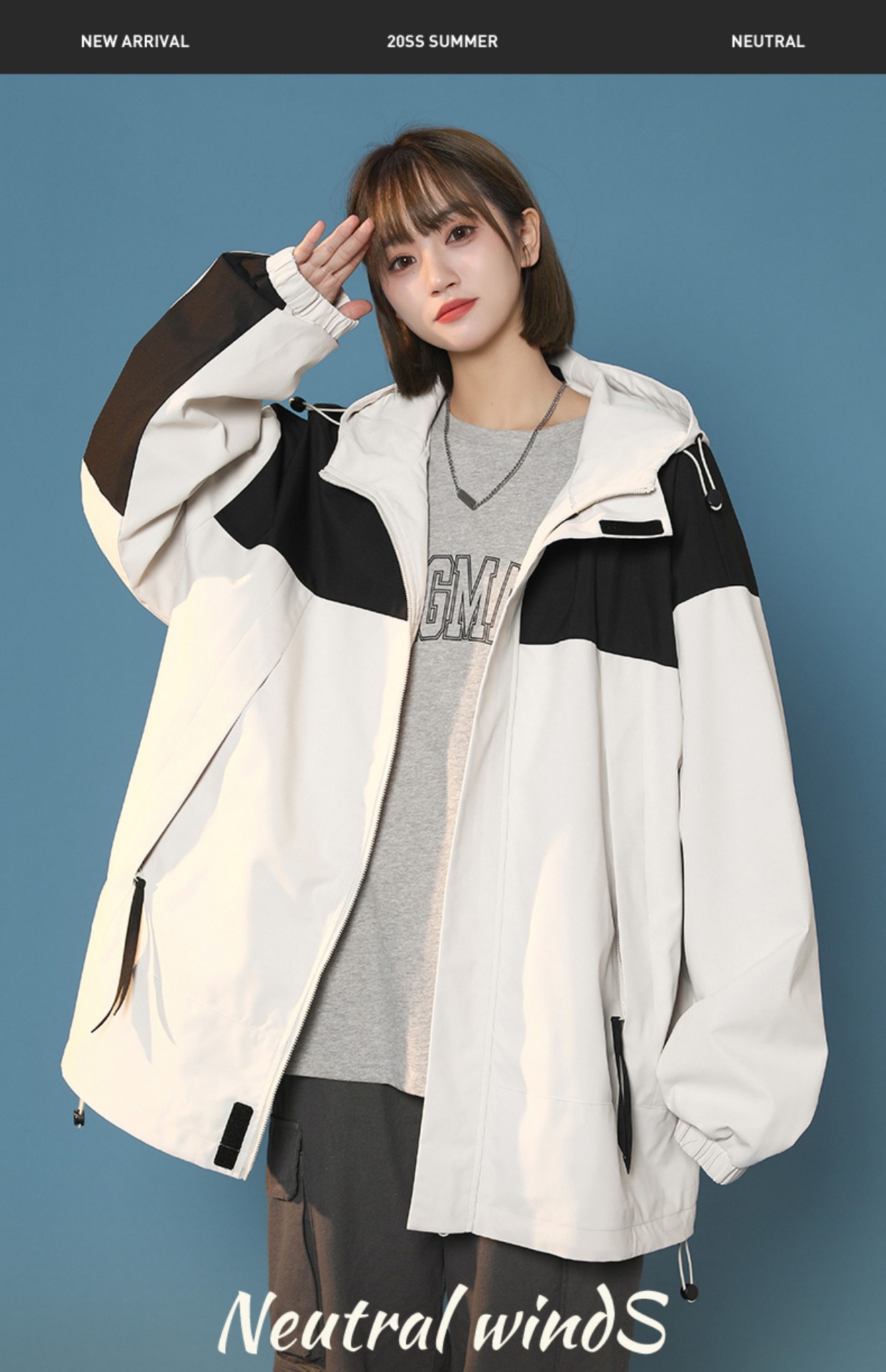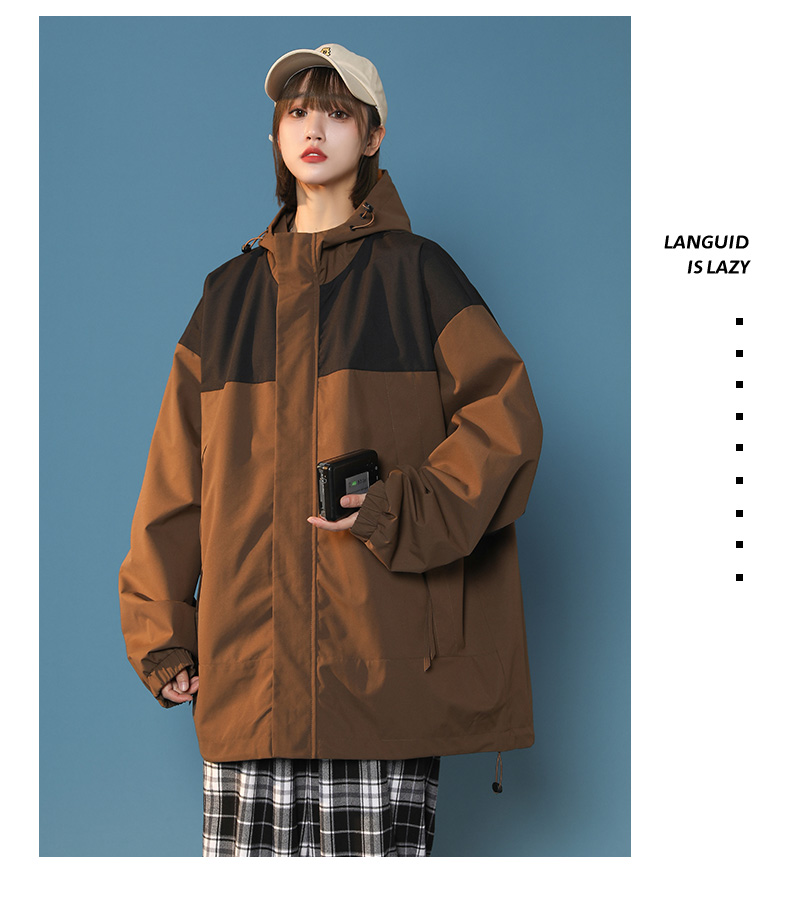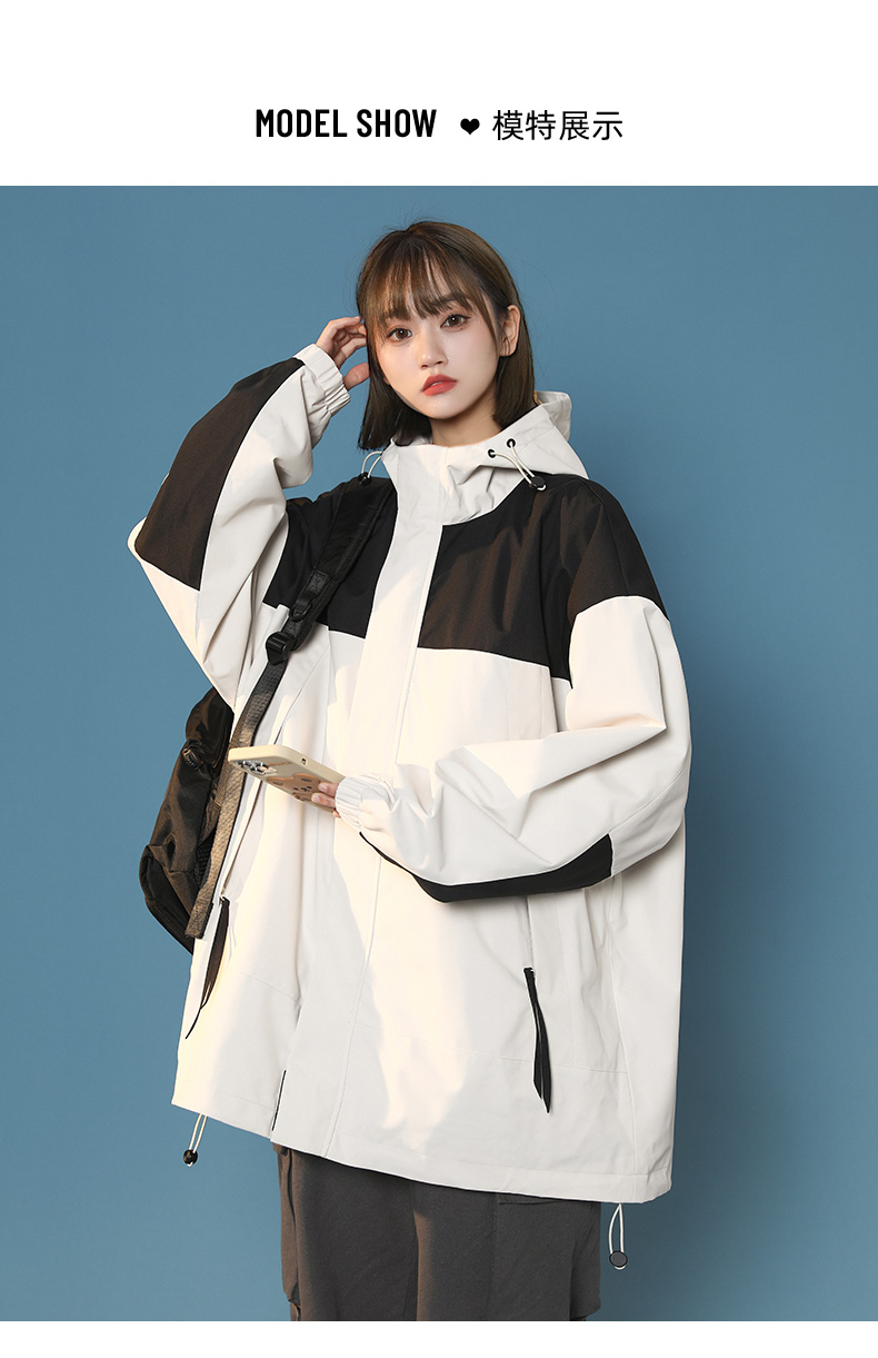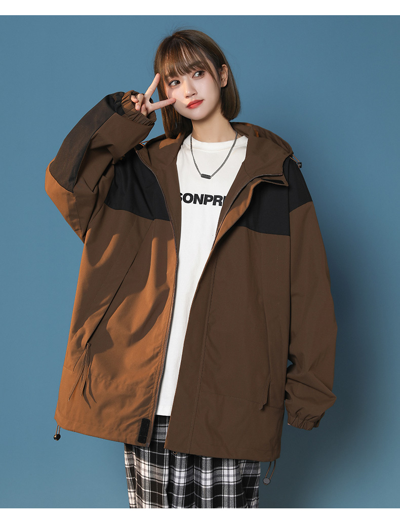 拼接撞色連帽衝鋒衣外套女春季胖mm寬鬆復古中性街頭潮牌工裝夾克