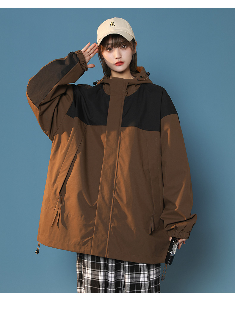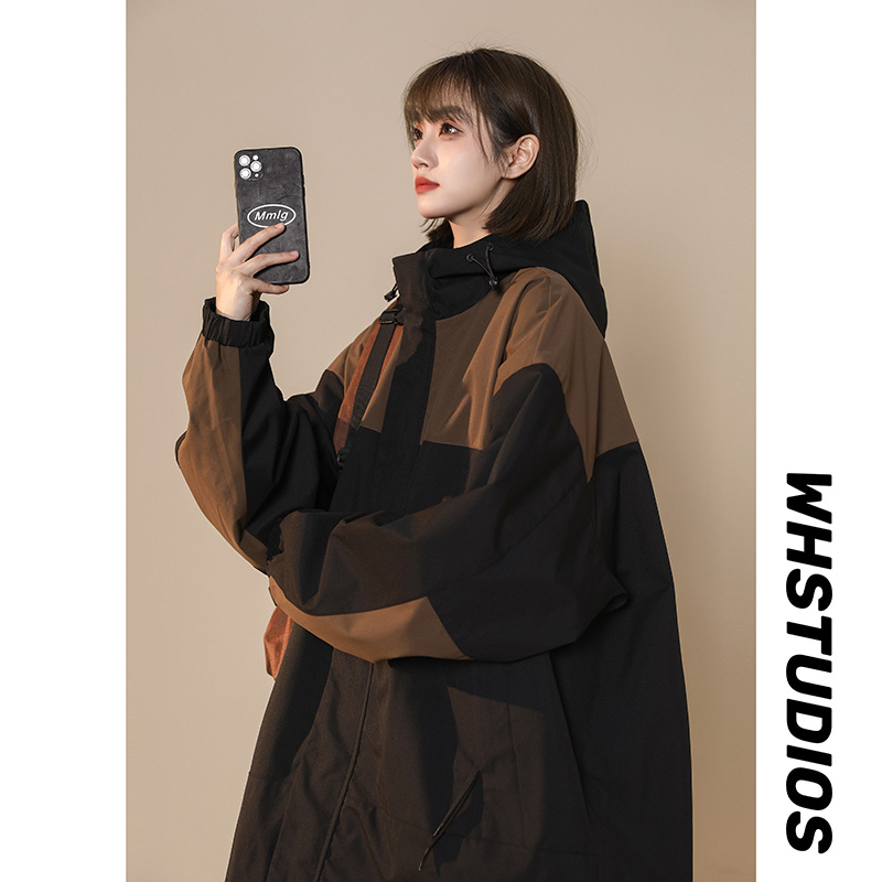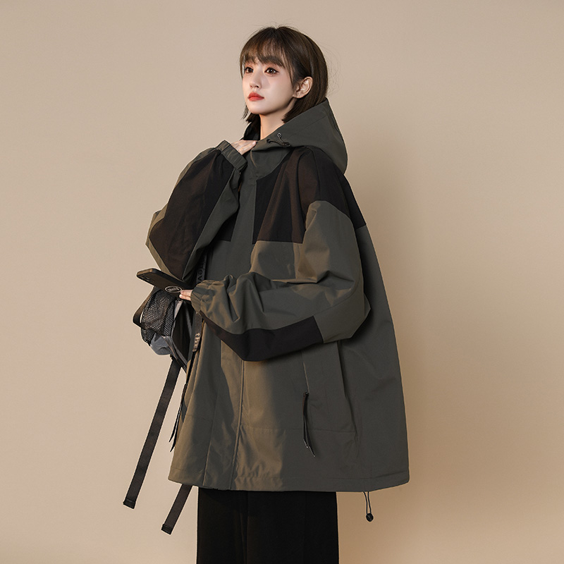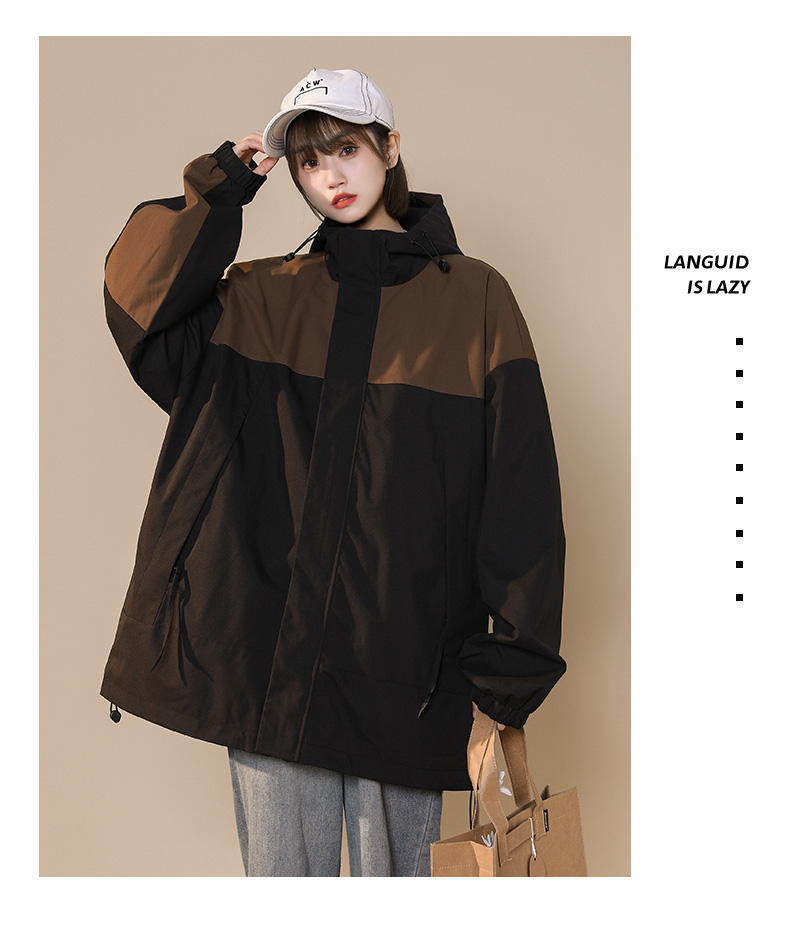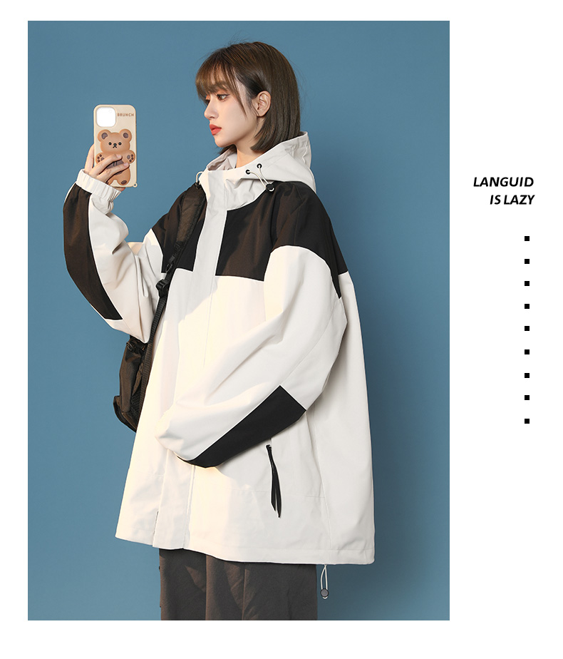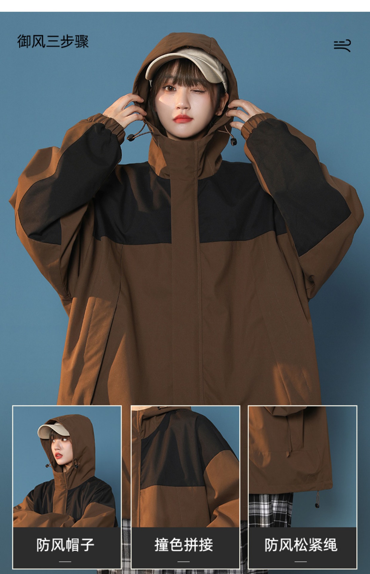 拼接撞色連帽衝鋒衣外套女春季胖mm寬鬆復古中性街頭潮牌工裝夾克