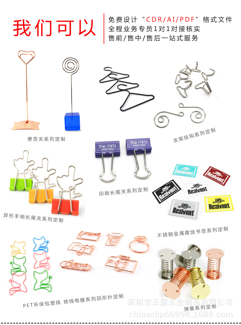 公司生产的产品主要包括:圣诞装饰挂钩、天花板挂钩、回形针、万字夹、纸夹、曲别针、书签、芭比娃娃公仔玩偶小衣架、曲别针、钢丝名片夹、便签夹、婚庆桌牌夹、席位夹、菜单夹、票据收纳钉、卡片夹、留言夹、号牌夹、花卉标签插、DIY手工配件、异形长尾夹、胶片把手长尾夹、镂空书签、金属S钩、展示挂钩、不锈钢钩子、窗帘挂钩、迷你小衣架、婚庆字母衣架、玩具摇摆弹簧、照片夹、铁艺果篮、创意书立、铁艺笔筒、学生学校办公室书夹、造型双头夹、文具礼品套装... ...