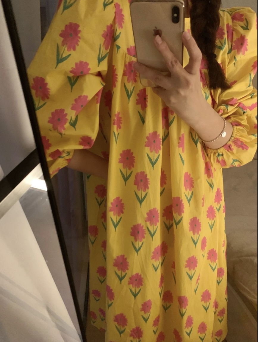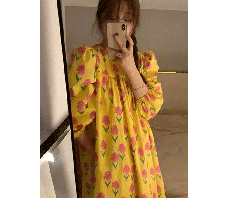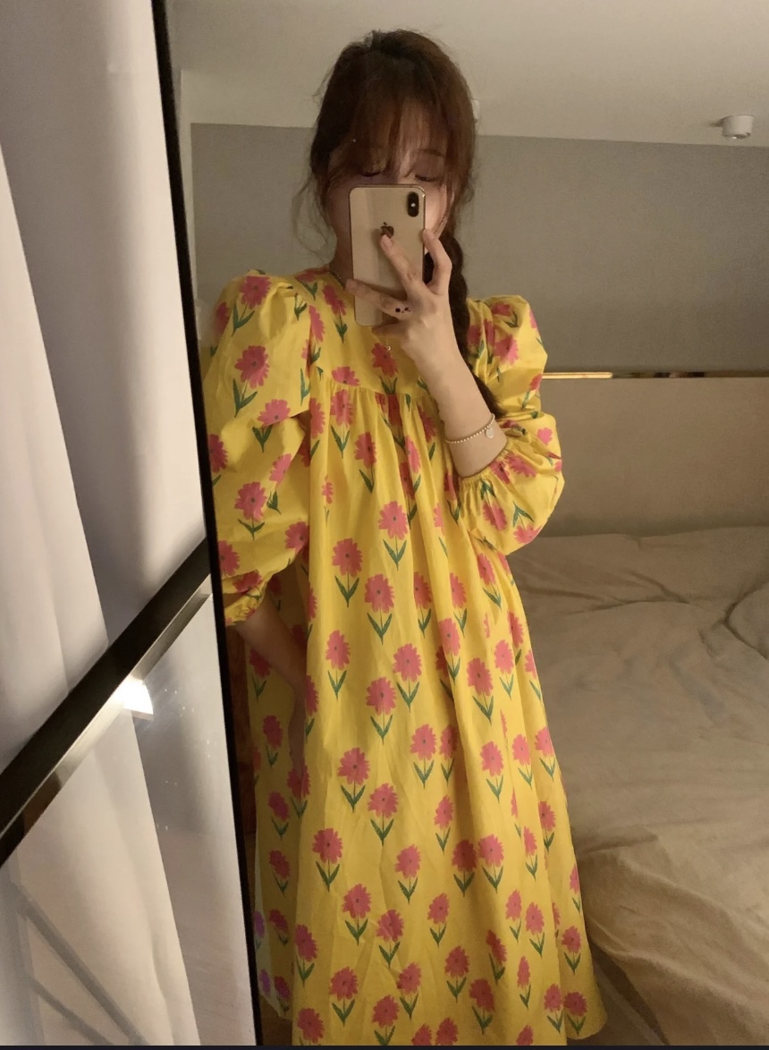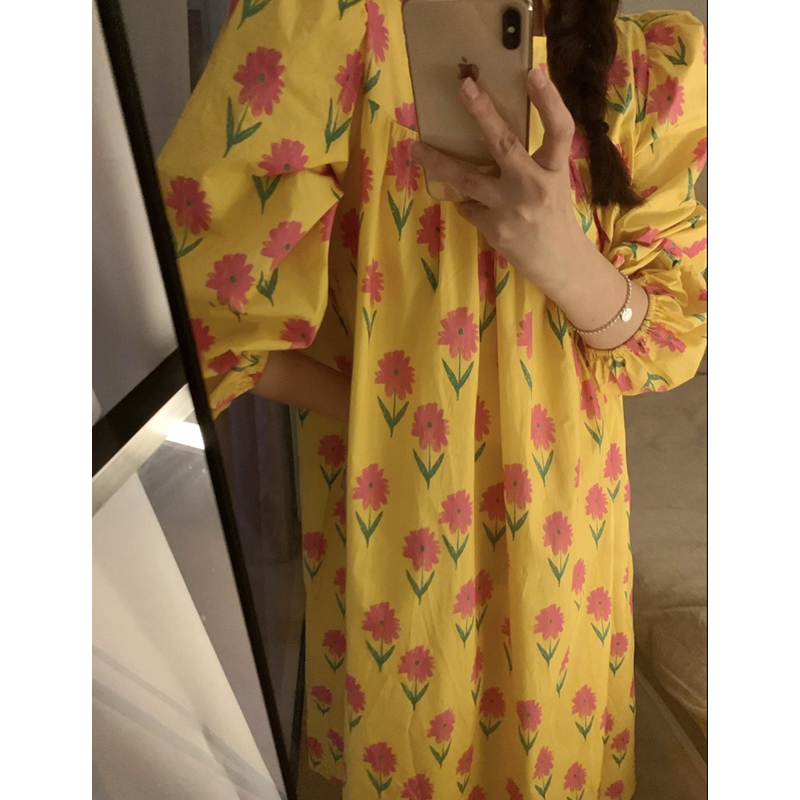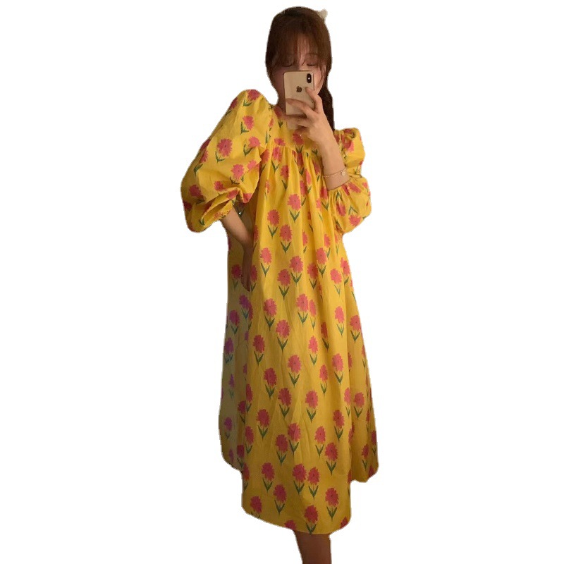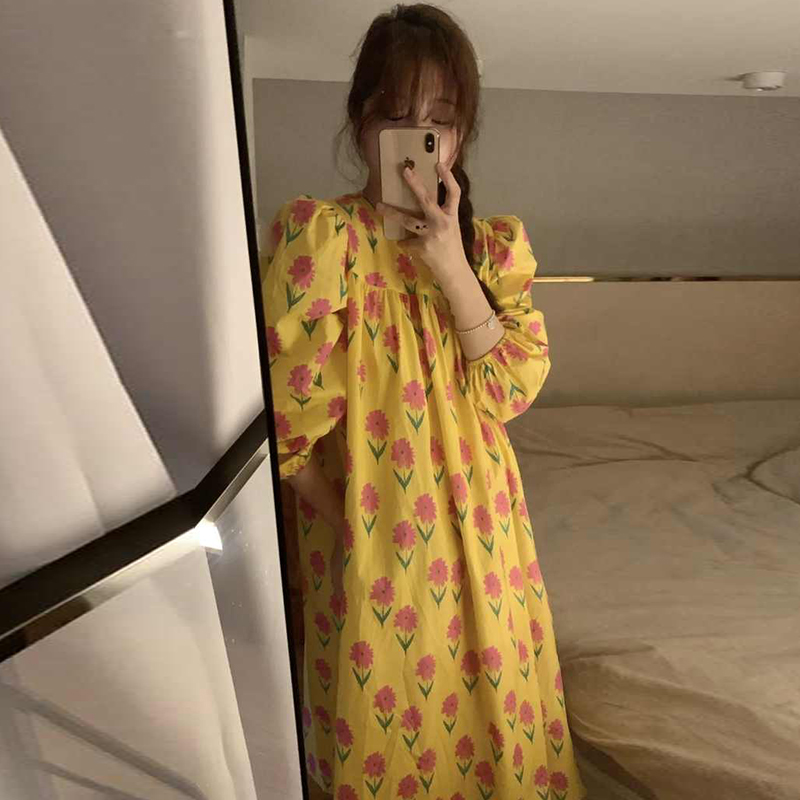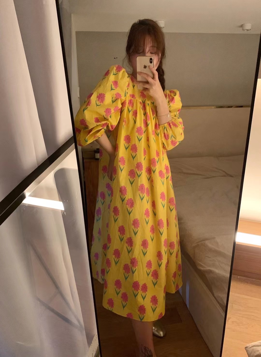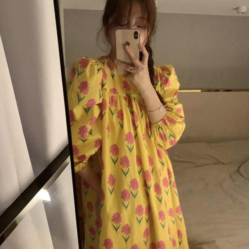 韩国chic春季法式复古圆领满屏碎花设计宽松休闲泡泡袖连衣裙长裙