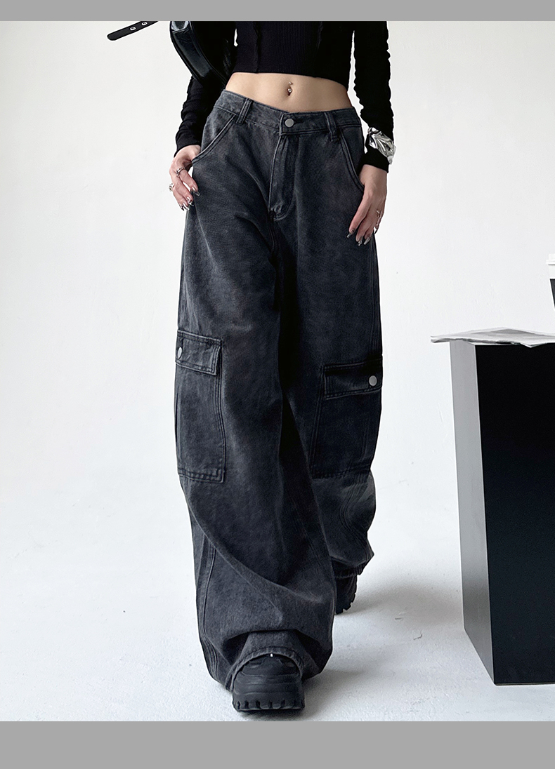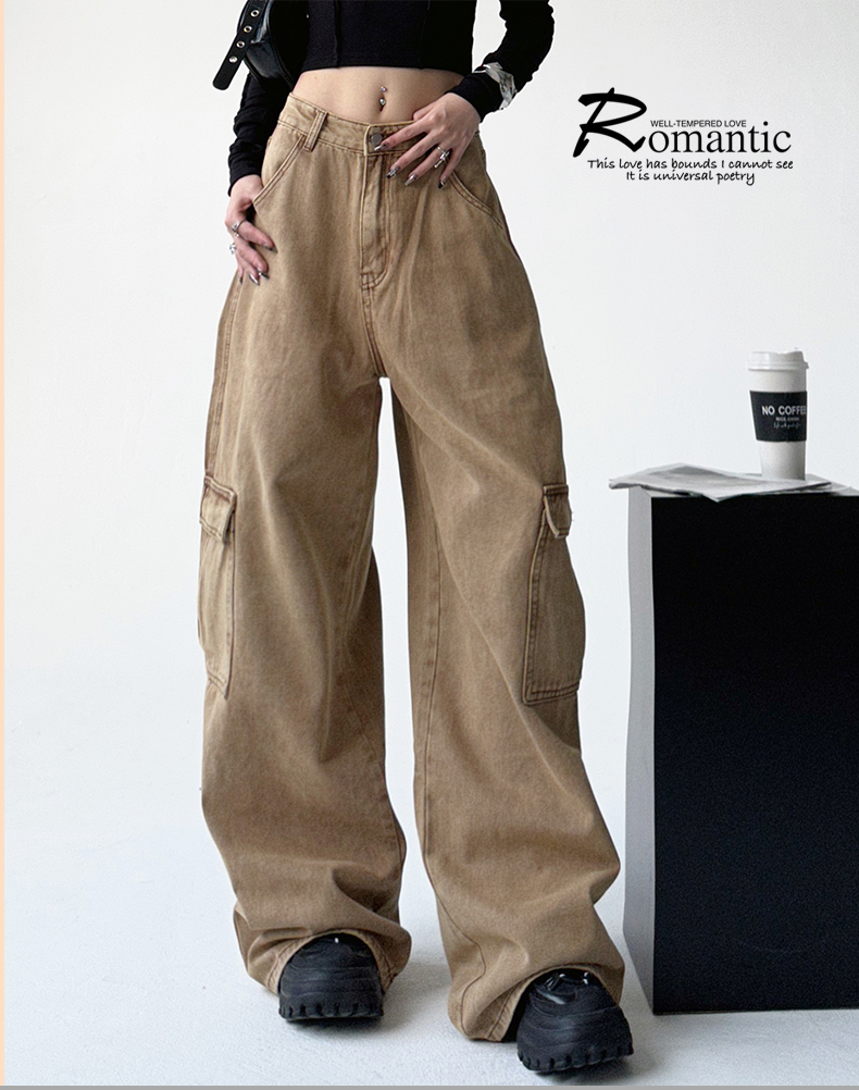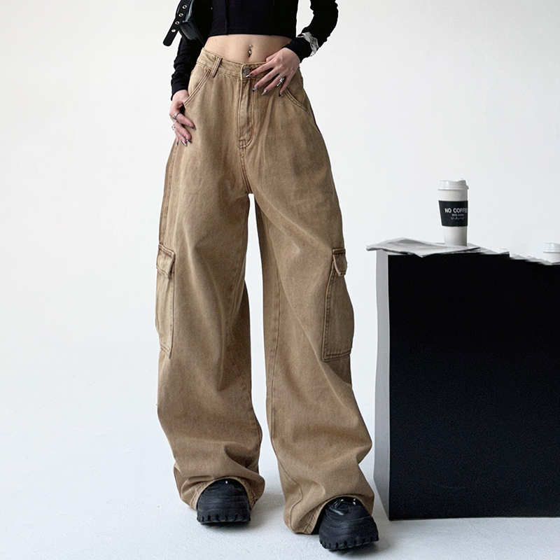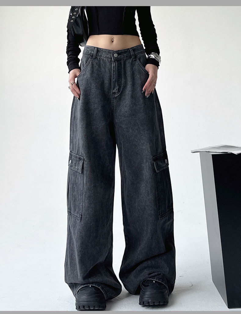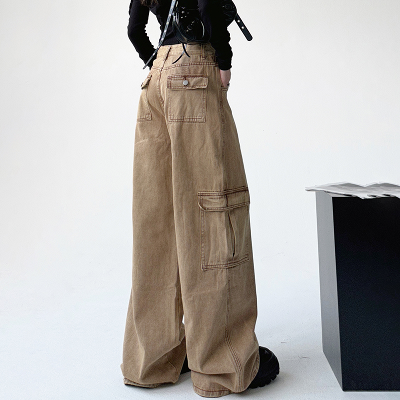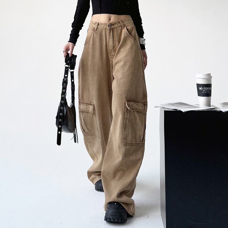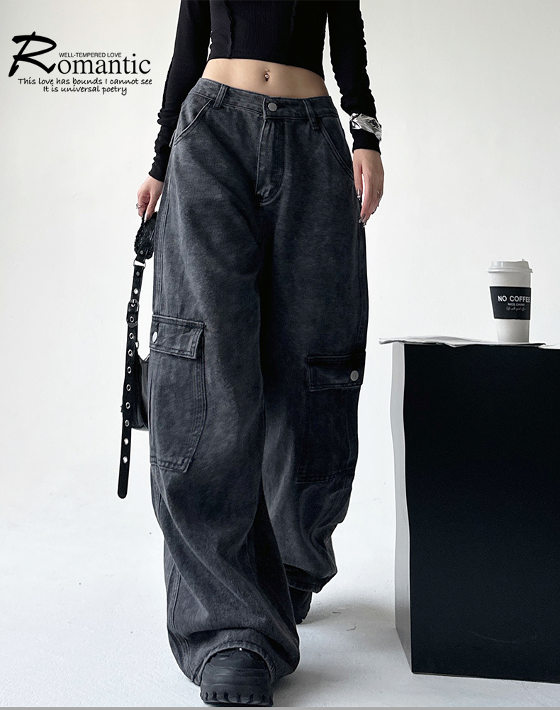 美式工裝牛仔褲女秋季2023新款甜酷設計感學院風顯瘦闊腿拖地褲潮