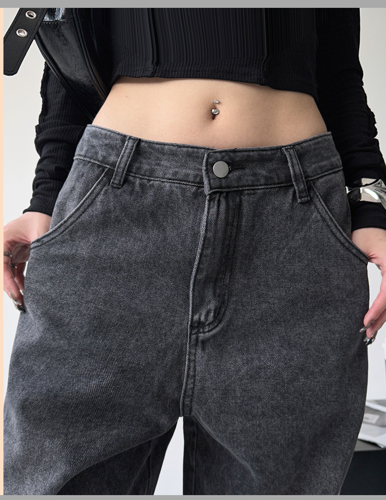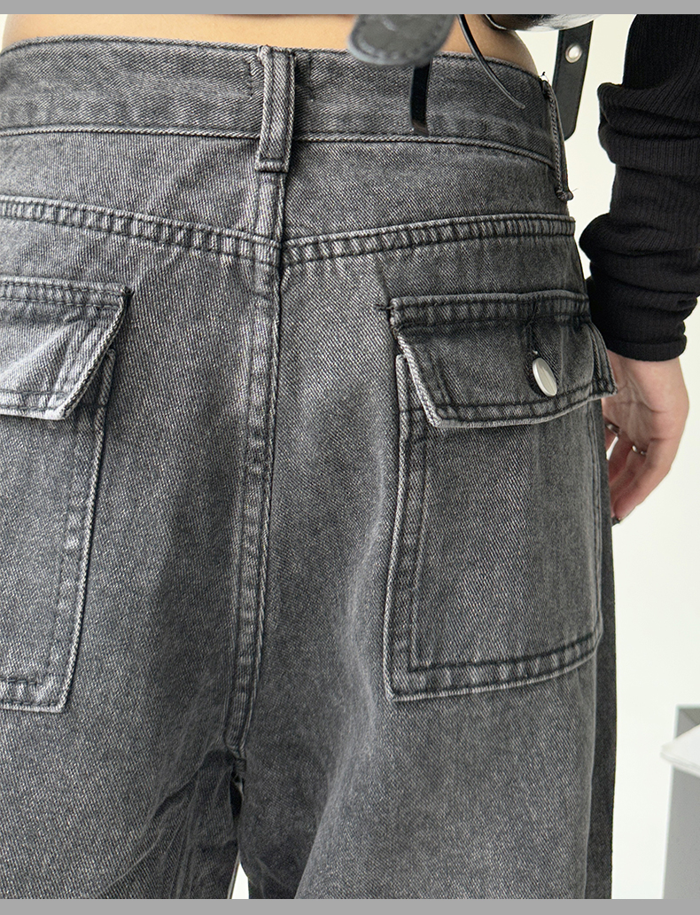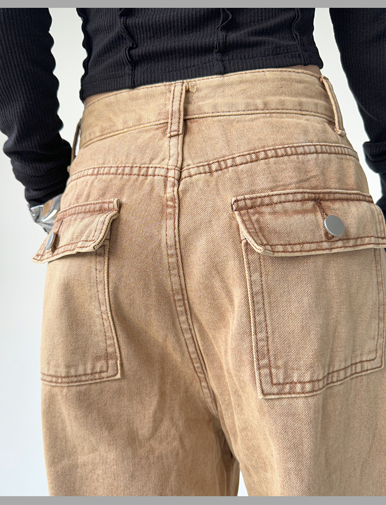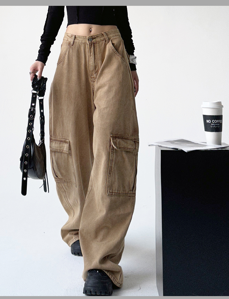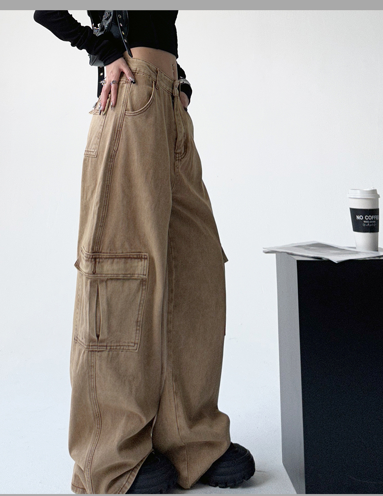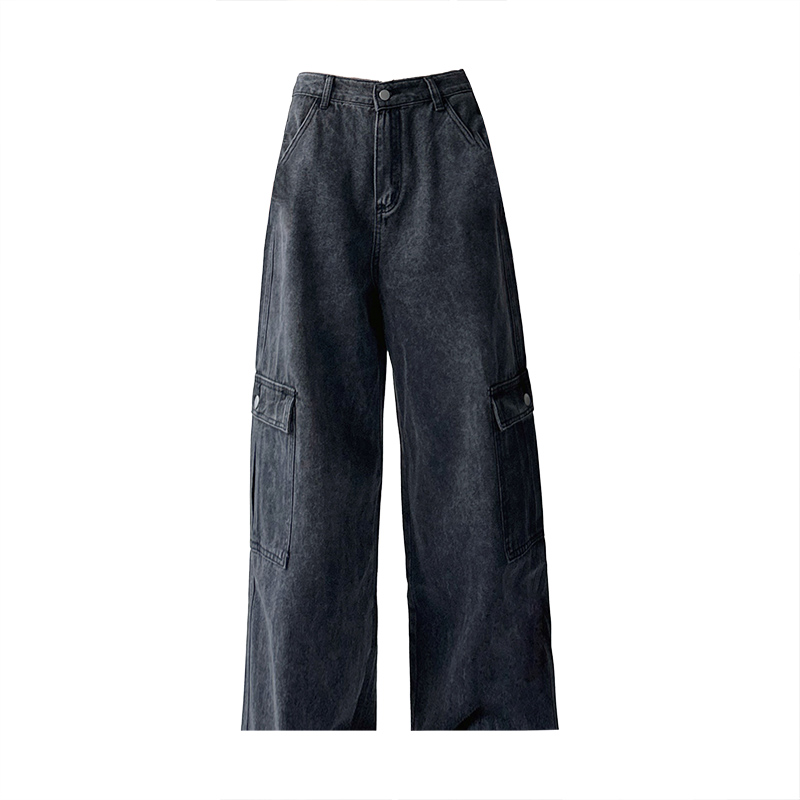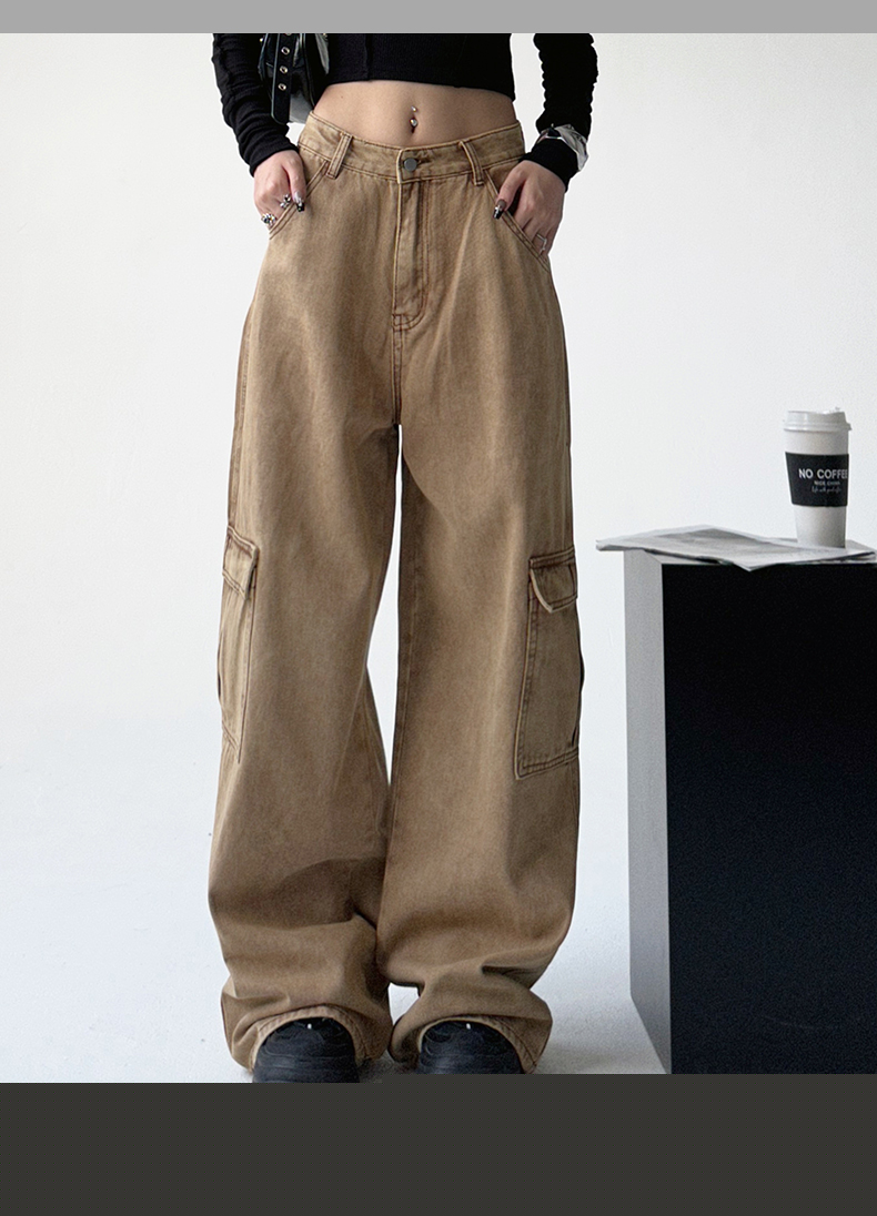 美式工裝牛仔褲女秋季2023新款甜酷設計感學院風顯瘦闊腿拖地褲潮