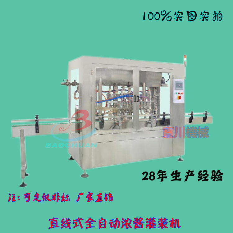 多头活塞式全自动灌装机是我司集多年生产经验,吸收世界先进技术自行研制开发的新一代自动灌装机。它采用活塞式定量原理,电器和气动元件选用世界知名品牌,由PLC配合人机界面控制,设计新颖、外形美观,具有界面友好,适应性强、操作简单、灌装量准确,维护方便等特点。广泛适用于各种液体、粘稠体、膏体的灌装,更换灌装阀(即变成多头浓酱全自动灌装机),还可灌装含颗粒的半流体、膏体、酱料等。