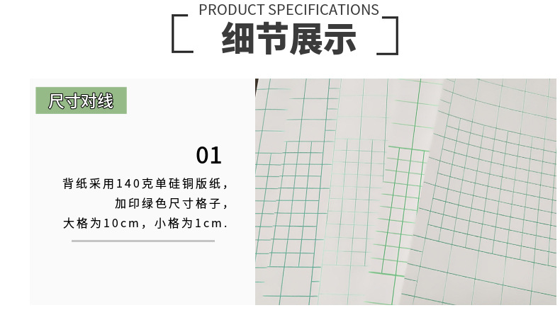 产品材质 :   PET 透明介质膜 + 140克单硅绿格背纸(自粘带背胶)
