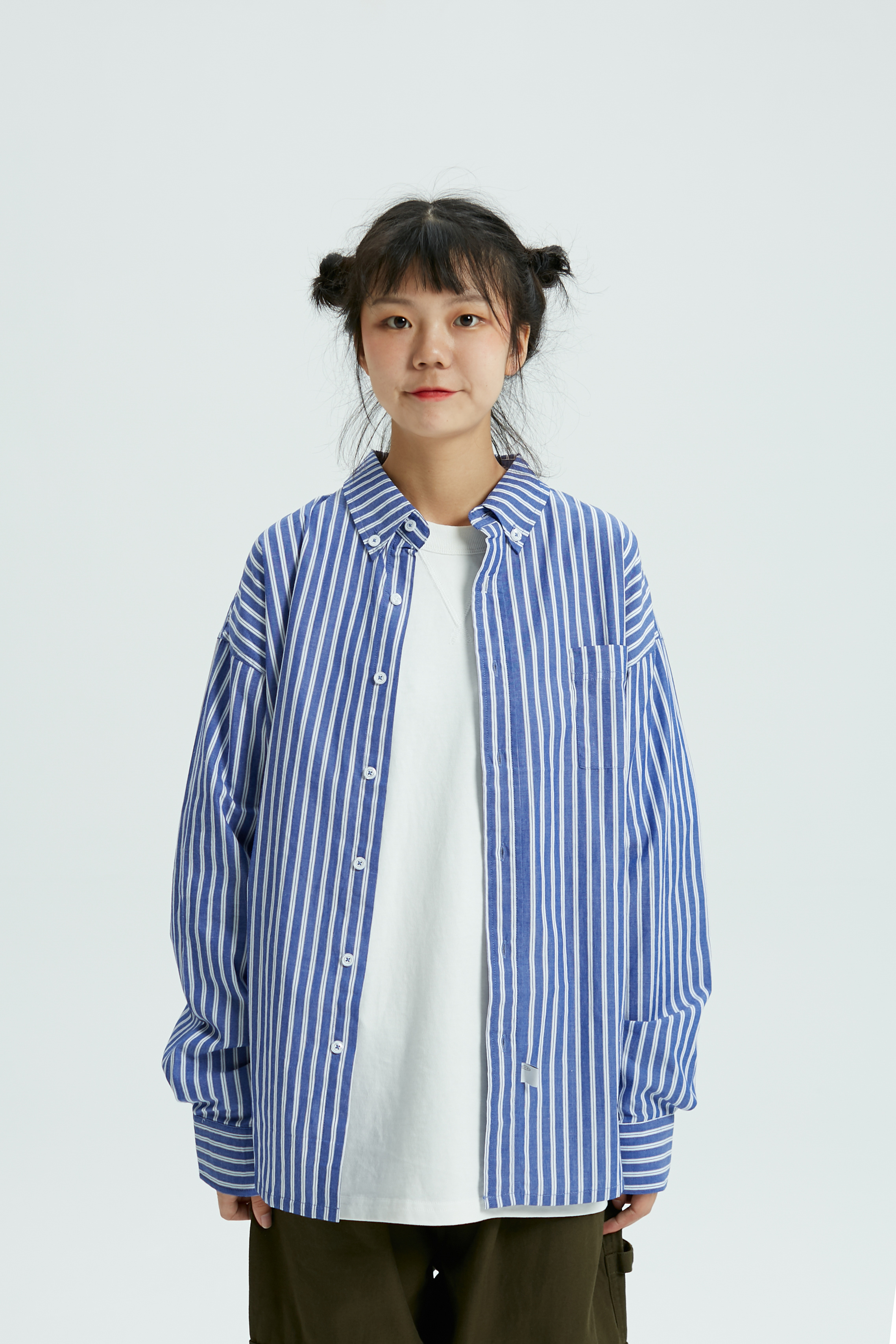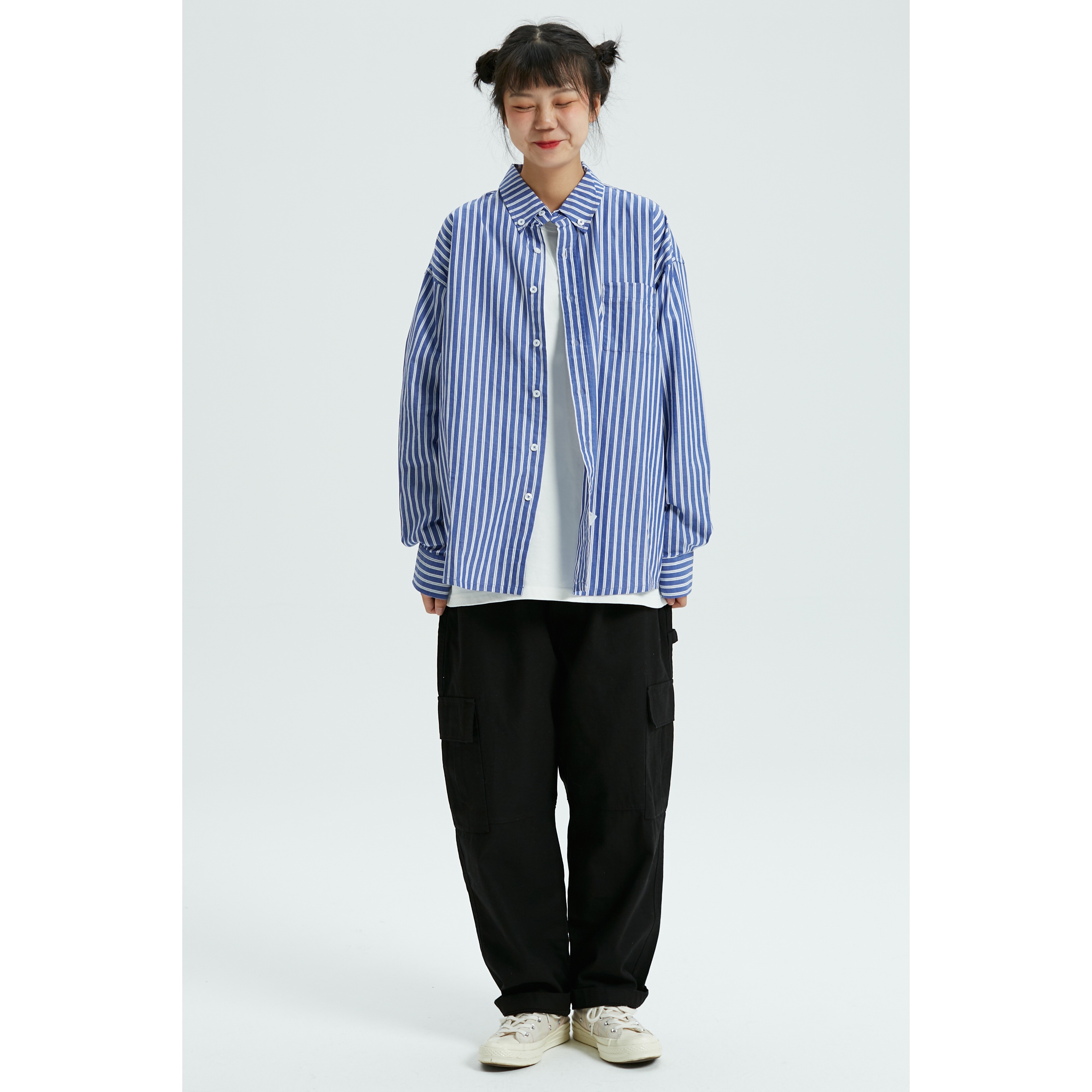北原山貓 19AW/簡約bf風寬鬆休閒百搭藍色純棉條紋襯衫/男女襯衫