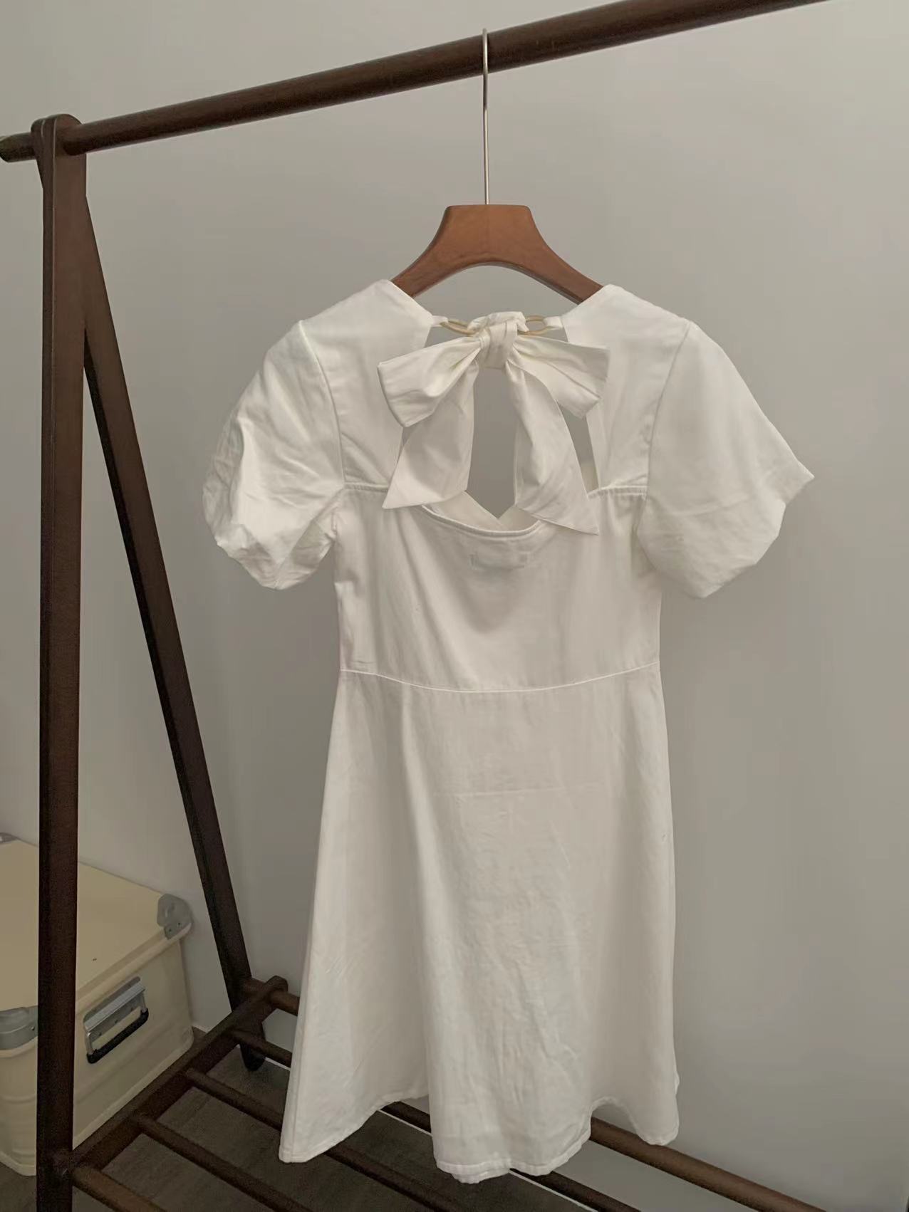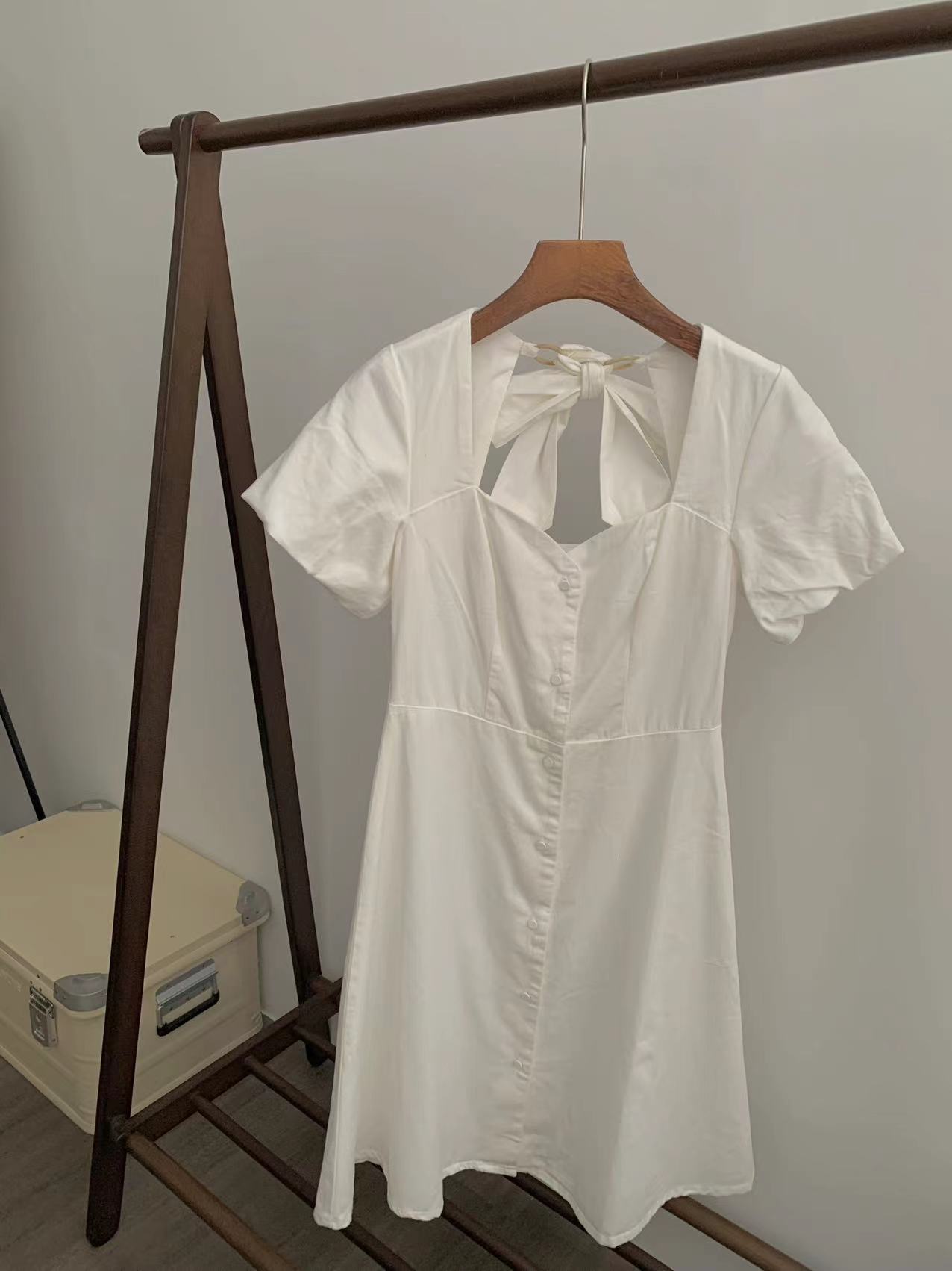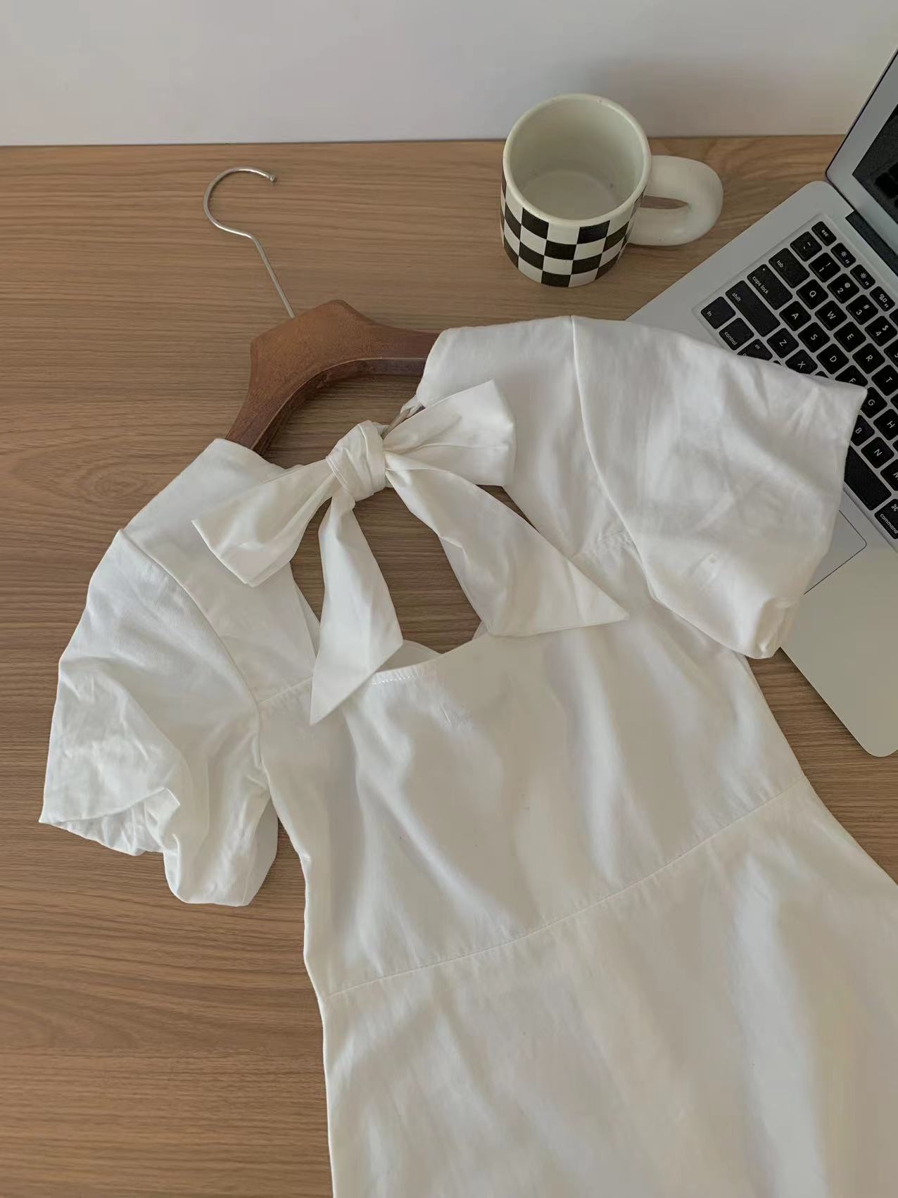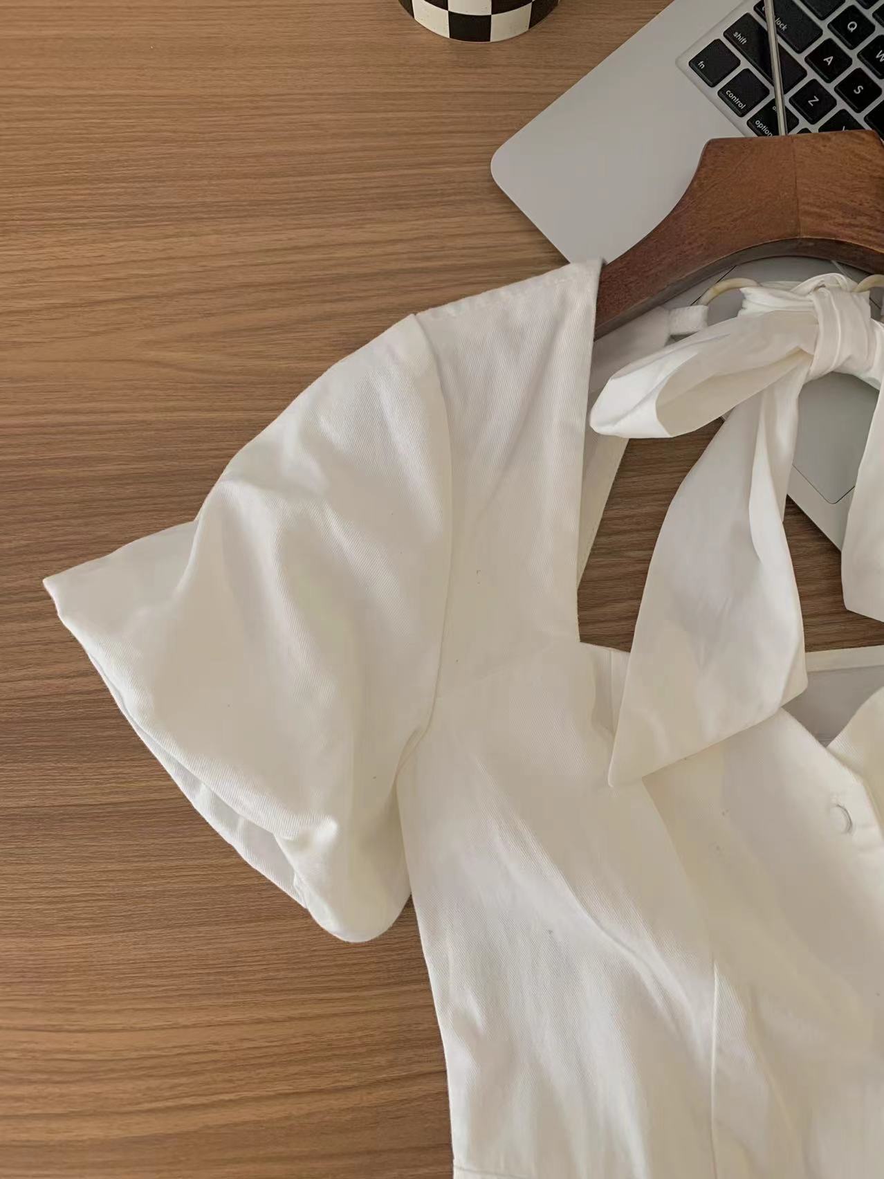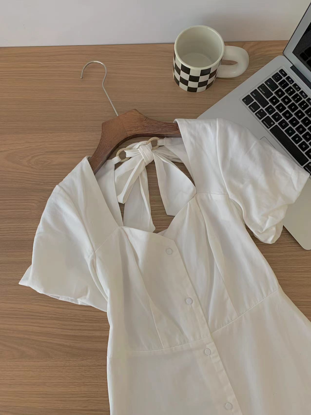 一件7折兩件6折三件5折@泡泡袖背後綁帶白色連衣裙