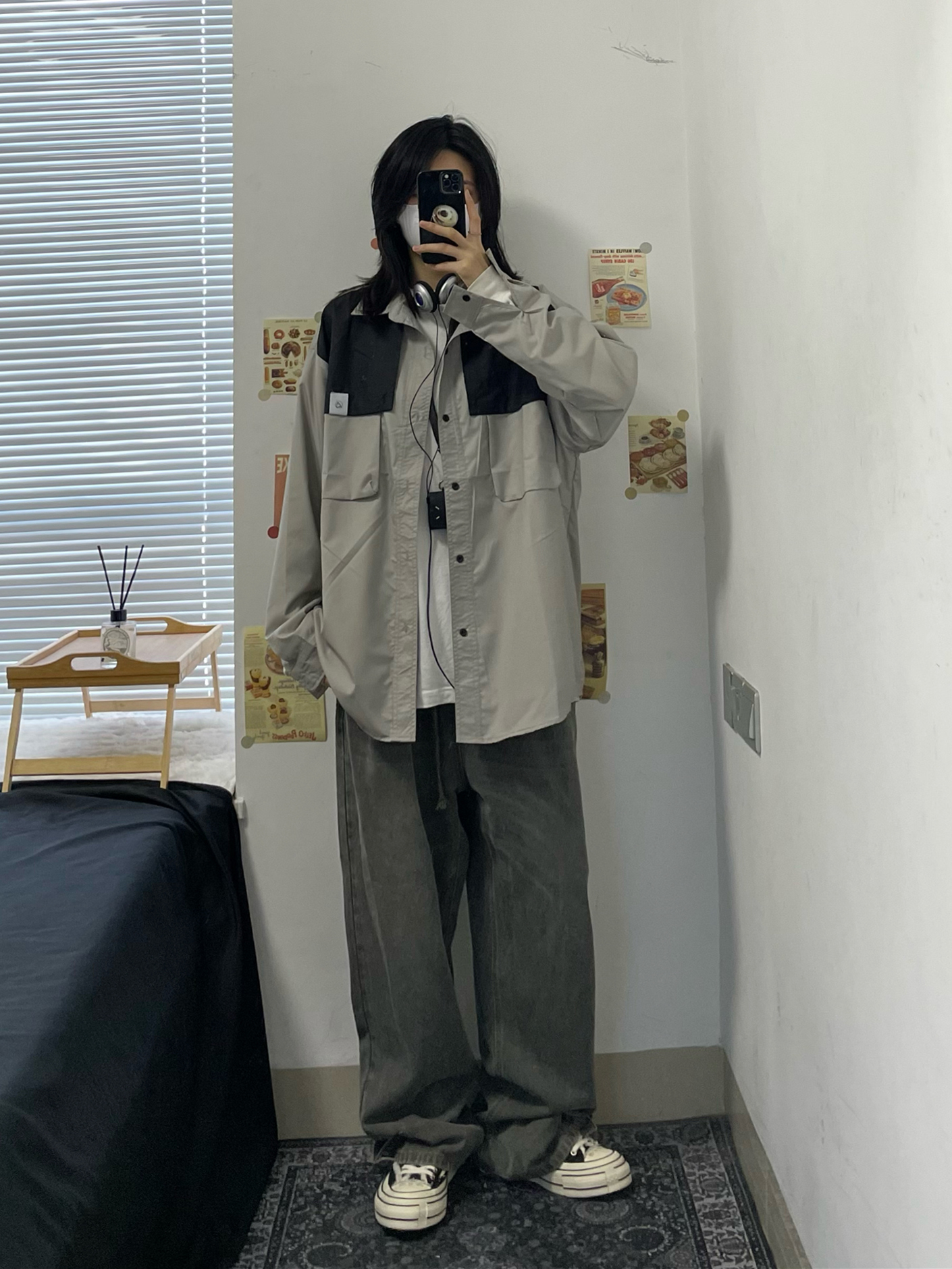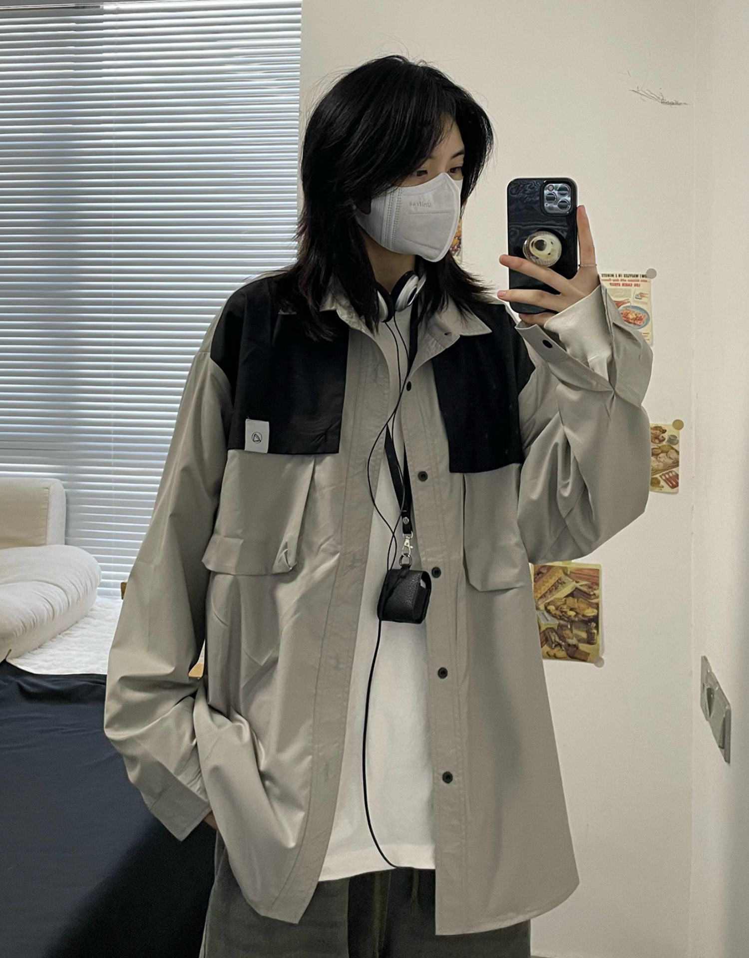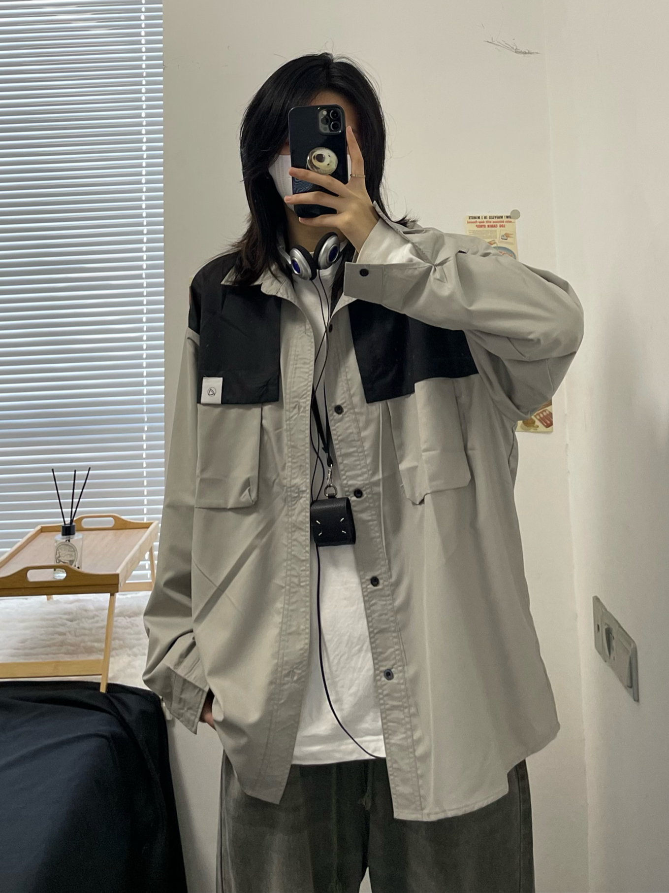 HALF H撞色拼接長袖襯衫小眾春季男女設計感外套多口袋寬鬆百搭