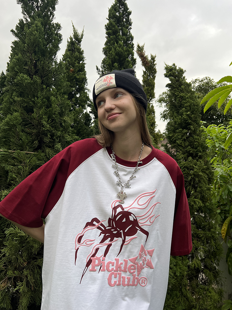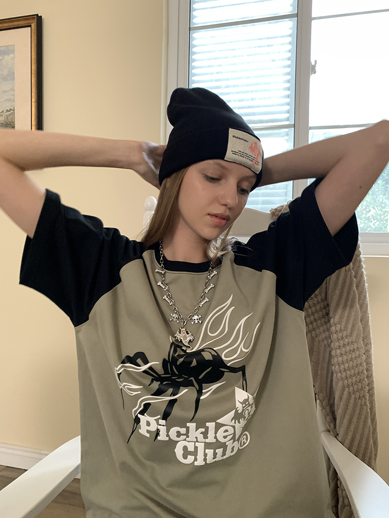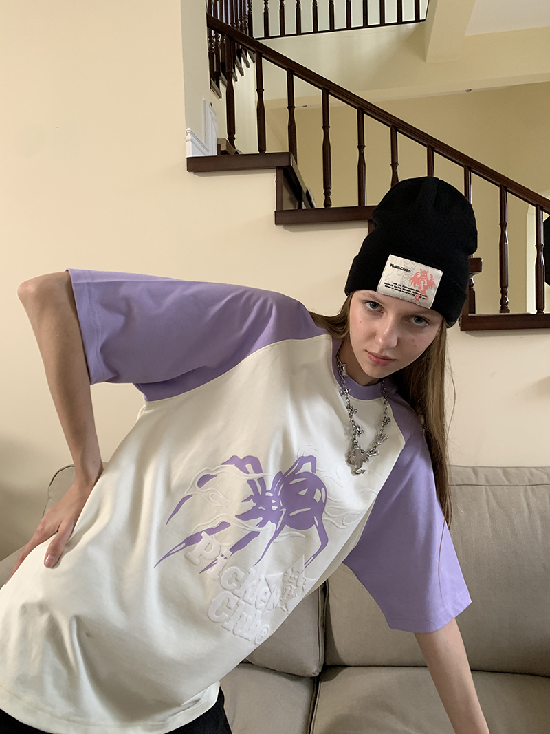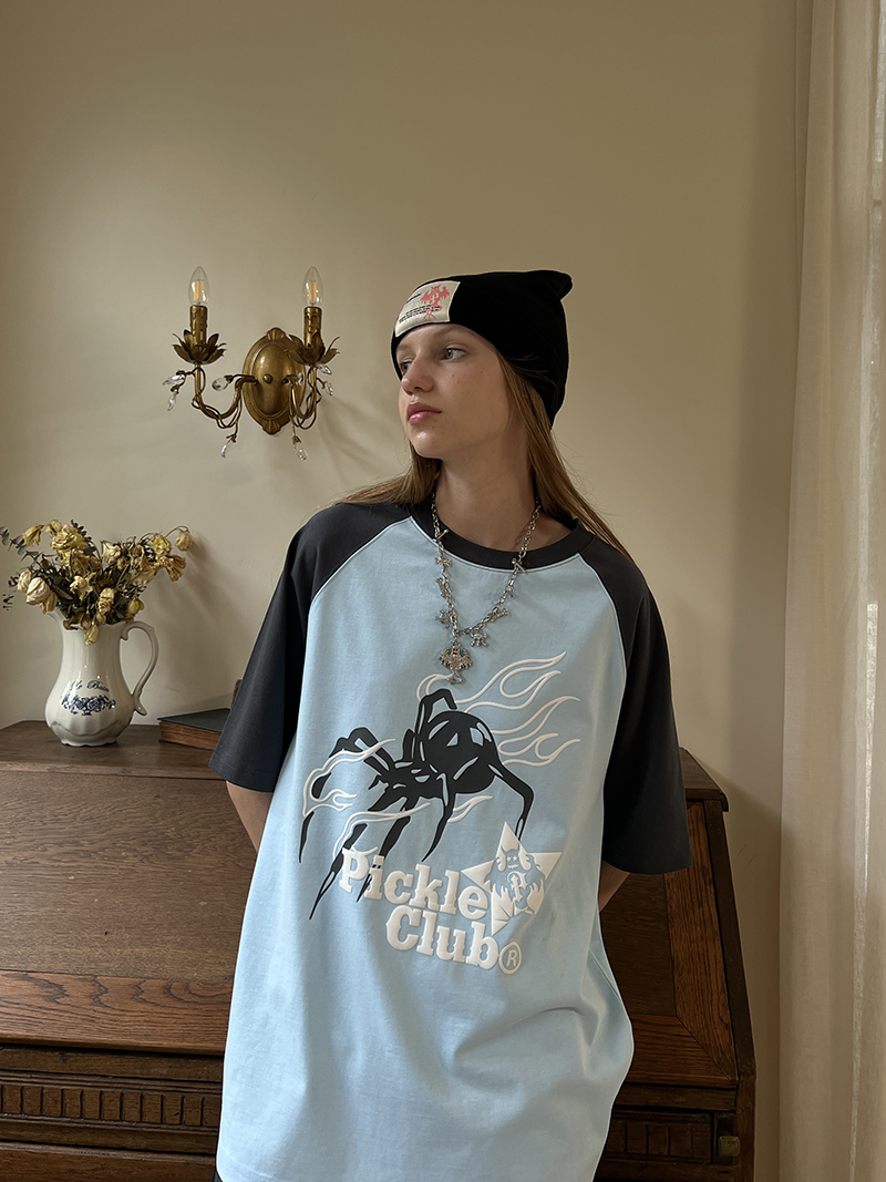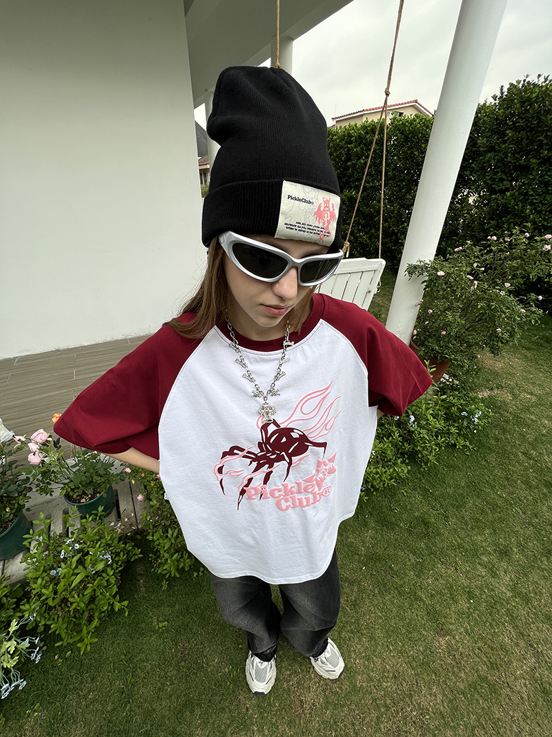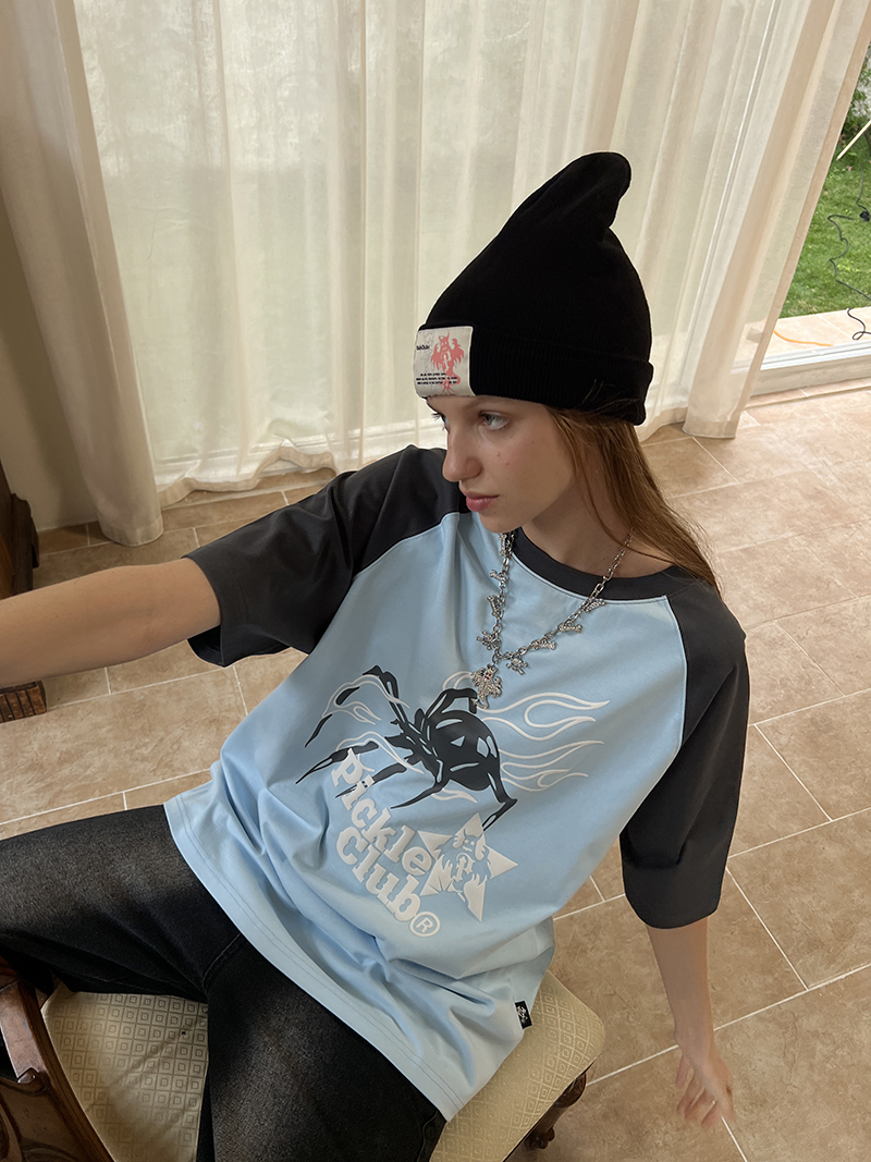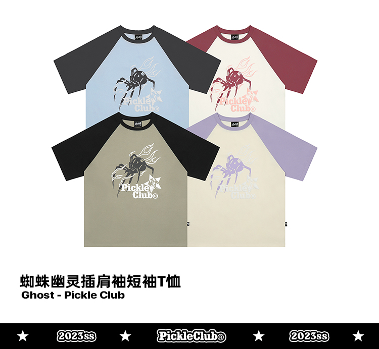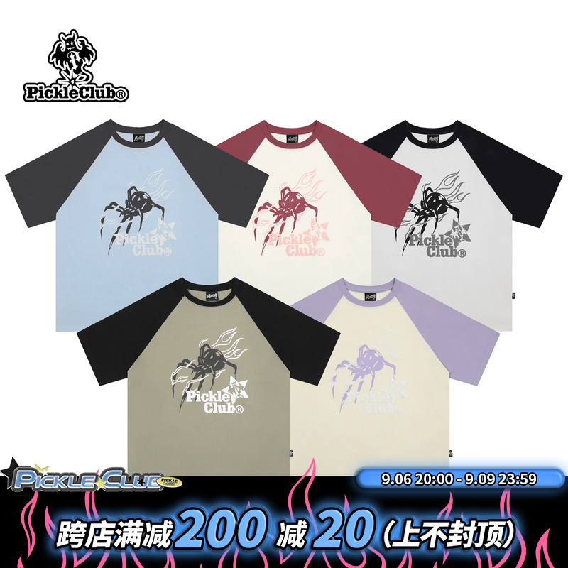 樑拌泡菜 PC蜘蛛幽靈印花情侶插肩袖短袖T恤女寬鬆多巴胺女孩穿搭