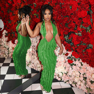JY23004性感破烂风镂空挂脖包臀裙欧美辣妹修身露背聚会派对长裙