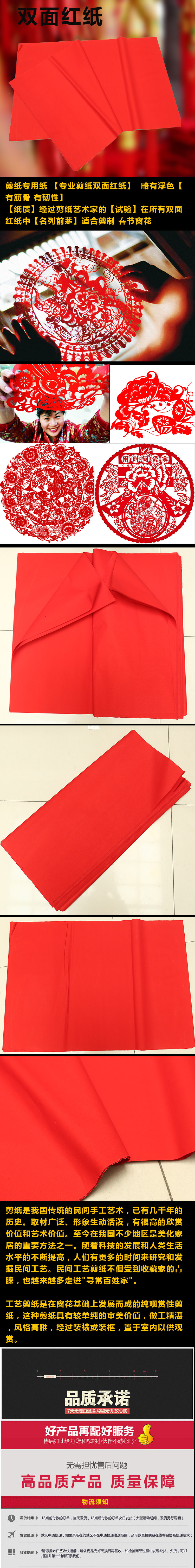 纸的特性;双面大红纸,颜色正  色泽鲜艳 因为是染色颜色的鲜艳度很占优势,比其它的双面红纸张颜色要正包括价钱昂贵的宣纸也是无法比较的, 手摸会有点染色是正常现象