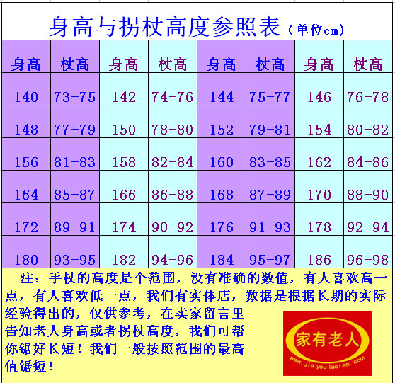 四:高度都在90-94cm之间,备注老人大约身高或拐杖高度,我们为你锯好长短,我们一般按照略长一点点尺寸锯短的,尽管放心尤其锯到有疙瘩的地方,脚套不容易套,你不好打磨,我们有专业工具。