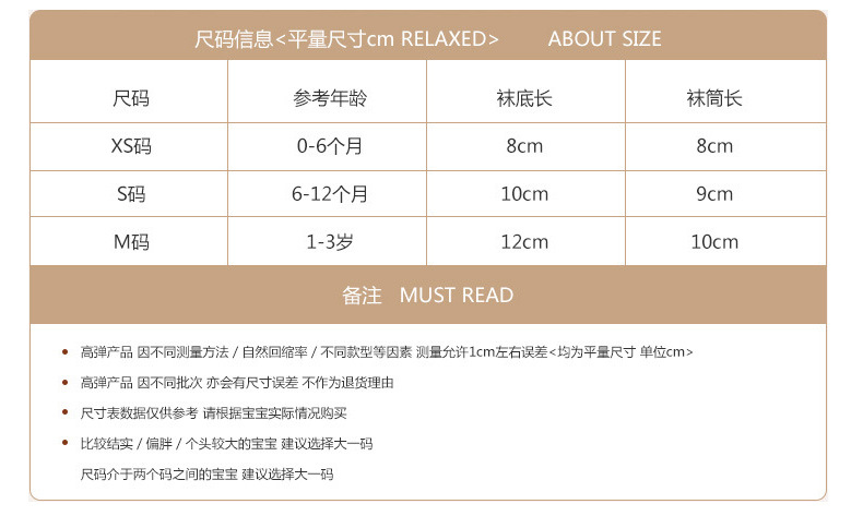 童袜尺码 XS码0-6个月,S码6-12个月,M码1-3岁