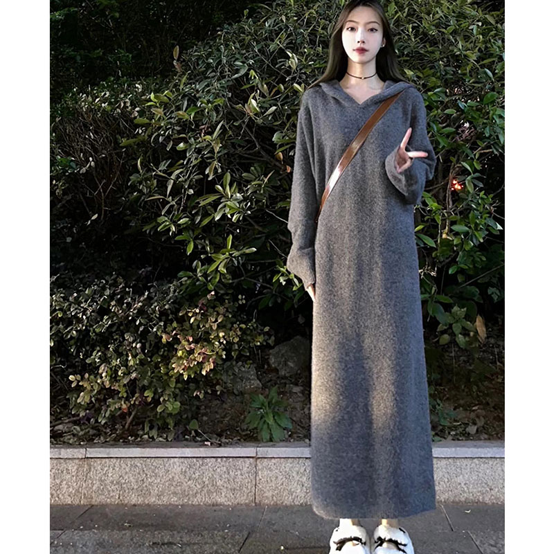 2023秋冬季新款休閒寬鬆顯瘦慵懶針織打底內搭連帽毛衣洋裝子女